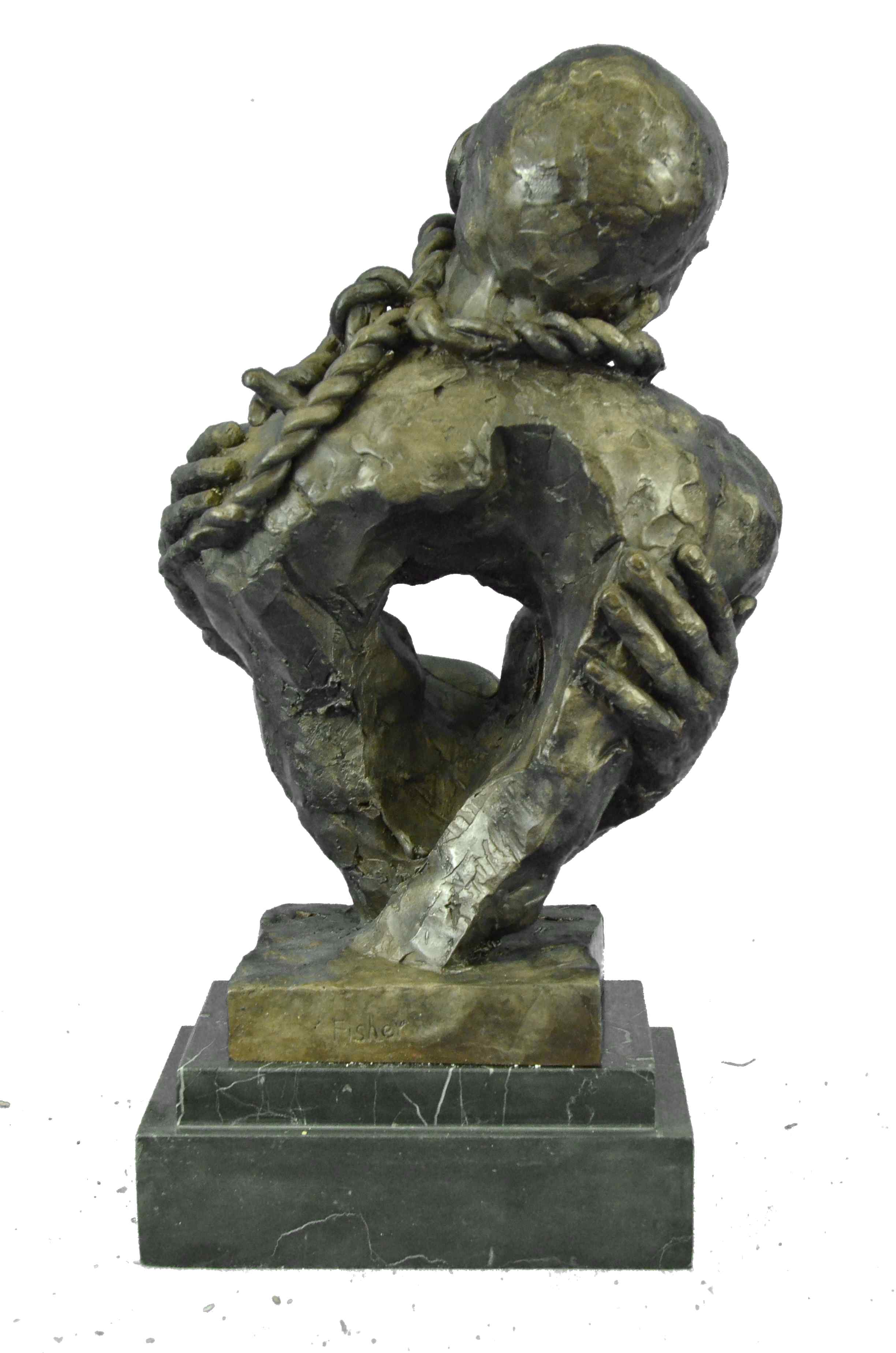 Man In Bondage  This bronze statue by American Artist Fisher is handmade and cast in the traditional Lost Wax Casting Process. This insures a quality bronze sculpture that may be passed down from generation to generation. Standing close to 14" high, this is a bronze statue that will be very visible in any room and sure to be an eye catcher. Whether inside or outside, this bronze sculpture will be a great addition to any home. Although this bronze portrays bondage in a visible manner, sometimes it is not so visible.Original or Reproduction: Original