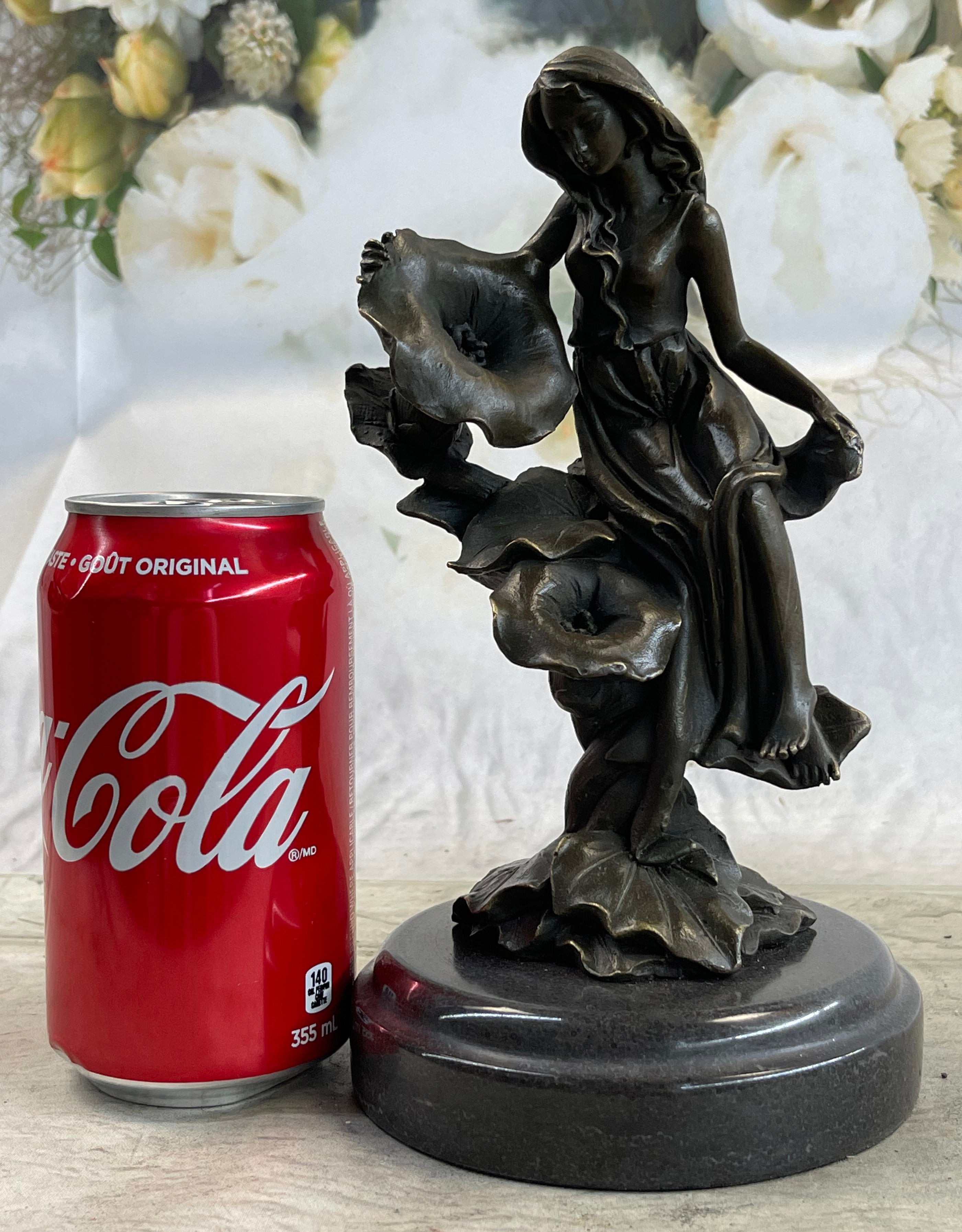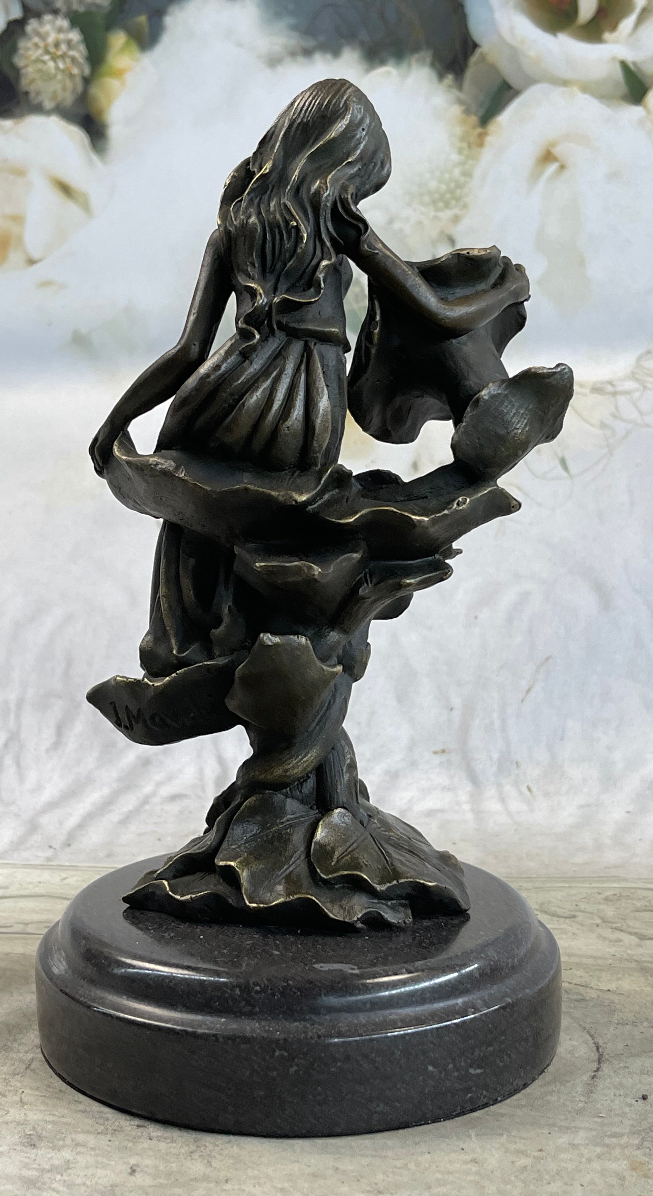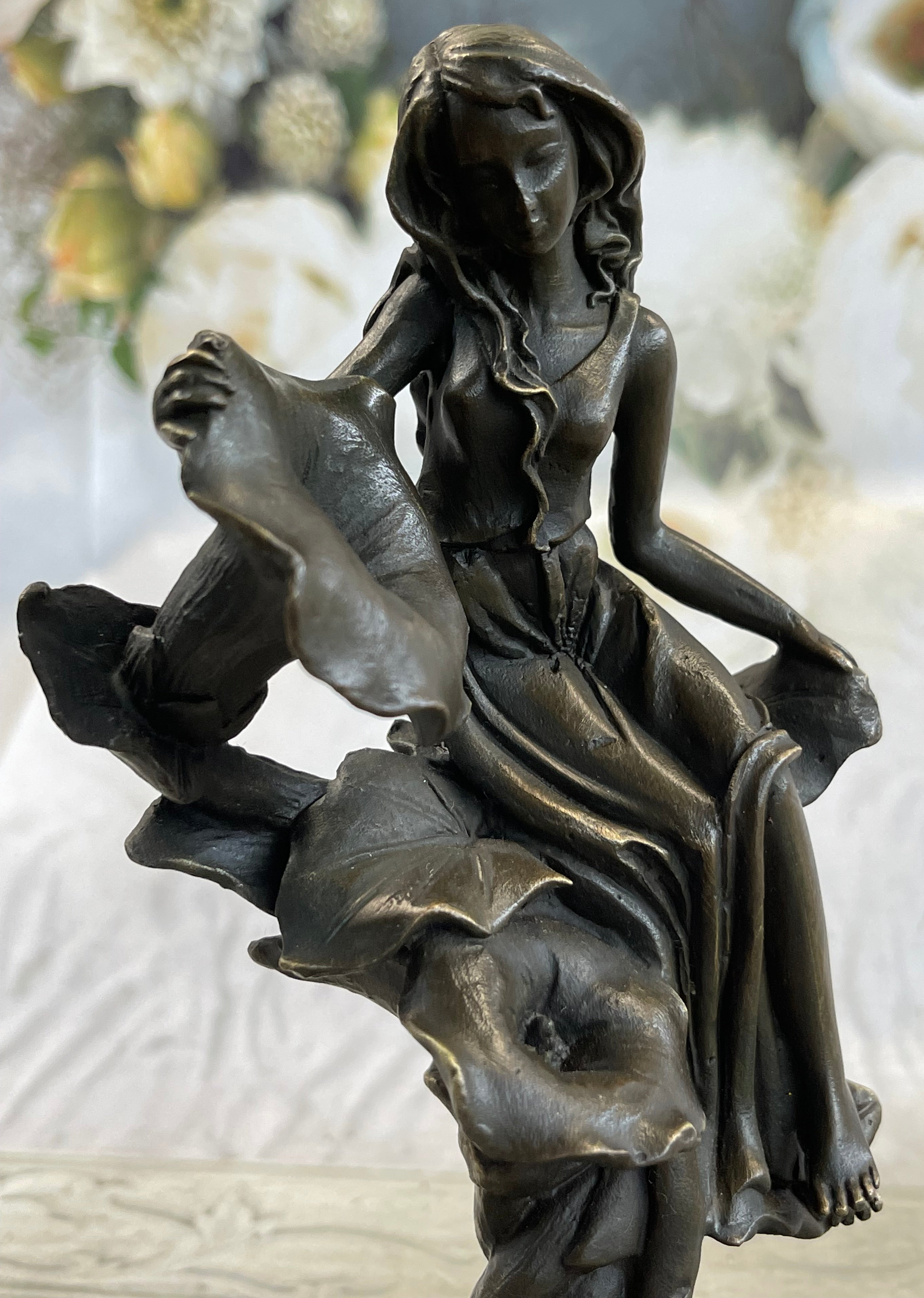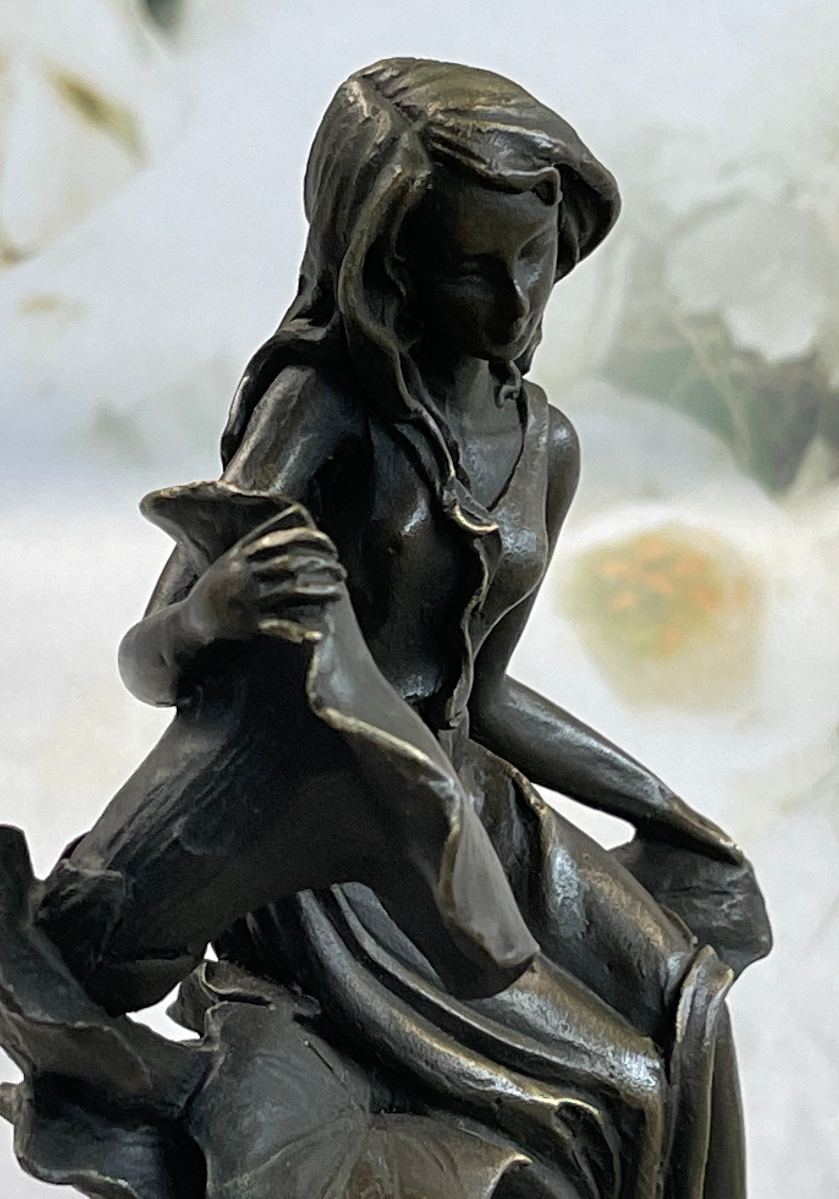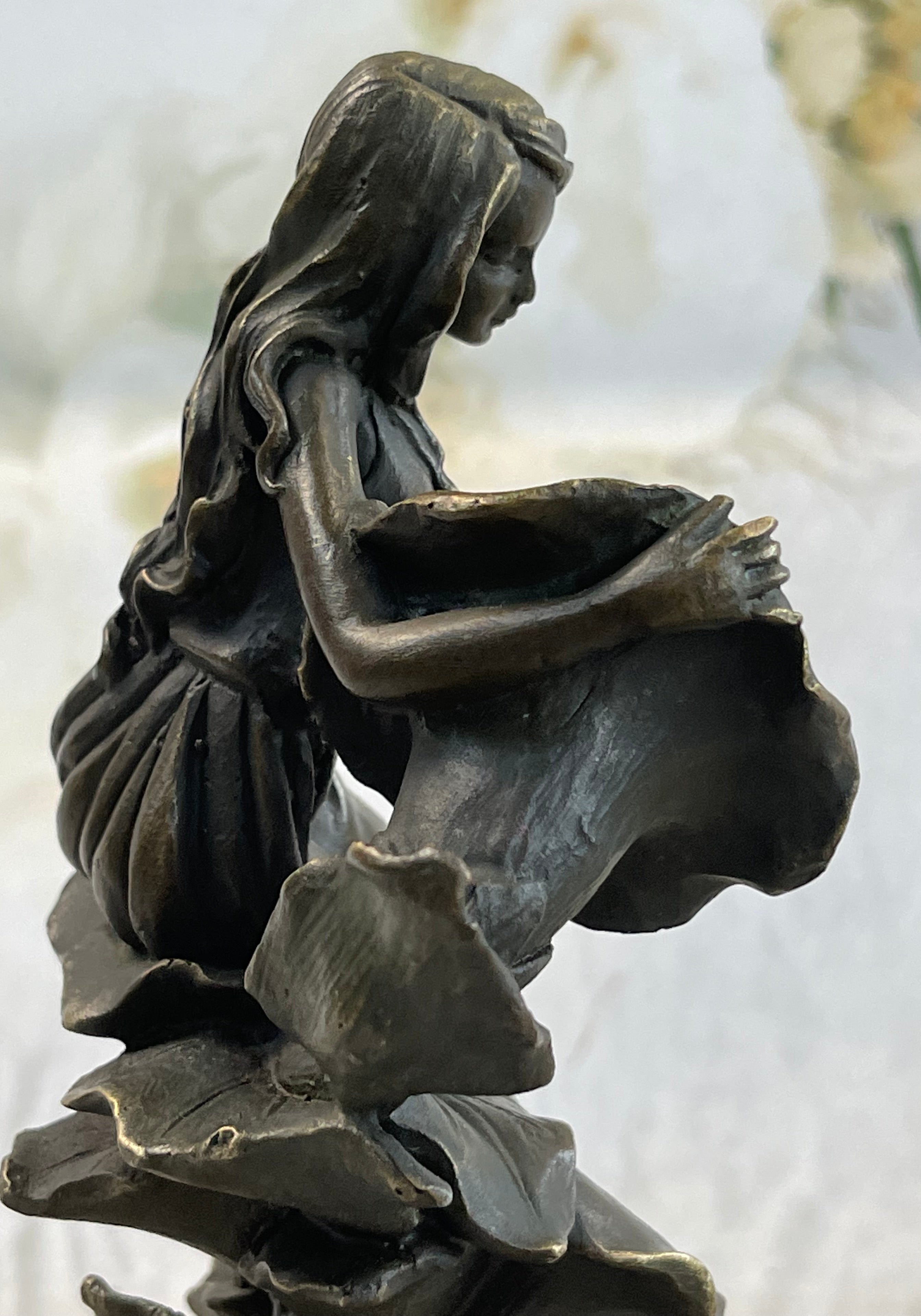 Girl Resting on Flower Bronze Sculpture Statue Figure Fantasy Decor 9" x 5"