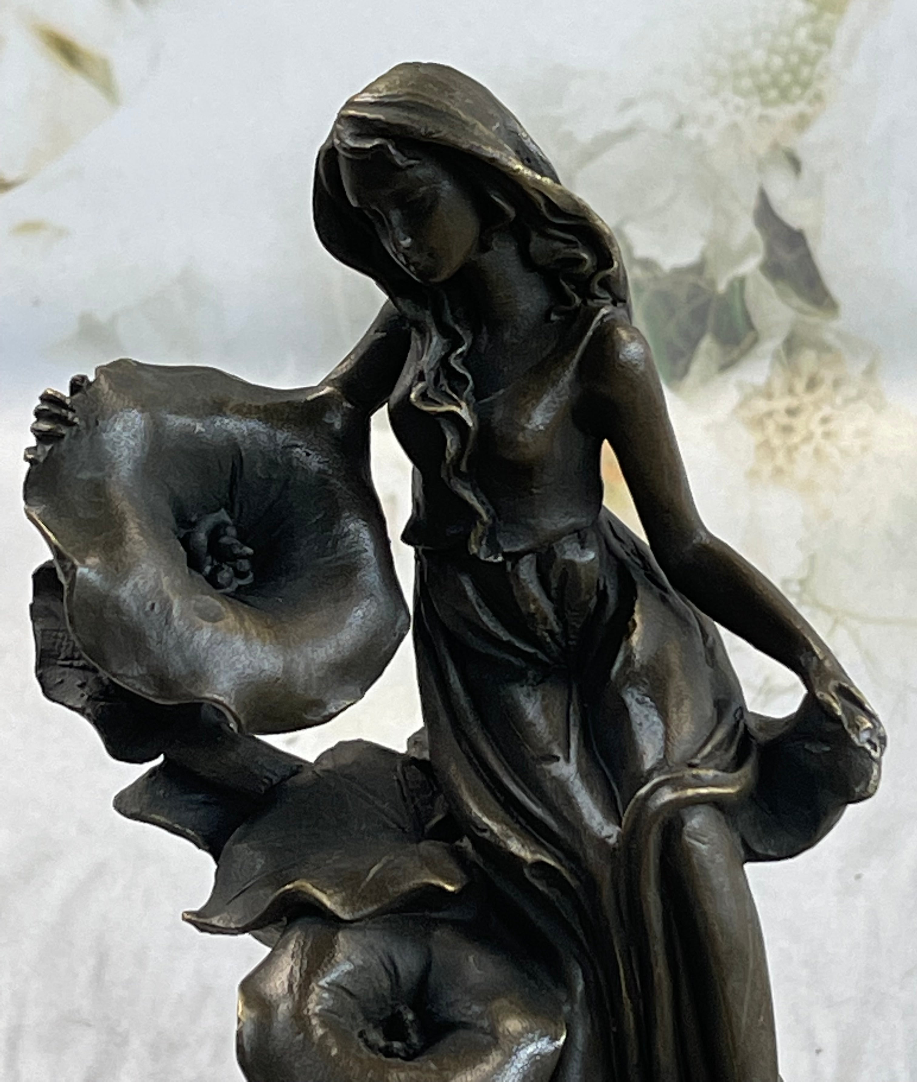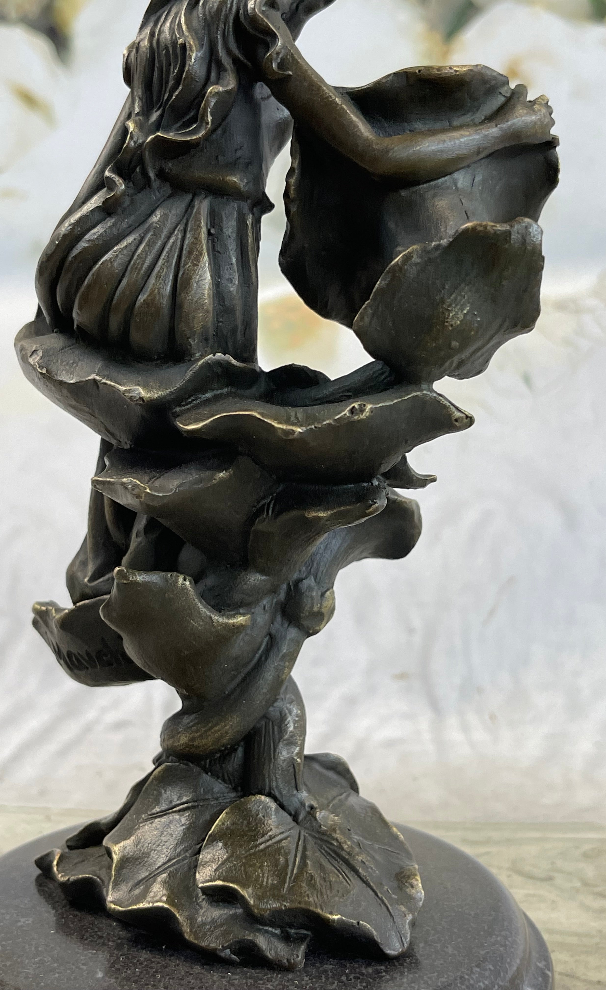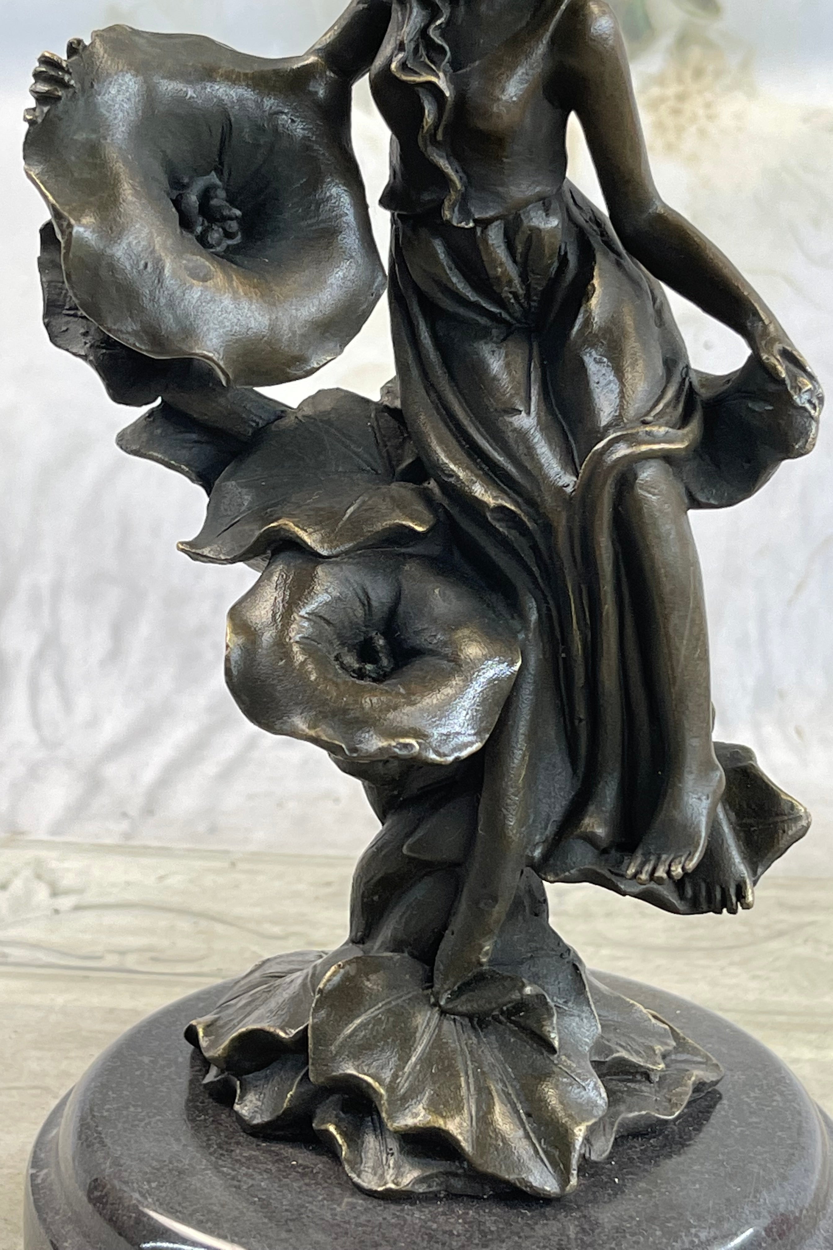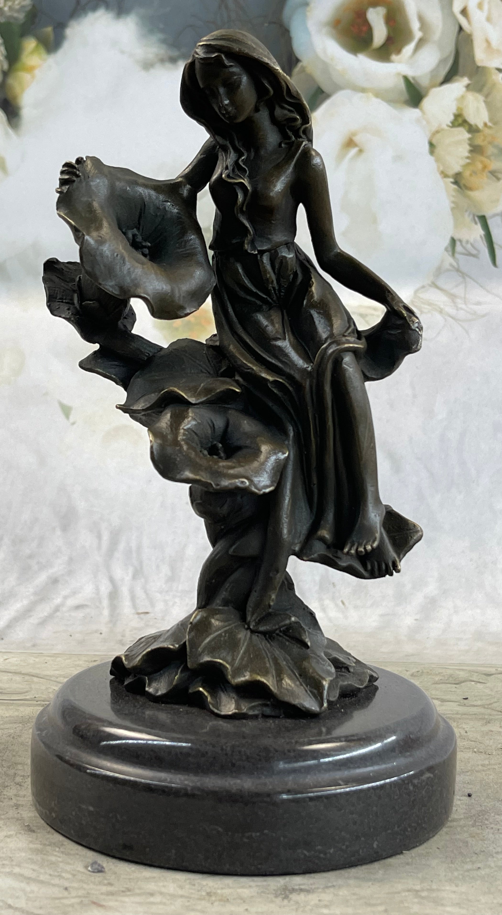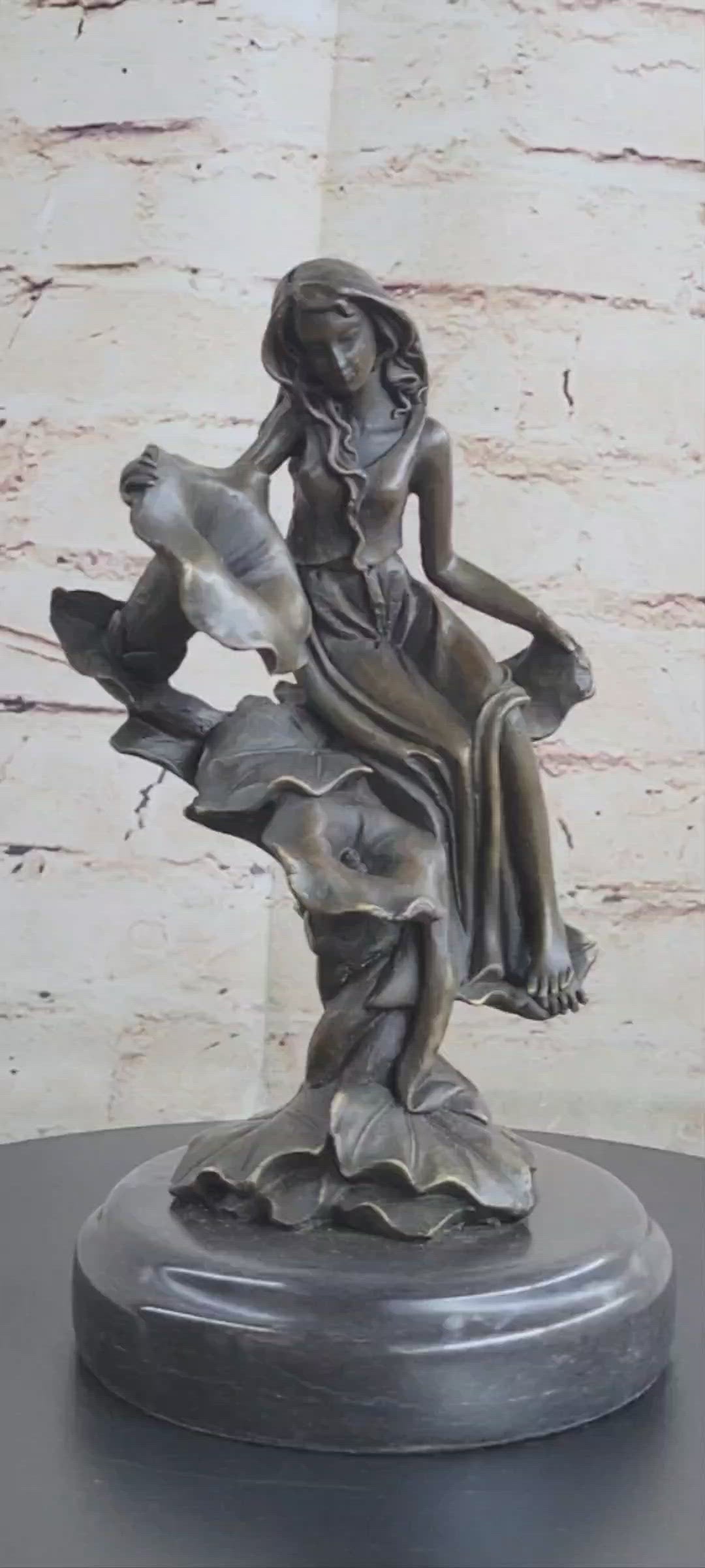 Girl Resting on Flower Bronze Sculpture Statue Figure Fantasy Decor 9" x 5"