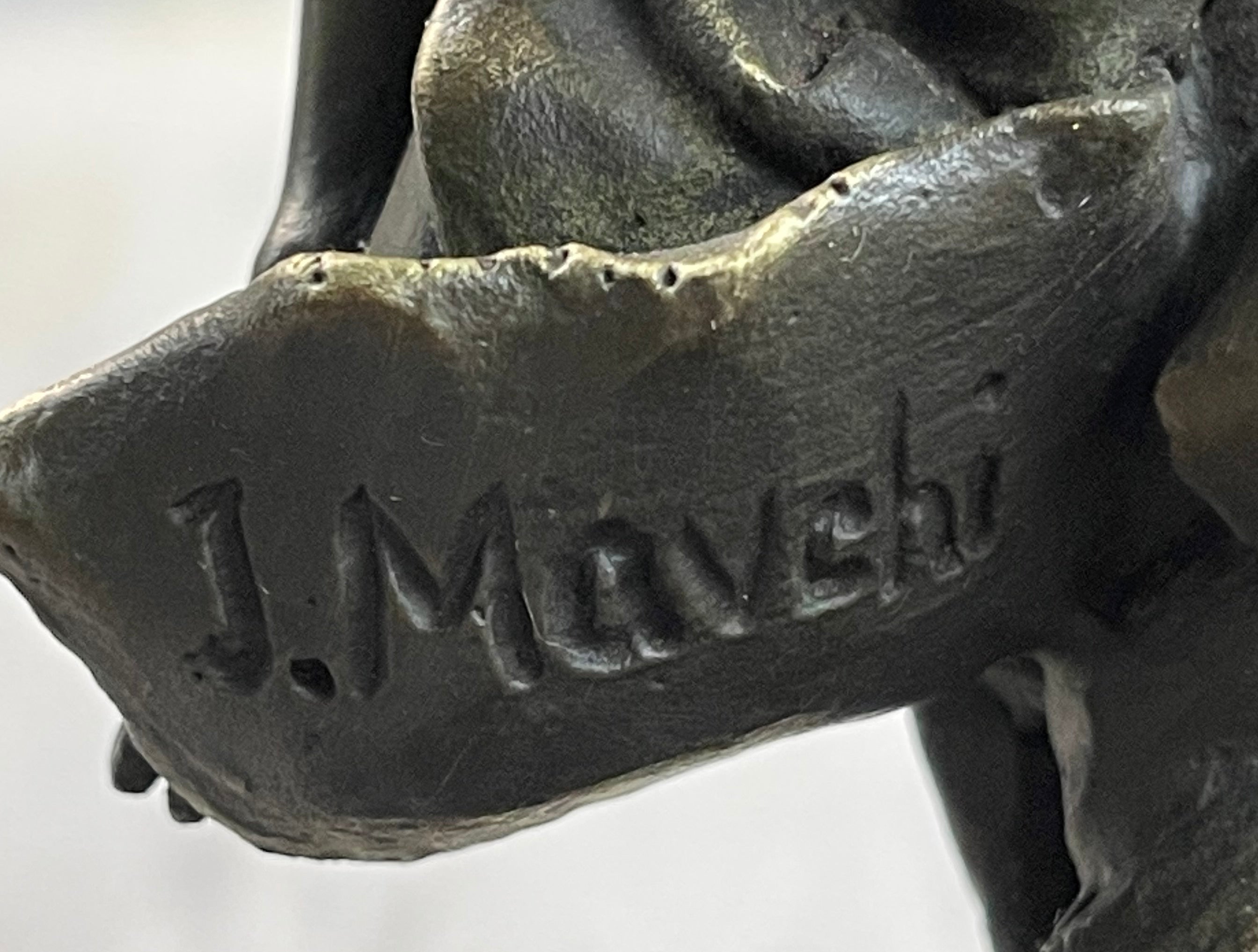 Mounted on a marble base, this piece achieves a sense of stability and refinement, elevating the sculpture as a timeless and elegant addition to any space. Signed by the artist J. Mavchi, the sculpture bears the mark of authenticity and craftsmanship. As a serene and dreamlike reminder to savor the moments of beauty amidst the hustle of everyday life, this sculpture serves as a poignant and visually captivating work of art.Bronze Dimensions with Marble Base: Height 9" X Width 5"