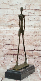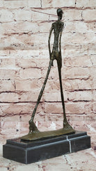With a dark brown patina that enhances its depth and texture, the sculpture stands gracefully on a black marble base, adding an elegant contrast. The elongated, fluid form of the walking figure evokes a sense of motion, resilience, and progress, making it an ideal decorative piece for offices, galleries, or modern living spaces.