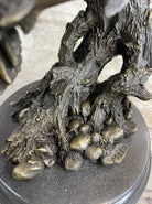 The sculpture skillfully portrays the bear's wet fur cascading down its neck, blending abstractly into the trunk of a tree, symbolizing its seamless integration into its natural habitat. This artistic representation emphasizes the bear's deep connection with nature and its vital role within the larger ecosystem. The bear's presence is further enhanced by the symbolic elements embedded in the sculpture, representing primal power, motherhood, cunning, healing, gentle strength, dreaming, sovereignty, intuition, instinct, nurture, and protection. Each detail contributes to a profound representation of the bear's symbolic importance and its place in ancient beliefs.