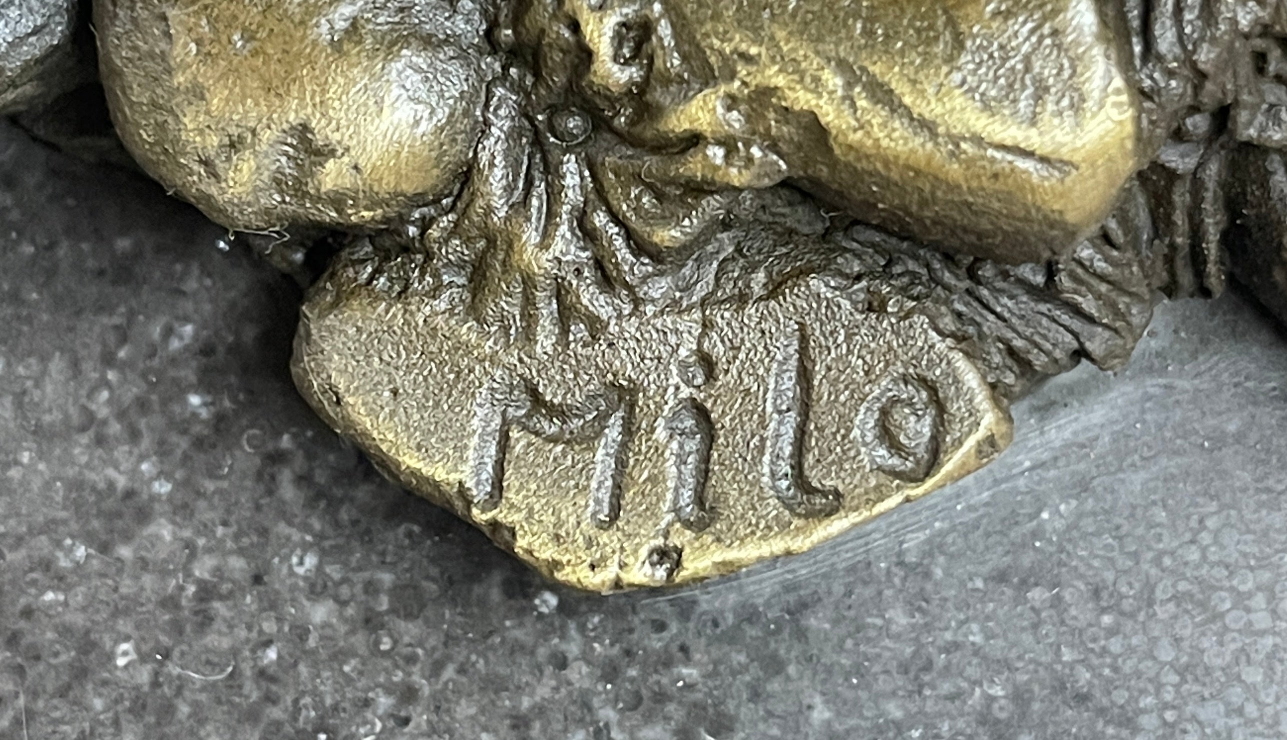 Crafted with meticulous care, this handmade bronze sculpture was created using the ancient method of lost-wax casting, ensuring the highest level of craftsmanship and detail. The sculpture is stained with a brown patina finish, preserving its beauty and ensuring it remains a timeless piece for generations to come. Mounted elegantly upon a black marble base, the sculpture exudes sophistication and stability. It proudly bears the European Finery Stamp of quality, affirming its exceptional craftsmanship and adherence to the highest standards. The base also features the signature of the renowned artist, Milo, further enhancing its collectible and prestigious nature.