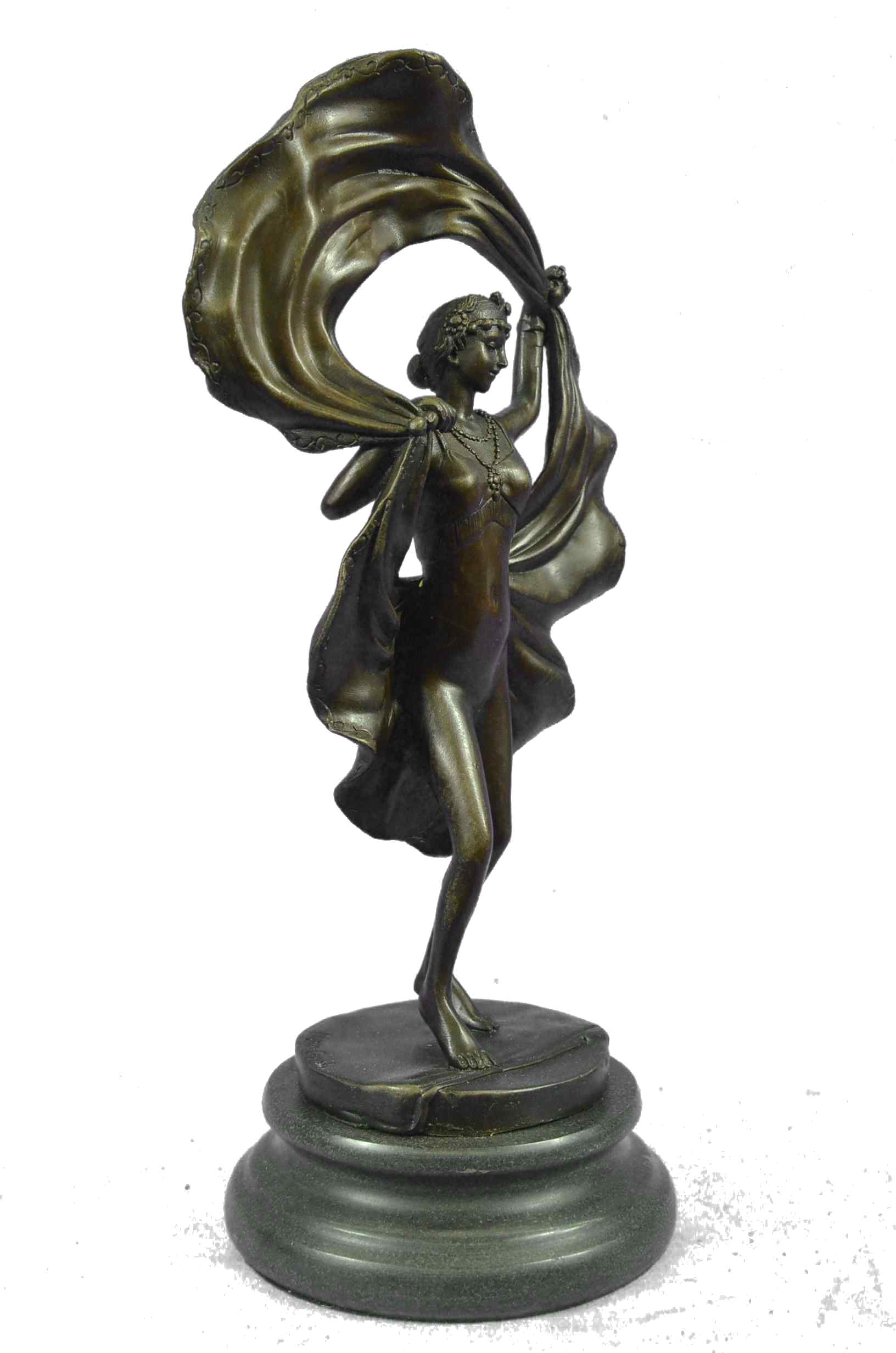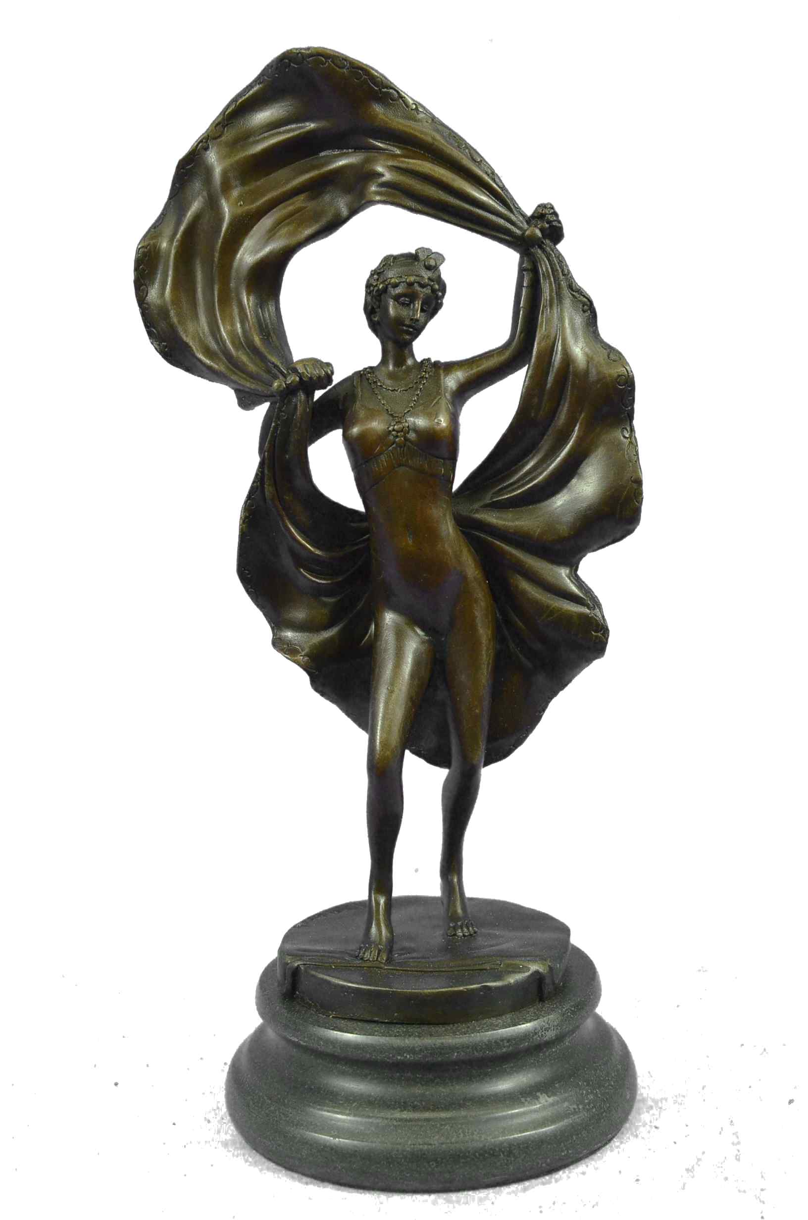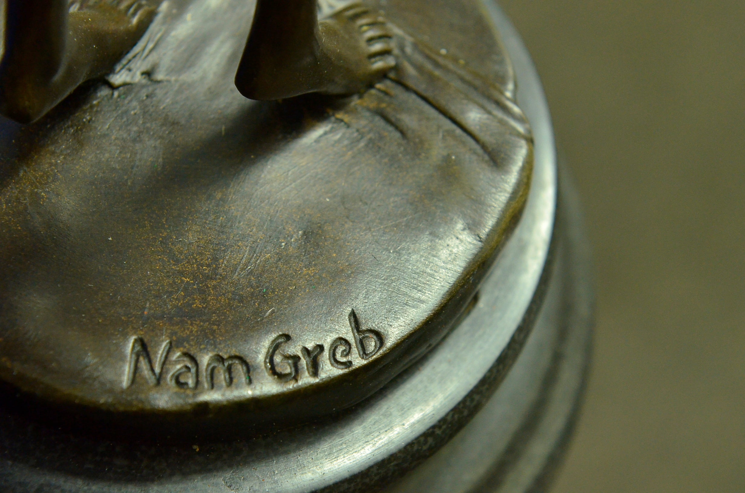 An amusing erotic bronze figure of a young dancer with fine Hot painted color and good detail, the skirt hinged to reveal her naked body, signed `Nam Greb` to the base and raised on a round black marble plinthBronze Dimensions with Marble Base:Height 12" x Width 6"