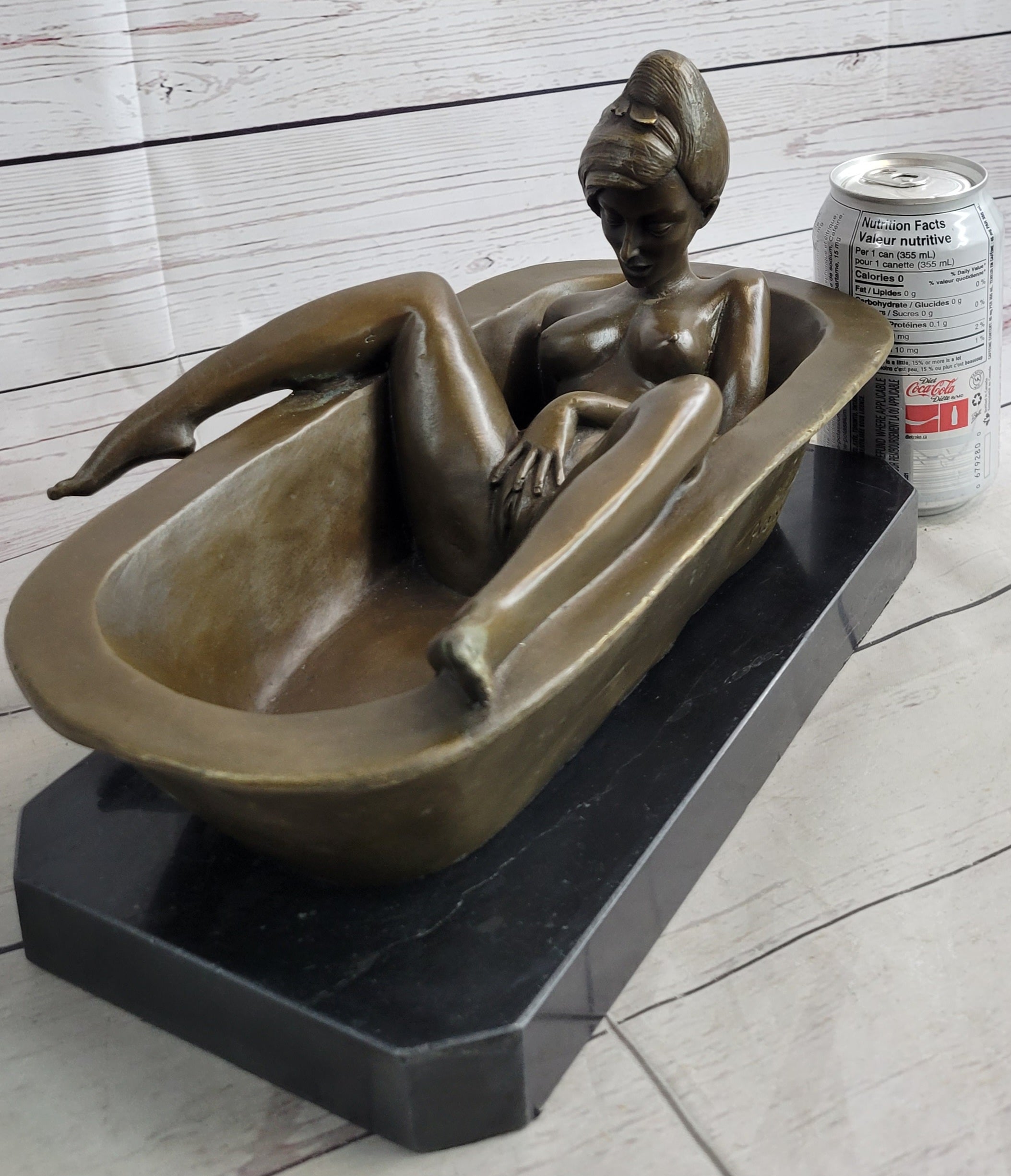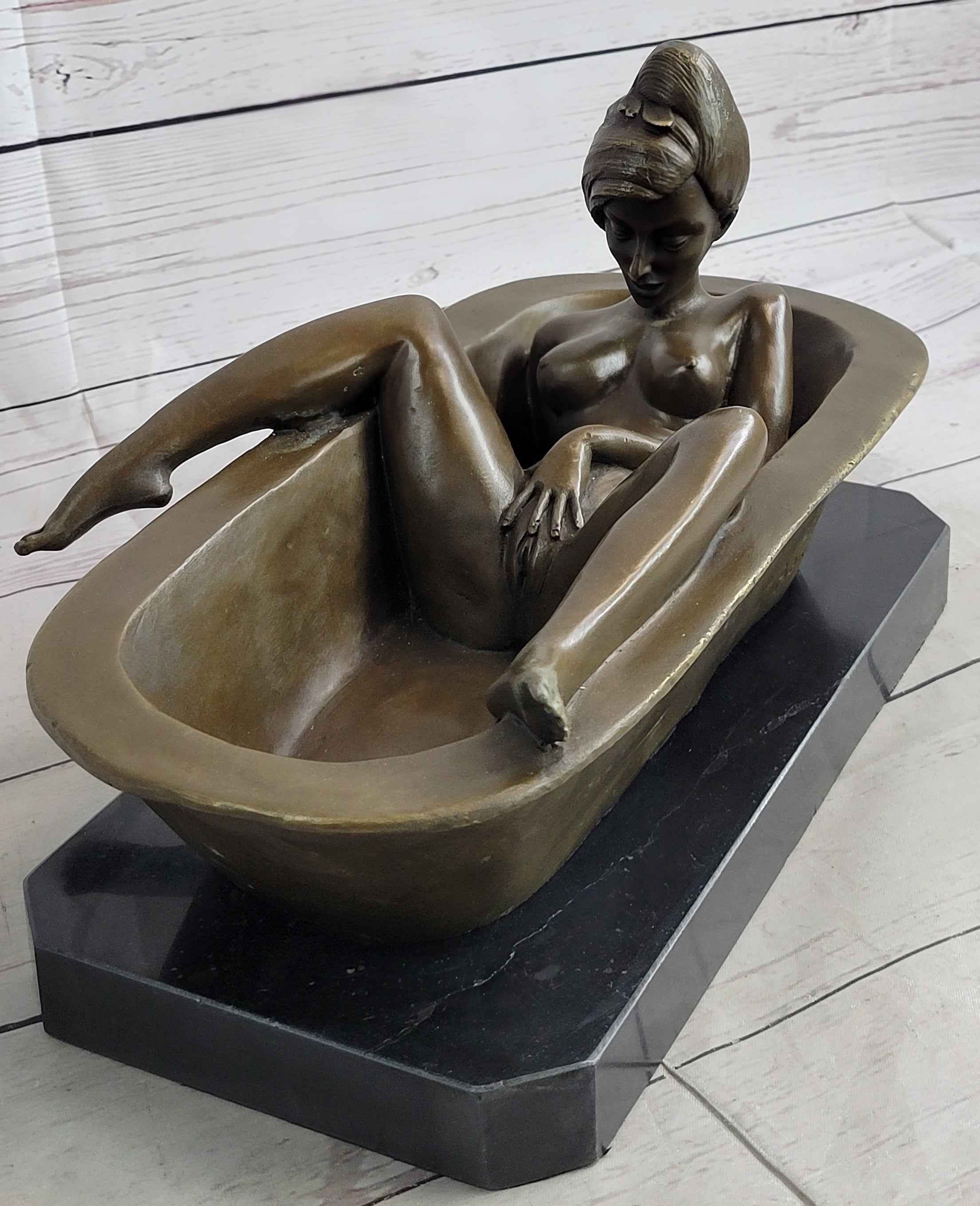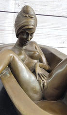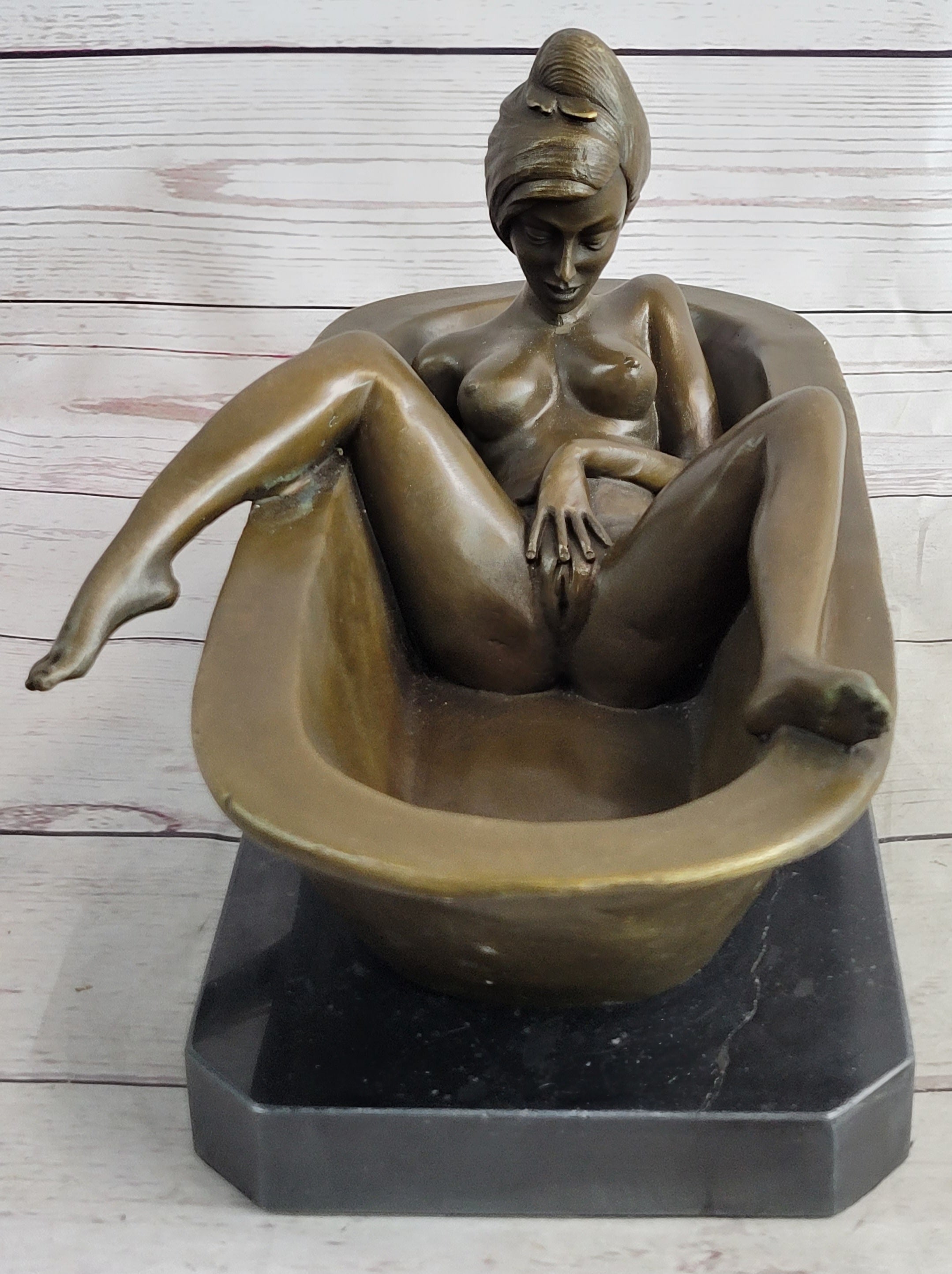 Erotic Art Nude Girl Masturbating in Bath Tub Bronze Sculpture Statue Marble Base 13" x 7"
