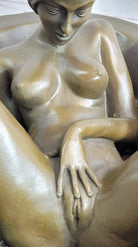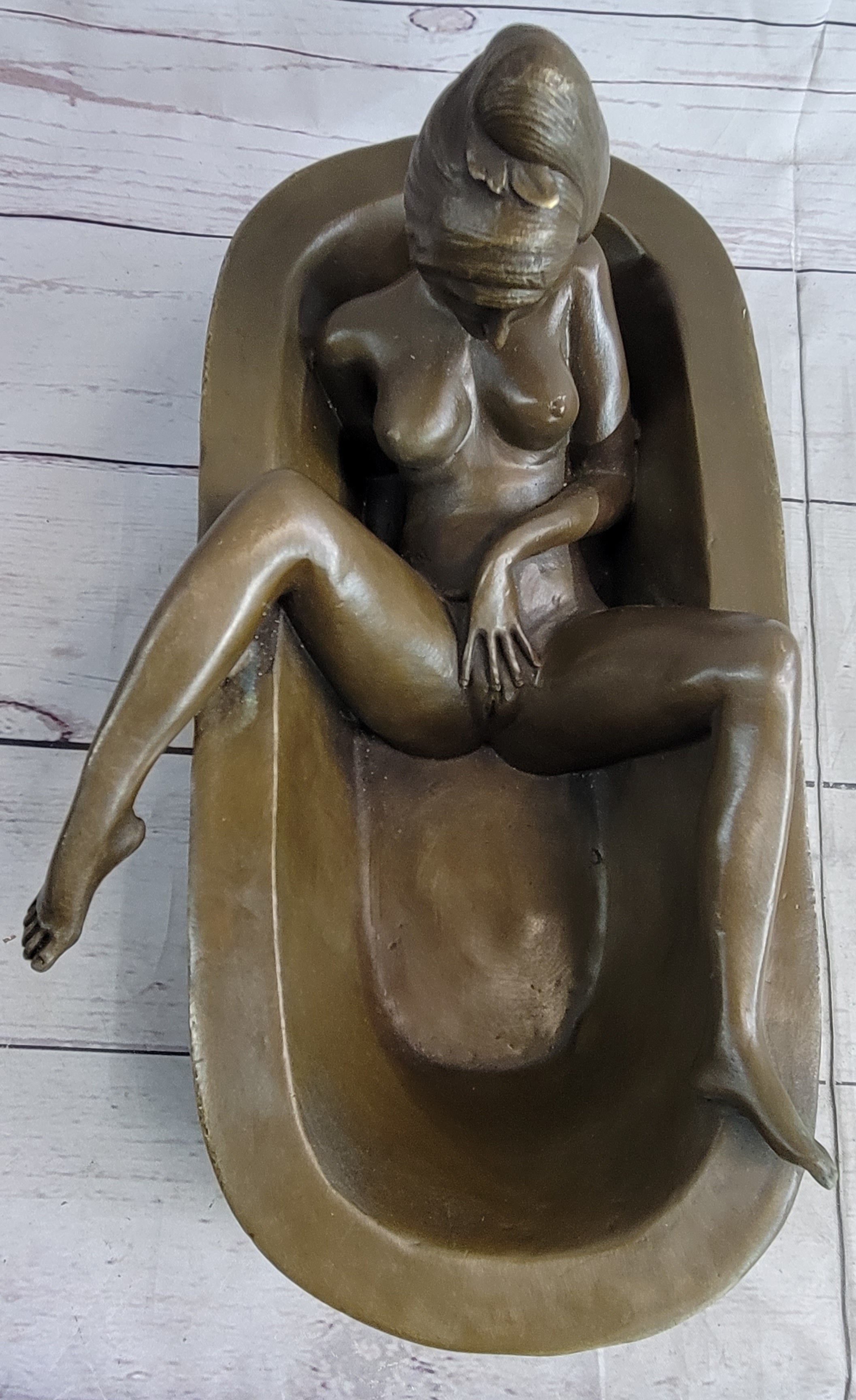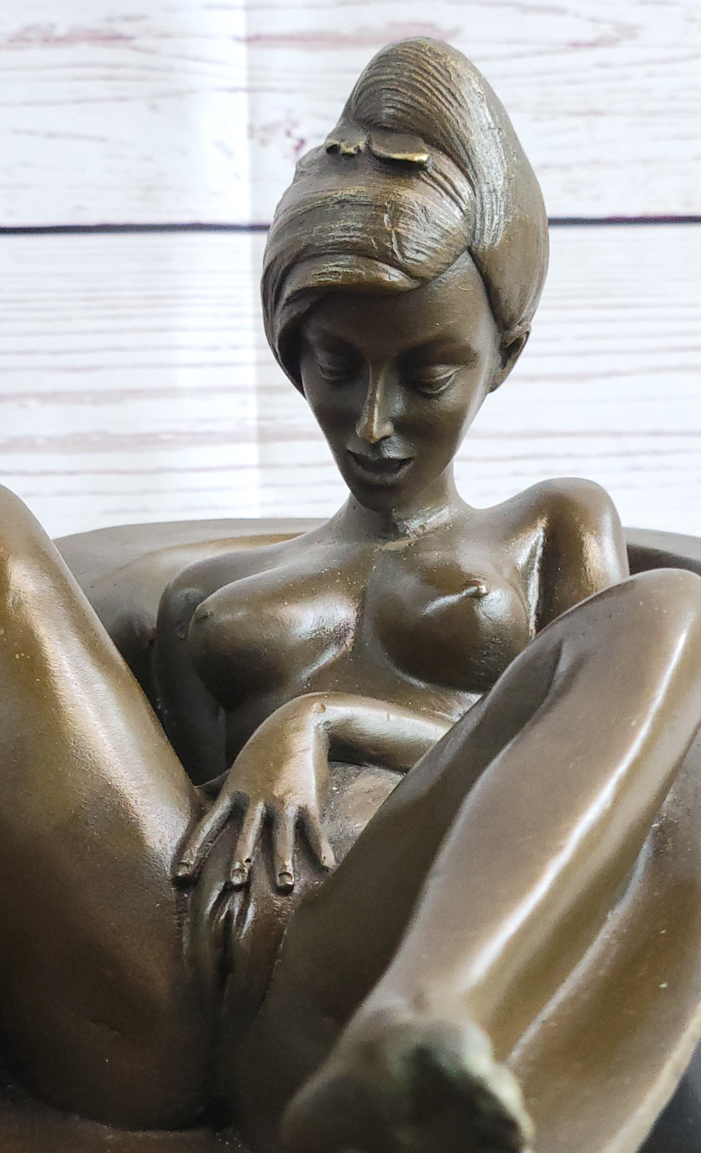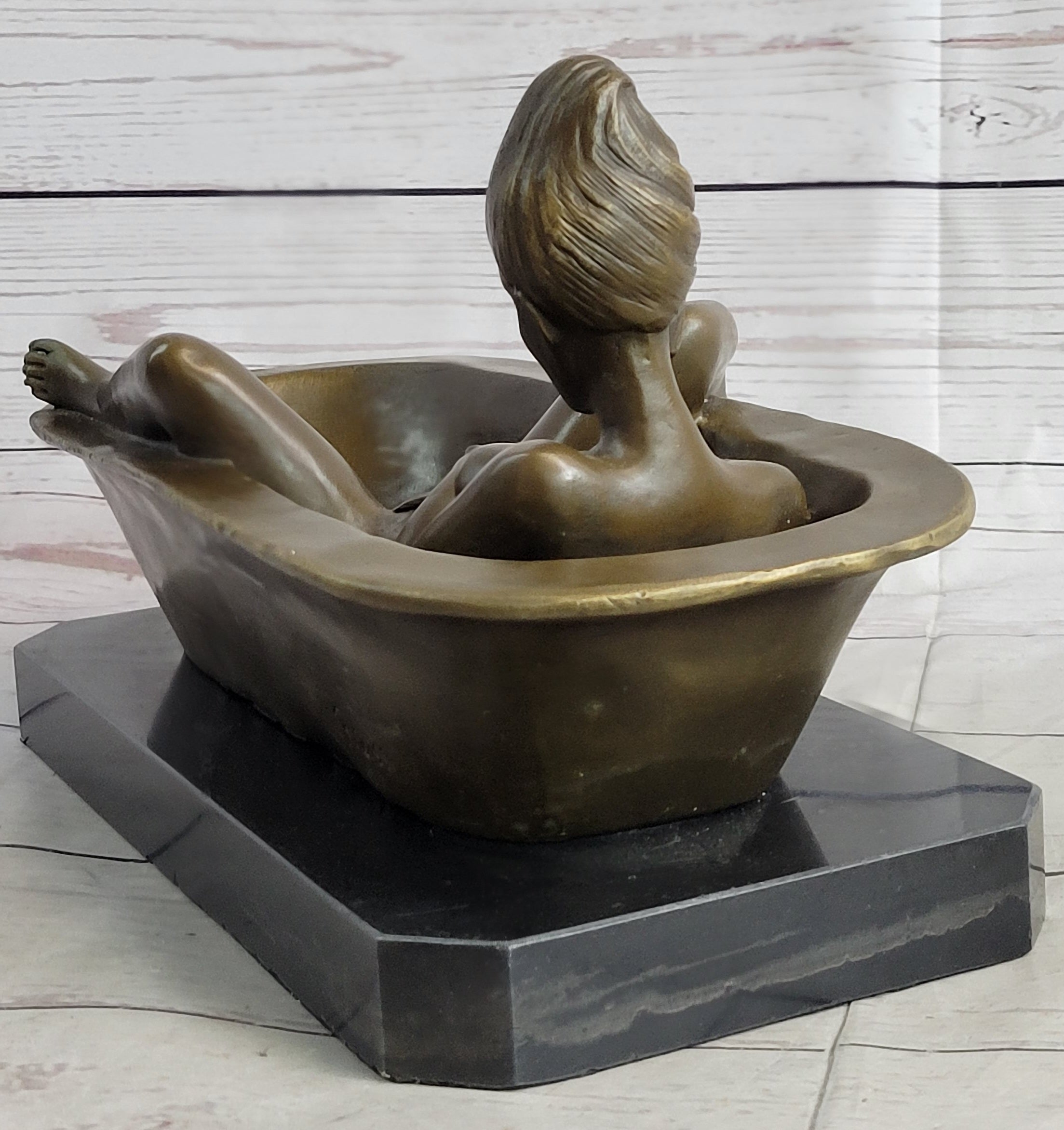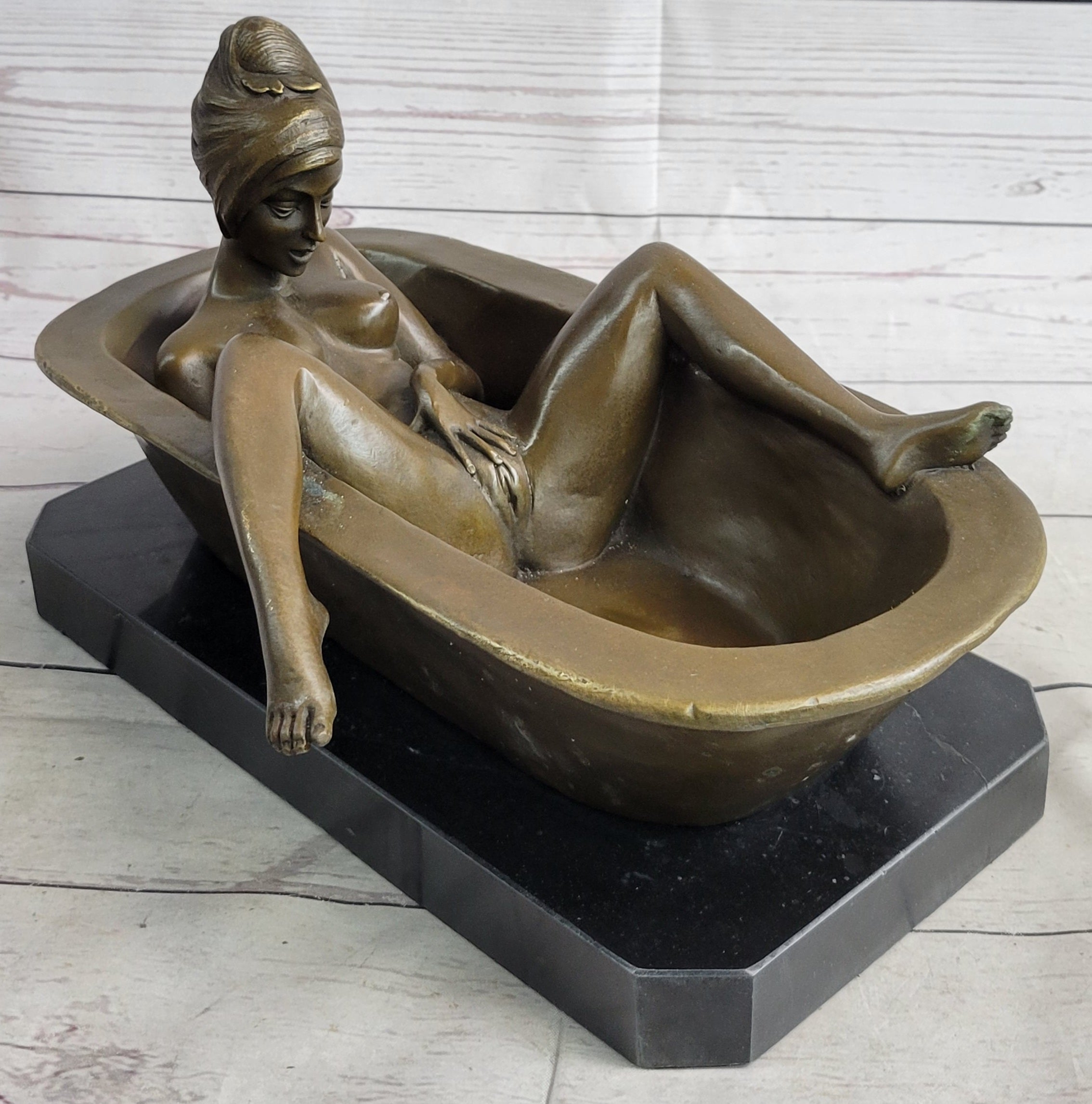 Erotic Art Nude Girl Masturbating in Bath Tub Bronze Sculpture Statue Marble Base 13" x 7"