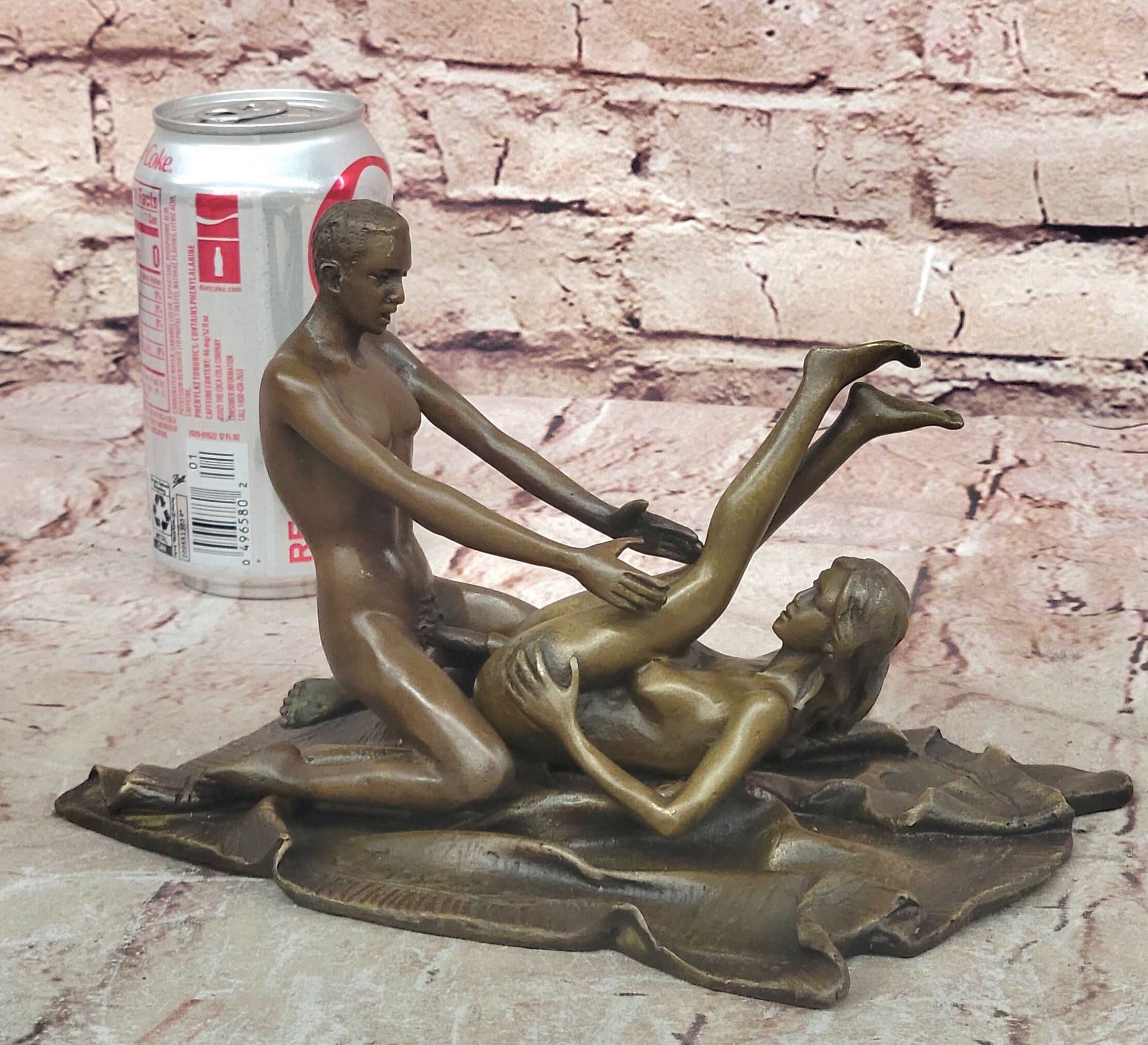 This captivating bronze figurine portrays an intimate and passionate embrace between a male and female. The couple is depicted in a sensuous pose, with the woman lying on her back and arching her body towards her partner, while he passionately engages with her from the front. The sculpture exudes a strong sense of desire and connection, emphasizing the beauty of human intimacy. Although the subject matter may be provocative, the craftsmanship and attention to detail in this bronze sculpture are truly remarkable.