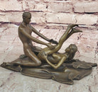 Crafted with meticulous precision using the lost wax method, this handmade bronze sculpture showcases the artist's mastery in capturing the human form. The intricate details and lifelike expressions on the faces of the couple evoke a sense of pleasure and enjoyment. Despite its erotic nature, this sculpture is tastefully executed, focusing on the beauty of the human body and the emotions shared between the two figures. The brown patina finish adds depth and dimension to the artwork, enhancing its overall appeal.