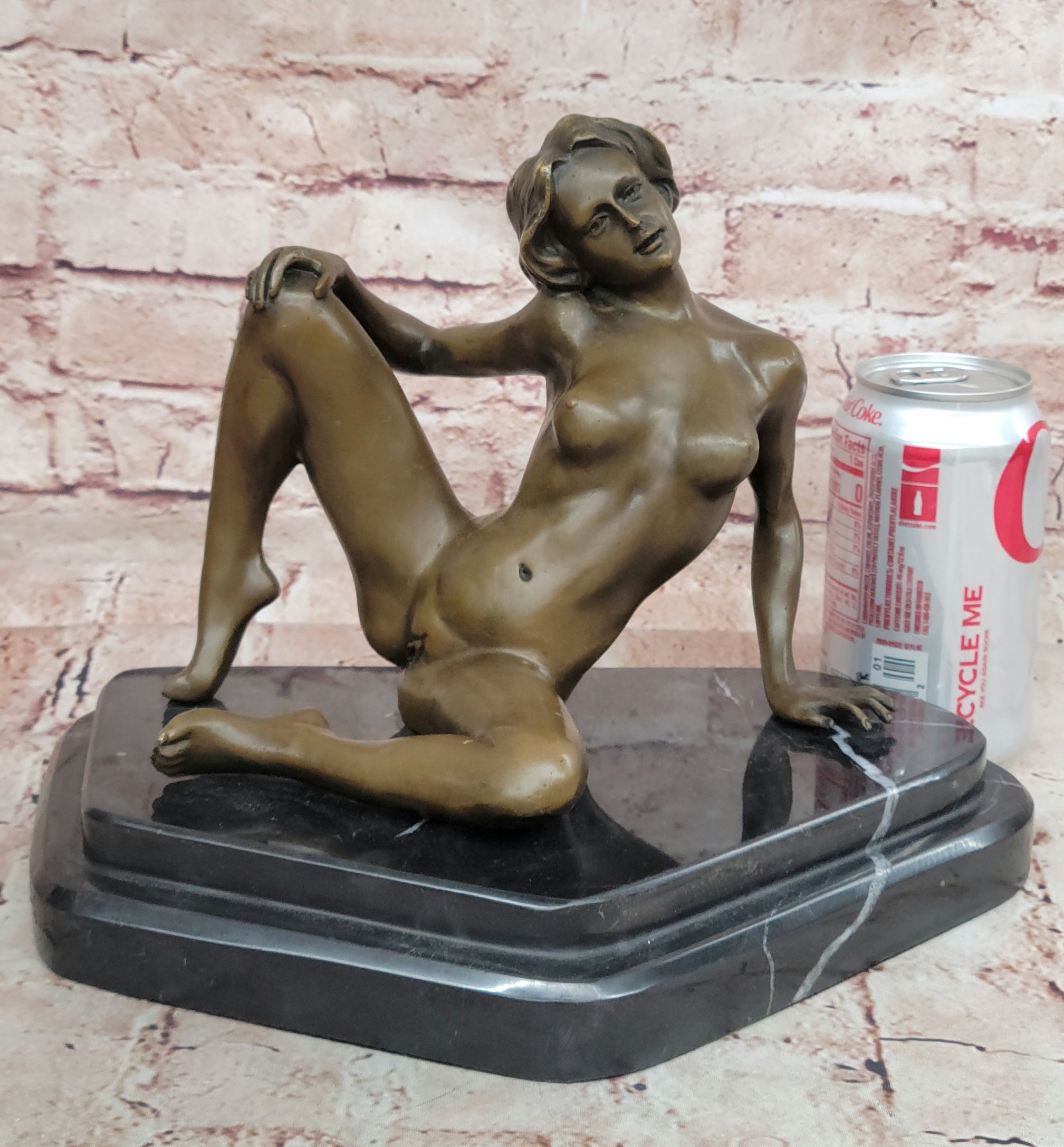 Presenting an intriguing bronze sculpture that celebrates the uninhibited exploration of female sensuality. This provocative piece depicts a woman lying on her back, gracefully flexing her legs far behind her head. With unabashed confidence, she uses both hands to reveal the captivating mystery of a woman's center of pleasure. This sculpture seeks to demystify and celebrate the sexual nature of a woman's body, showcasing the beauty and power of her femininity. It invites viewers to embrace the journey of self-exploration and self-discovery in the realm of sexuality. With its evocative form and bold expression, this erotic sculpture serves as a testament to the uninhibited exploration of pleasure and the celebration of female sensuality. Meticulously crafted using the revered lost-wax casting method, this sculpture is fashioned from 100% bronze. Its captivating presence is enhanced by a rich brown patina finish, adding depth and allure to every curve and contour. Resting upon a sleek black marble base, it exudes elegance and complements the artwork beautifully. The sculpture proudly bears the signature of the artist, Nino Oliviono, guaranteeing its authenticity and craftsmanship. Embrace the boldness and raw beauty of this bronze sculpture, a captivating celebration of femininity and self-exploration. Whether displayed as a statement piece in an art collection or as a thought-provoking centerpiece, it sparks conversations and ignites the imagination. Delve into the realms of sensuality and embrace the empowering journey that this extraordinary sculpture represents.