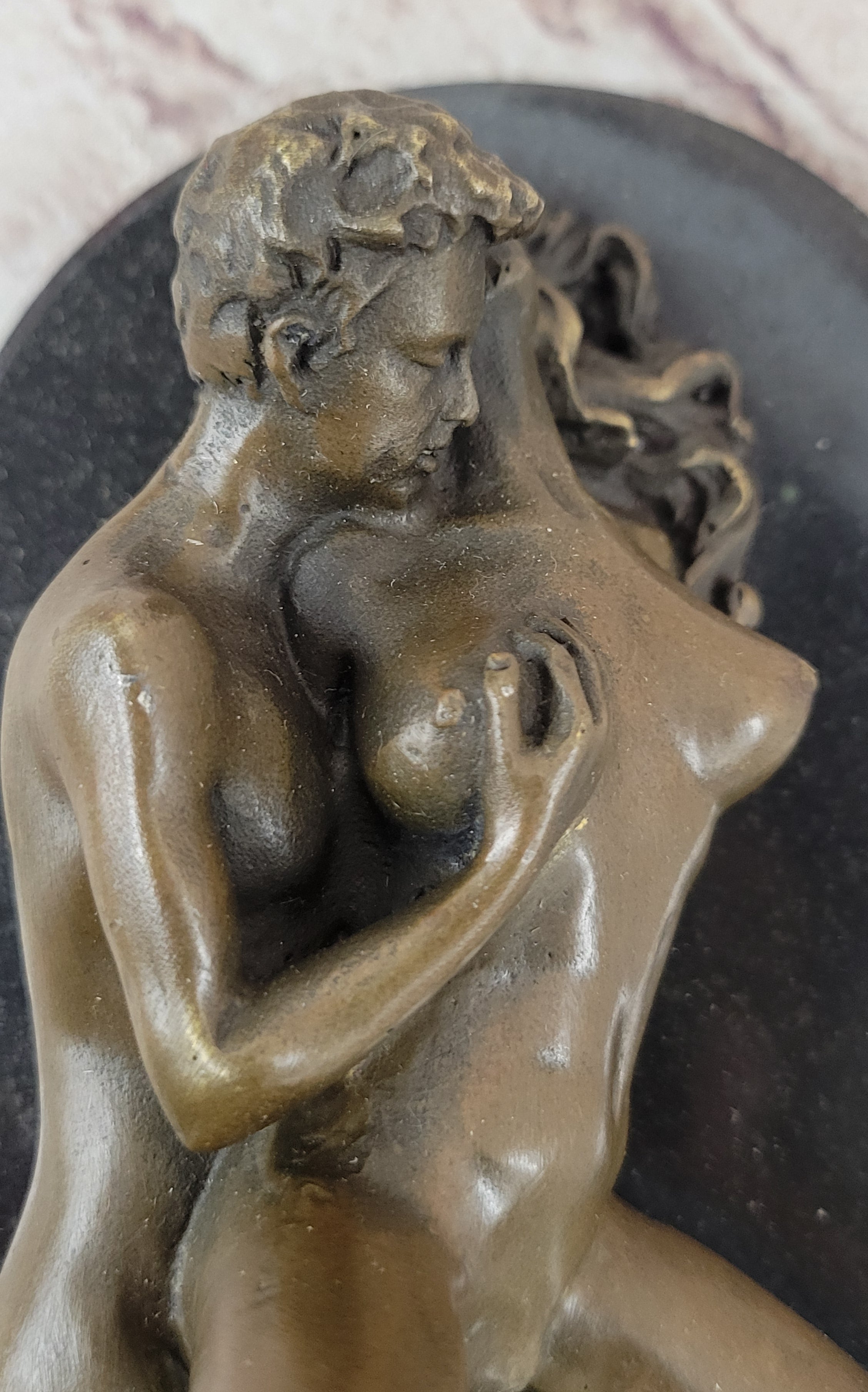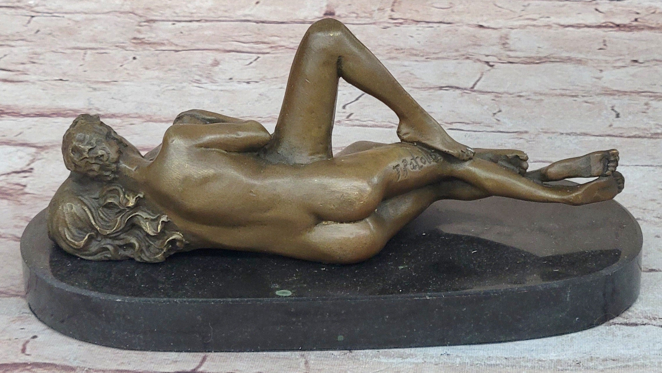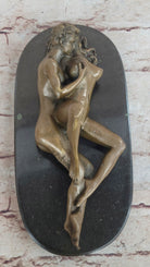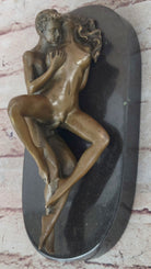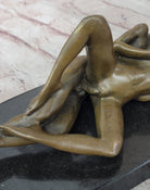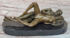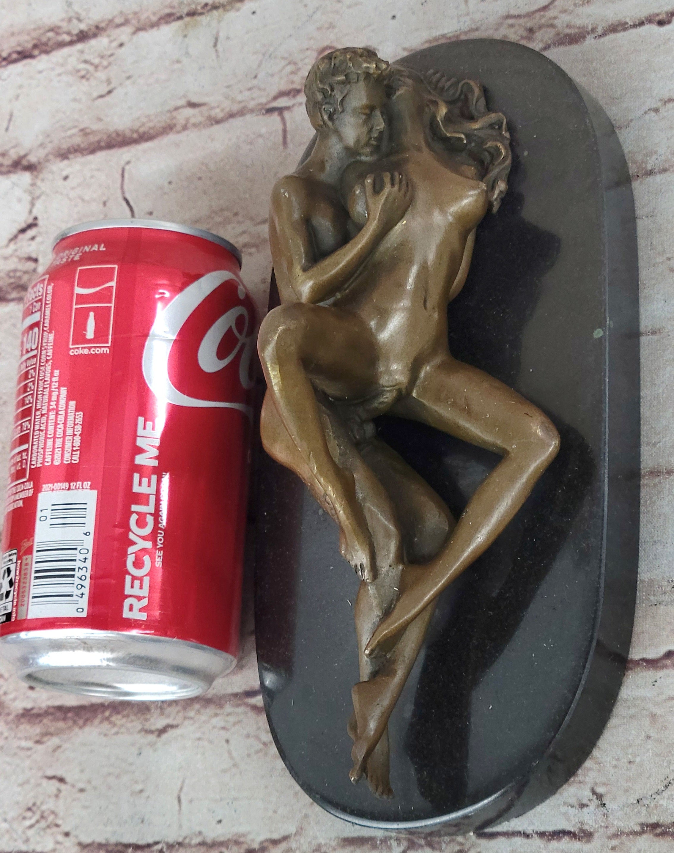This bronze sculpture captures an intimate moment between a male and female in a sensual pose. They lie on their sides, illustrating a connection that conveys deep emotions and affection. The detailed craftsmanship of the sculpture portrays the passion and closeness between the two figures, evident in their expressions and body language.