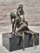 This alluring bronze figurine depicts an intensely erotic scene between a male and female figure. The female stands gracefully on one leg while the male engages her passionately from behind. His hands rest upon her leg as she expresses her pleasure through moans of ecstasy. The facial expressions of both figures exude enjoyment and fulfillment. While undoubtedly provocative, this sculpture showcases masterful artistry and intricate details. Crafted using the archaic lost-wax casting method, this handmade bronze sculpture is a testament to the artist's skill and dedication. Its brown patina finish perpetuates its timeless allure. Despite its explicit subject matter, this sculpture is a remarkable work of art that will be cherished for years to come. It is a collector's edition figurine, signed by the talented artist Mavchi, adding further value and distinction to this captivating piece.Bronze Dimensions with Marble Base: Height 10" x Width 7"