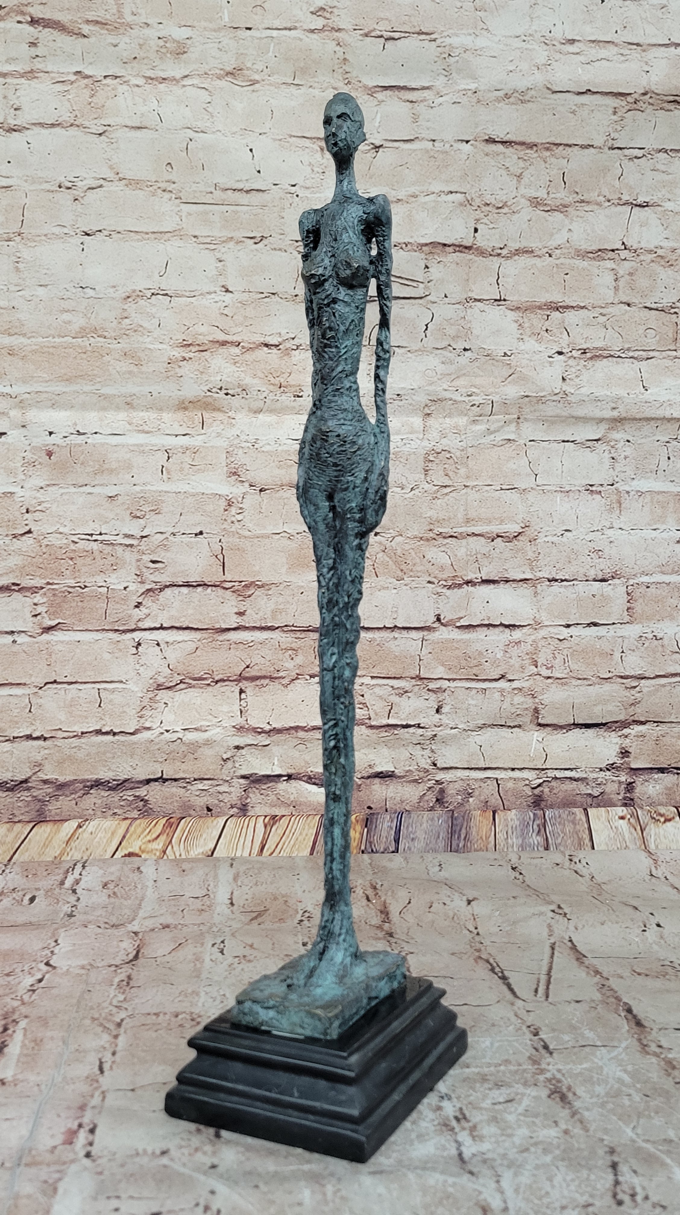 A stunning bronze sculpture inspired by the iconic works of Alberto Giacometti, this piece showcases a slender standing female figure characterized by elongated, textured forms. The intricate details highlight Giacometti's signature style, embodying existential themes and human fragility. Set on a square base, this artwork captures a sense of timelessness and introspection, making it a captivating addition to any art collection.Bronze Dimensions with Marble Base: Height 20" X Width 5.5"