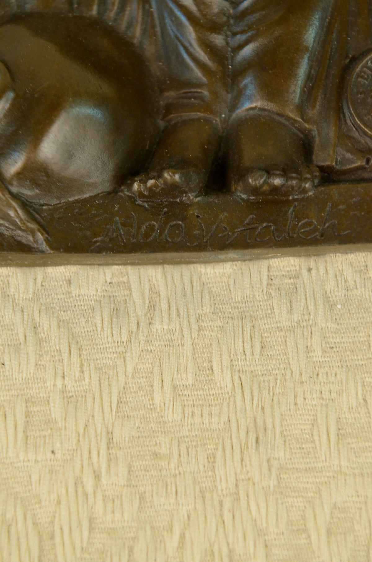 This sculpture of a woman holding a vase filled with water, which she is emptying is exquisite. She has this beautiful long and droopy dress that leaves her breast bare, so its place right under her chest. She seems to not care and continue doing as she was doing, She has a hood that looks more like another big drape hanging off her head. She is a lovely woman full of grace and elegance. She is bare foot walking through he park with her water vase. She is cast using the ancient old "Lost Wax Method" stained in brown patina. 100% handmade and 100% bronze, signed by the artist Aldo Vitaleh.Bronze Dimensions :Height 19" x Width 5"