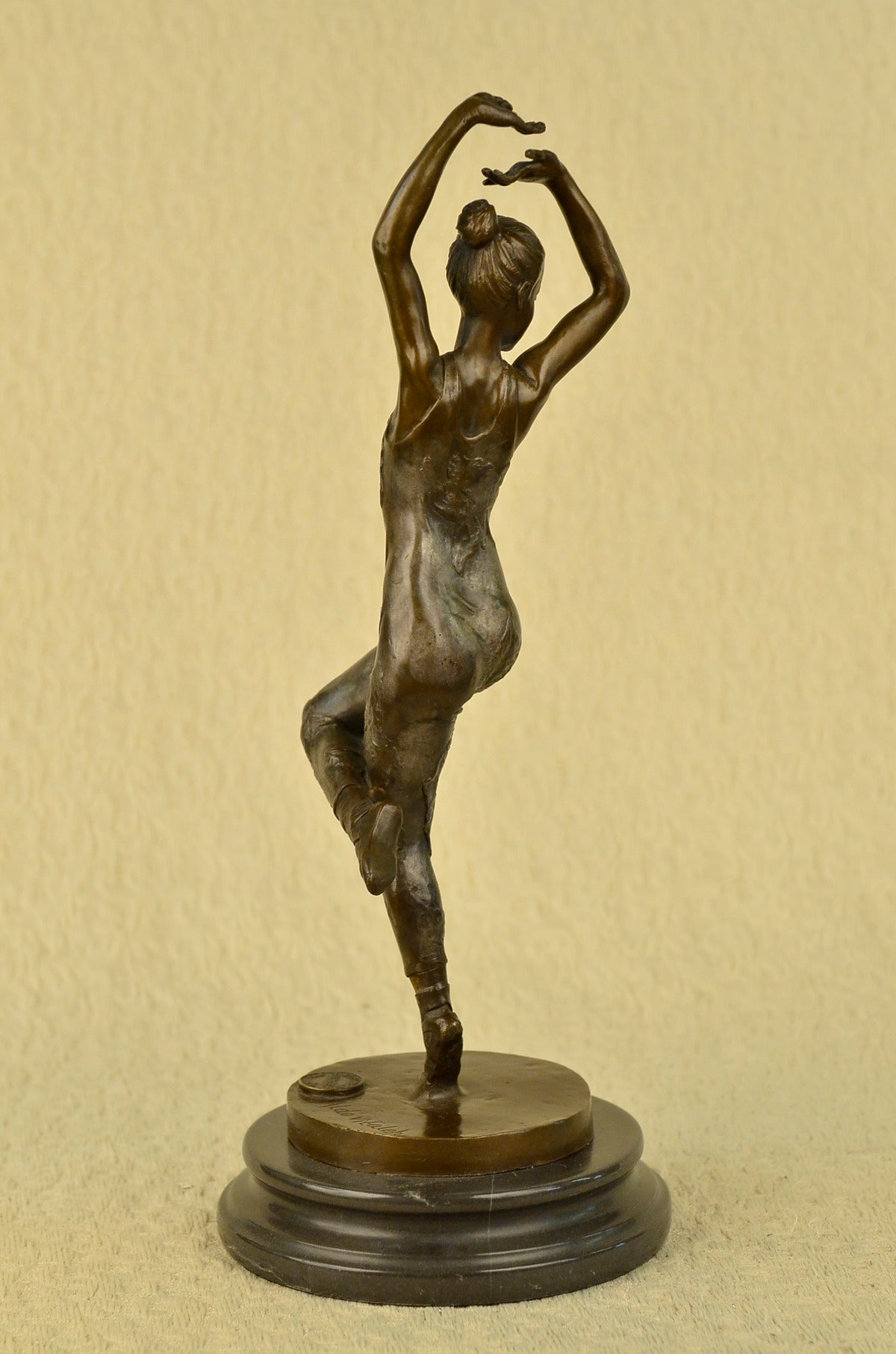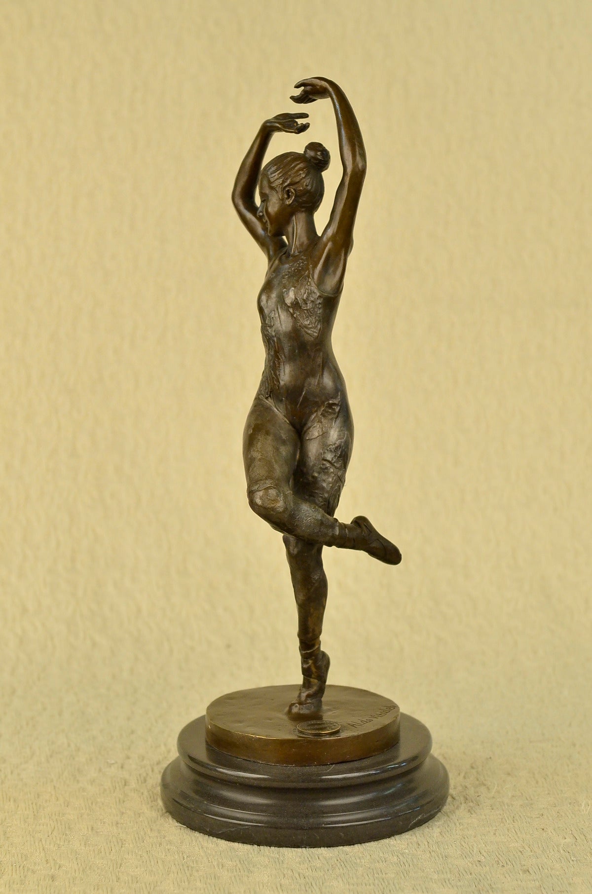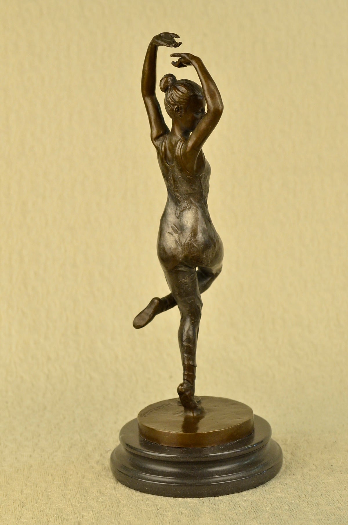 This is a captivating bronze study of the beautiful young ballet dancer. When you look over the sculpture and the depth and warmth of the patina meet your eye, it sends a sense of calmness and gracefulness. It’s almost as if the sculpture is a picture of a lullaby in still motion. She points her left foot toe, carefully and gracefully she turns her body, even her fingers are positioned in a polite manner, as she tiptoes on her right foot. Her beautifully proportioned body is accented by the ballet dress she wears. Creasing with gravity and fluid movement, the skirt is wide and flowing at the hips giving nice dimension to the dancer. On her feet she wears ballet slippers that criss- cross around her ankles and tie. Her hair is tied back and tied up into such fine proper buns. Her face has delicate features, with full lips, a cute small nose, and wide innocent accepting eye. This sculpture was cast using the "Lost Wax Method" and has a brown patina finish. She is mounted on a black marble base and it has a classic feel. She is 100% bronze and 100% handmade. She is signed by the artist Aldo vitaleh.Original or Reproduction: Original