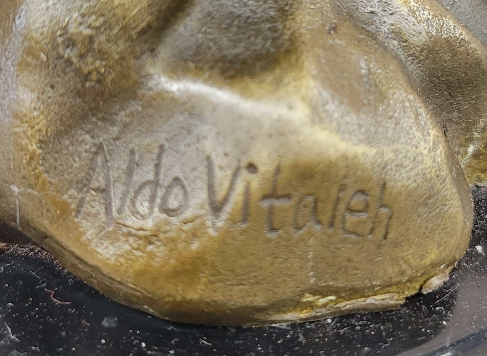 Mounted on a round black marble base for contrast and stability, this timeless sculpture is signed by Italian artist Aldo Vitaleh. It is a refined addition to any art collection and a perfect accent for living rooms, offices, or elegant display spaces.Bronze Dimensions with Marble Base: Height 19" X Width 6"