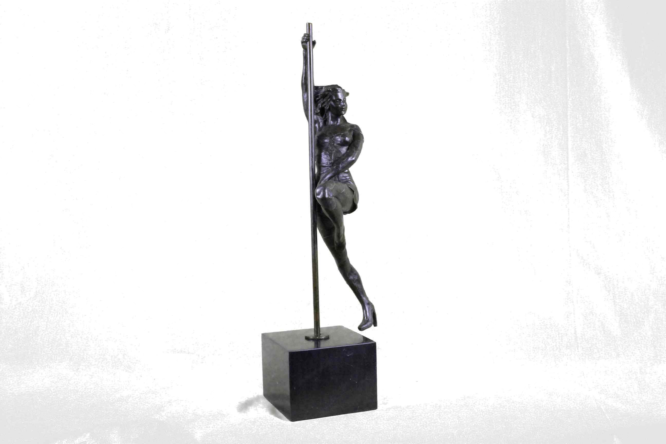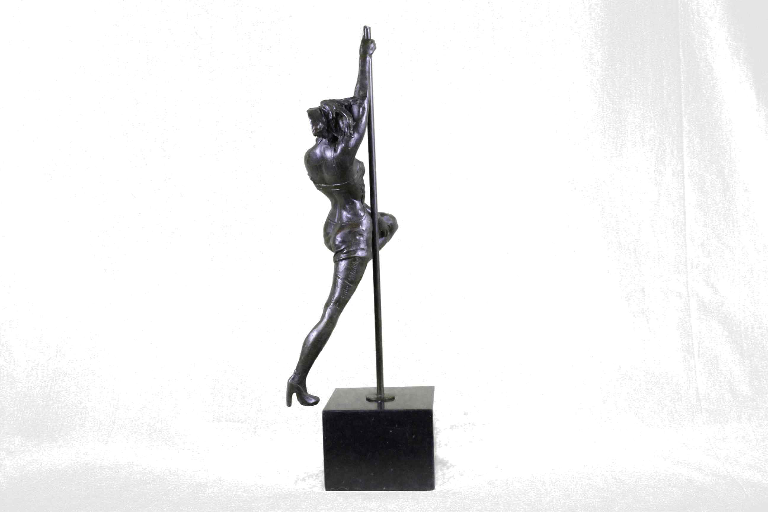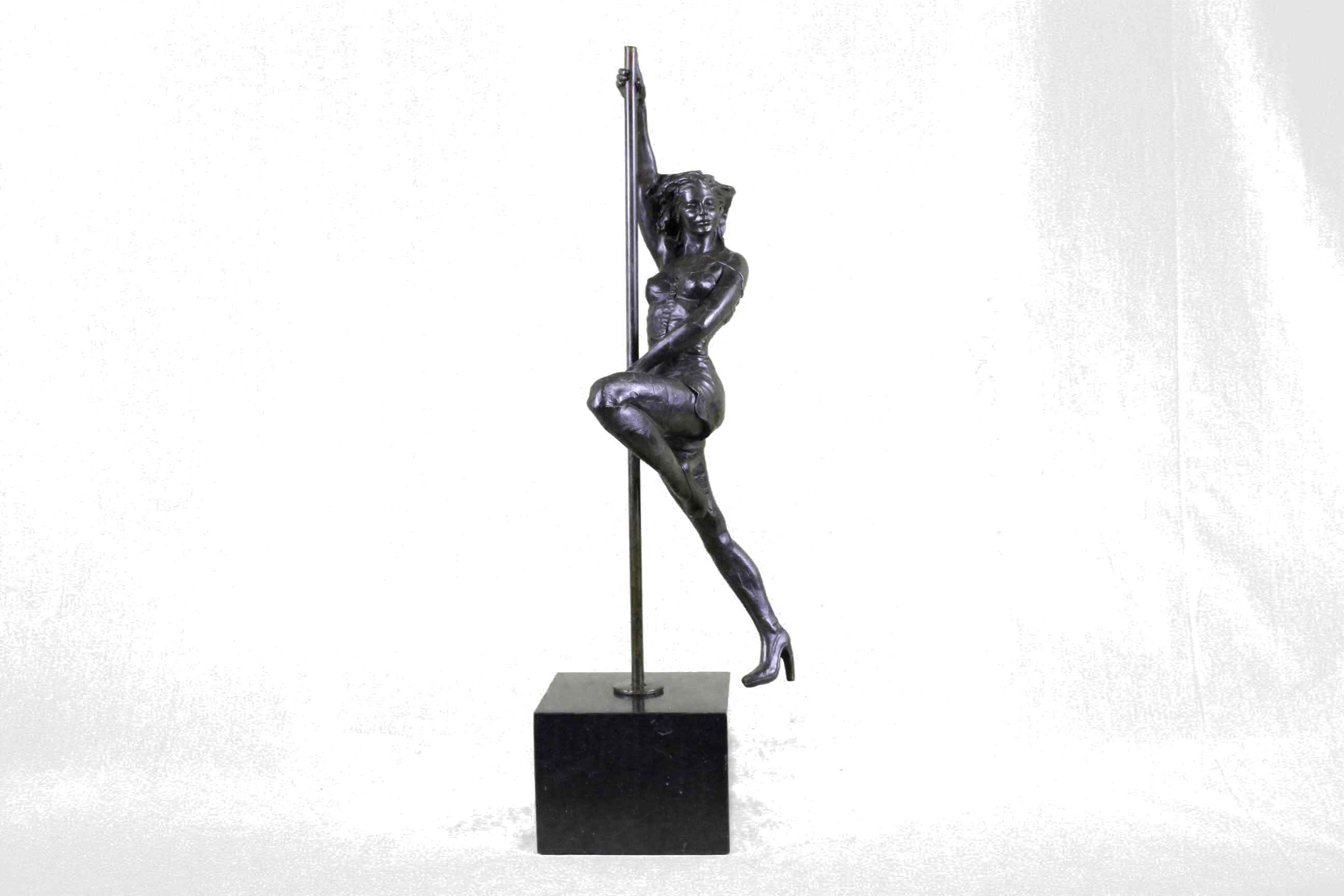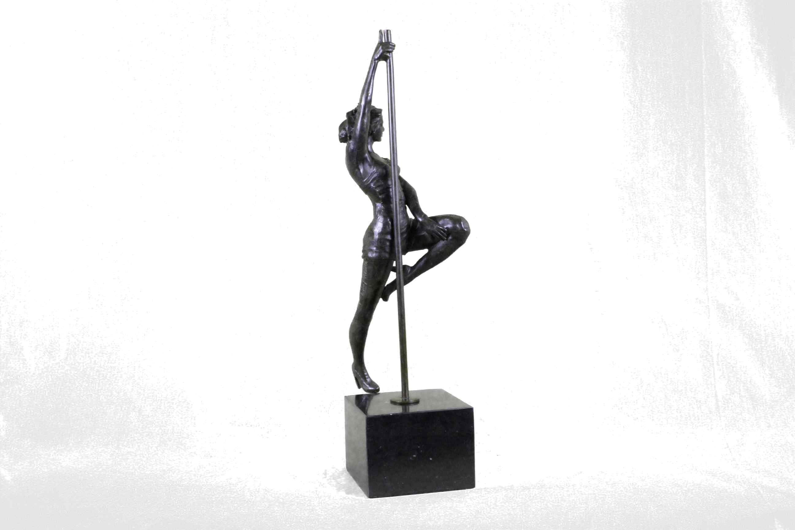 As almost any form of art and cultural activity can be studied and is worthy of analysis. But pole dancing has a stigma of being a crass and sexually provoking performance. That side of the spectrum does exist, but the sexual and gender politics of pole dancing in modern life are much more complex to conveniently label it as such. Cast using the "Lost Wax Method", this sculpture is 100% bronze and handmade in a Brown patina. She is mounted on a square marble base and is signed by Italian Artist Aldo Vitaleh.Bronze Dimensions with Marble Base:Height 20" x Width 7"