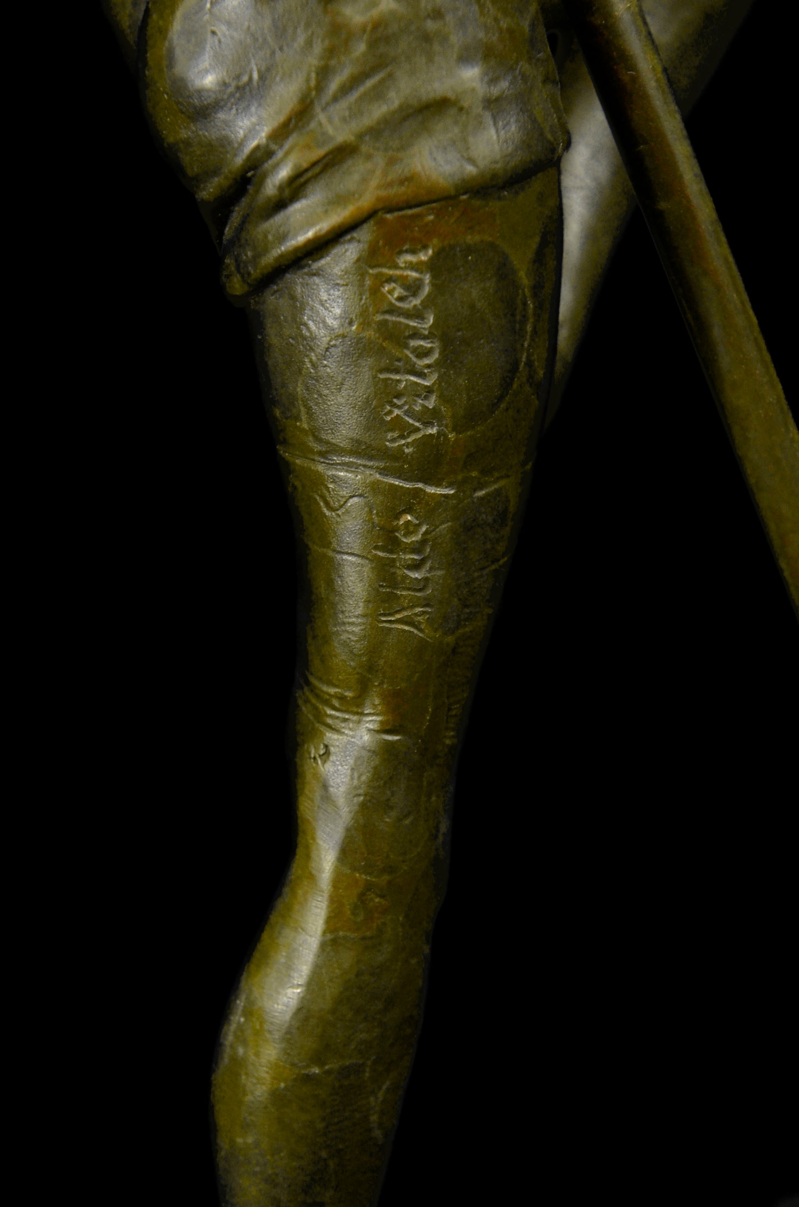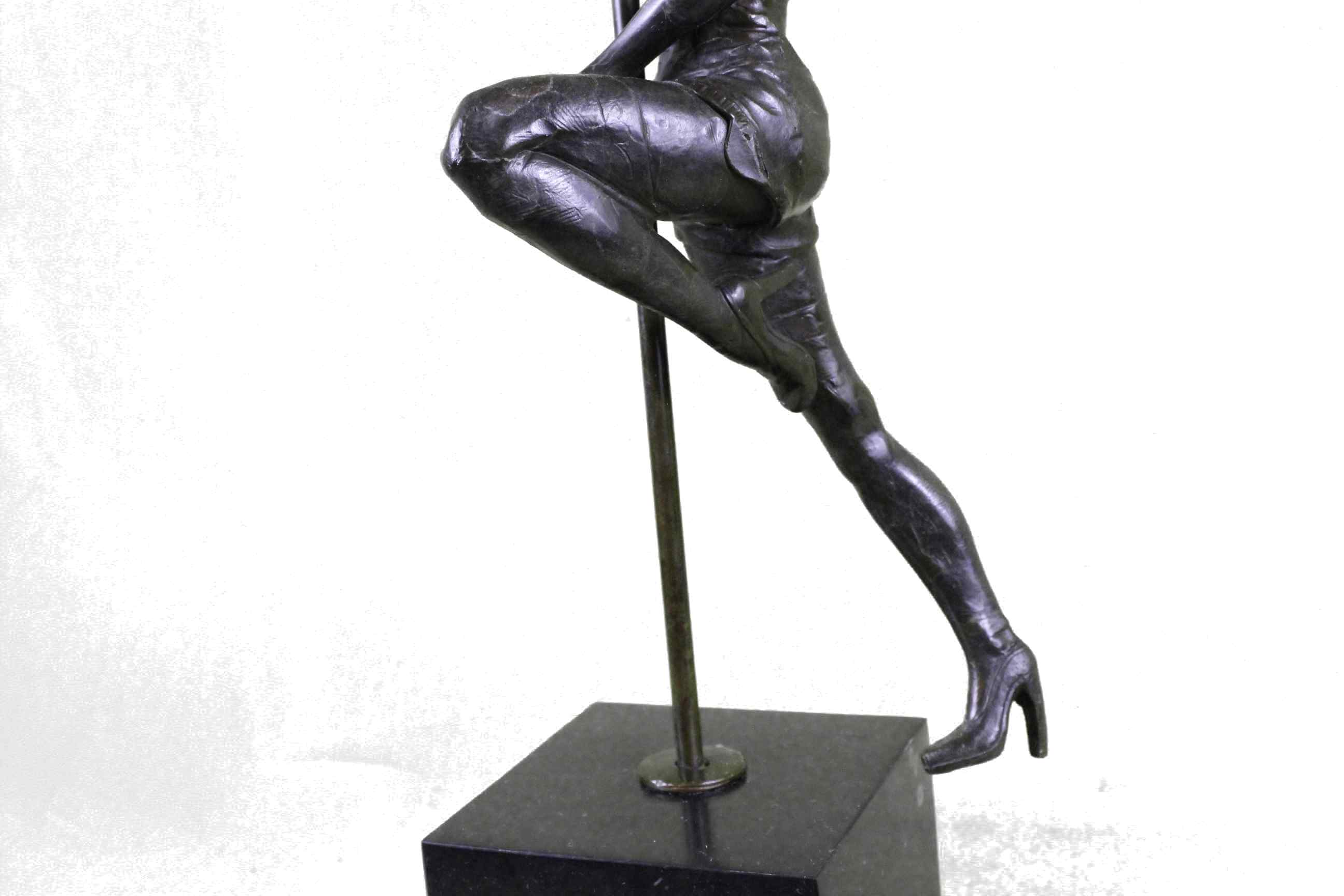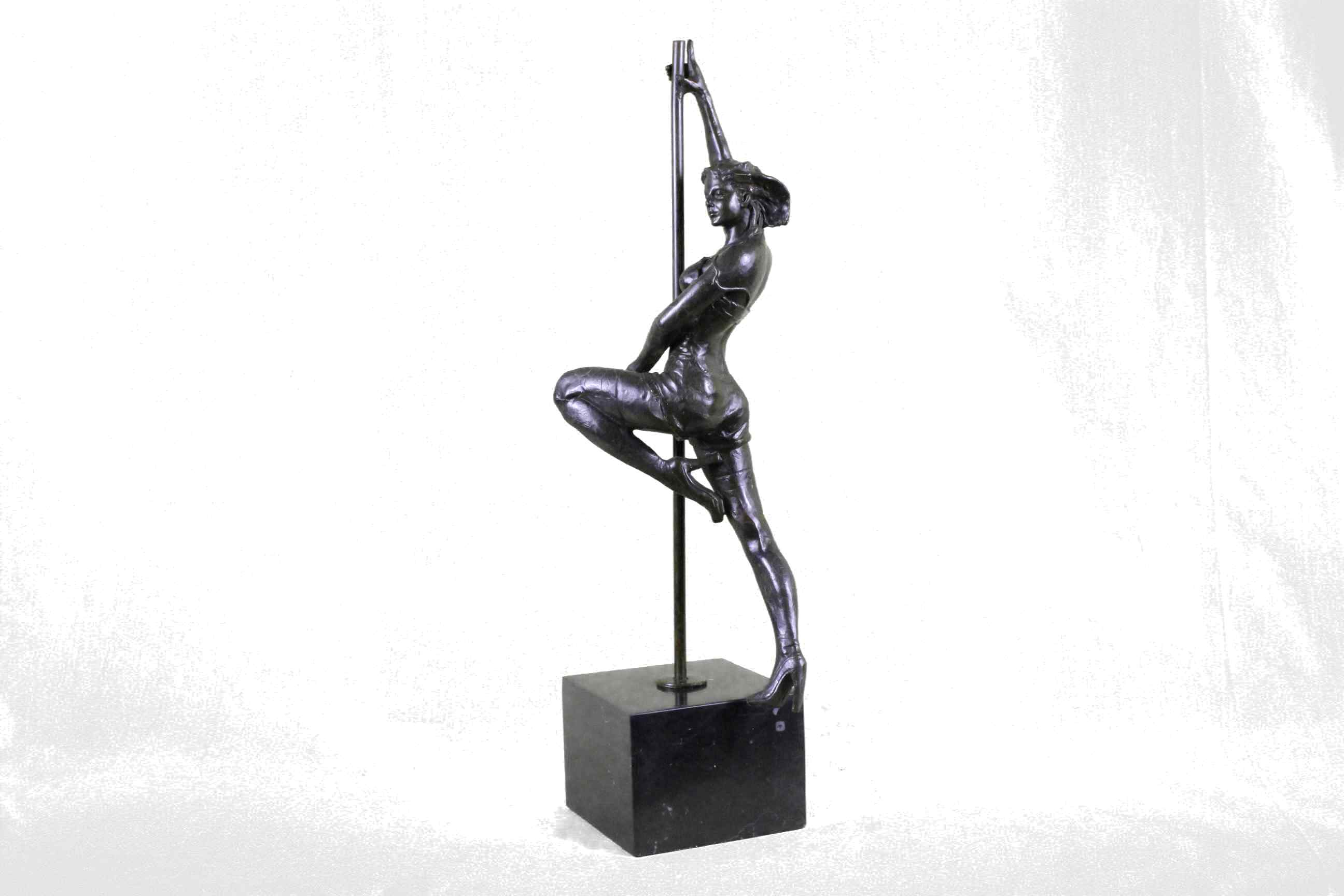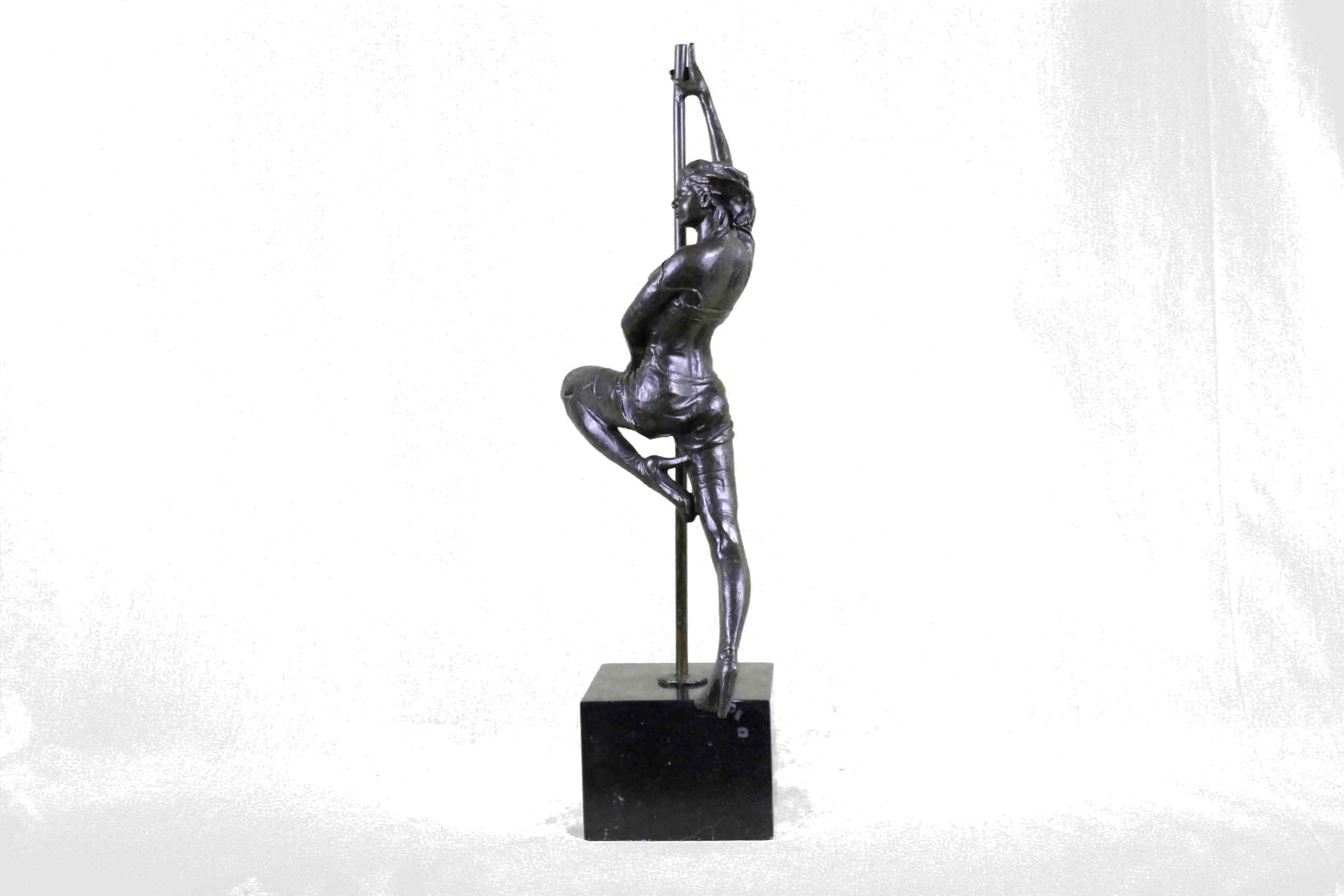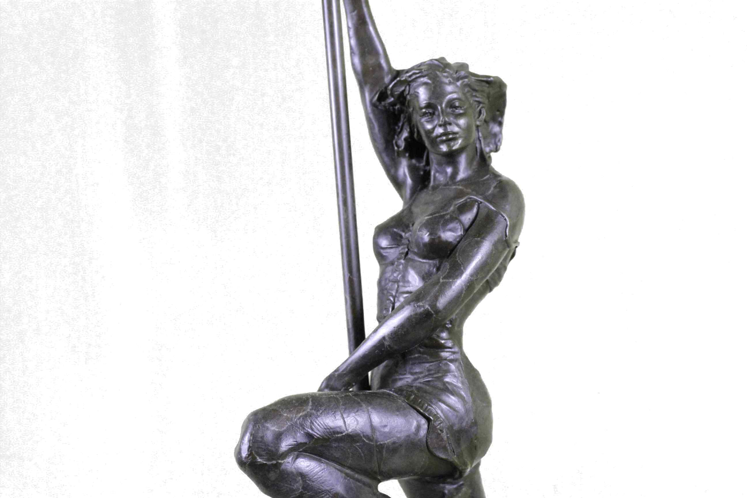 As almost any form of art and cultural activity can be studied and is worthy of analysis. But pole dancing has a stigma of being a crass and sexually provoking performance. That side of the spectrum does exist, but the sexual and gender politics of pole dancing in modern life are much more complex to conveniently label it as such. Cast using the "Lost Wax Method", this sculpture is 100% bronze and handmade in a Brown patina. She is mounted on a square marble base and is signed by Italian Artist Aldo Vitaleh.Bronze Dimensions with Marble Base:Height 20" x Width 7"