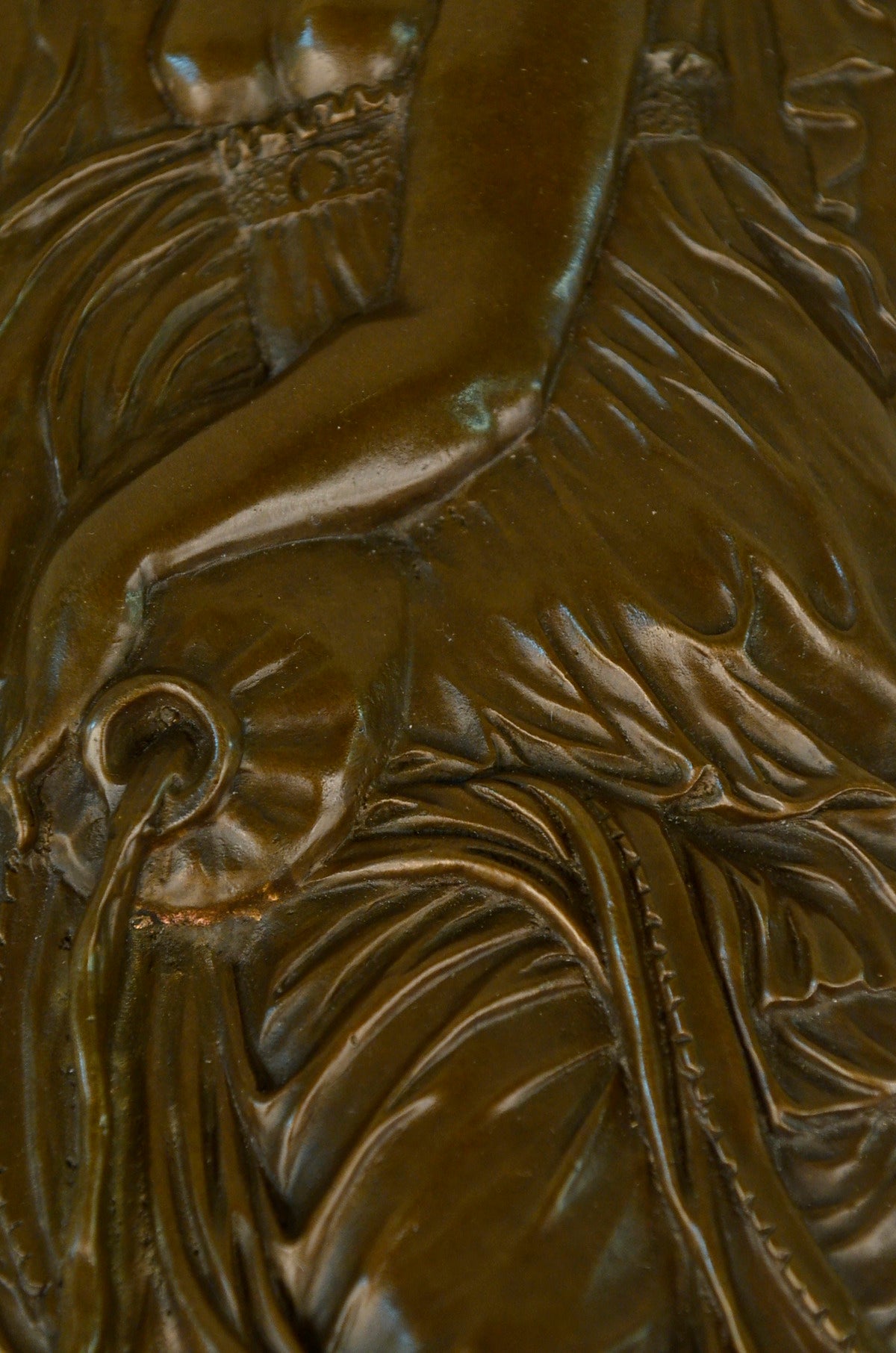 This sculpture of a woman holding a vase filled with water, which she is emptying is exquisite. She has this beautiful long and droopy dress that leaves her breast bare, so its place right under her chest. She seems to not care and continue doing as she was doing, She has a hood that looks more like another big drape hanging off her head. She is a lovely woman full of grace and elegance. She is bare foot walking through he park with her water vase. She is cast using the ancient old "Lost Wax Method" stained in brown patina. 100% handmade and 100% bronze, signed by the artist Aldo Vitaleh.Bronze Dimensions :Height 19" x Width 5"