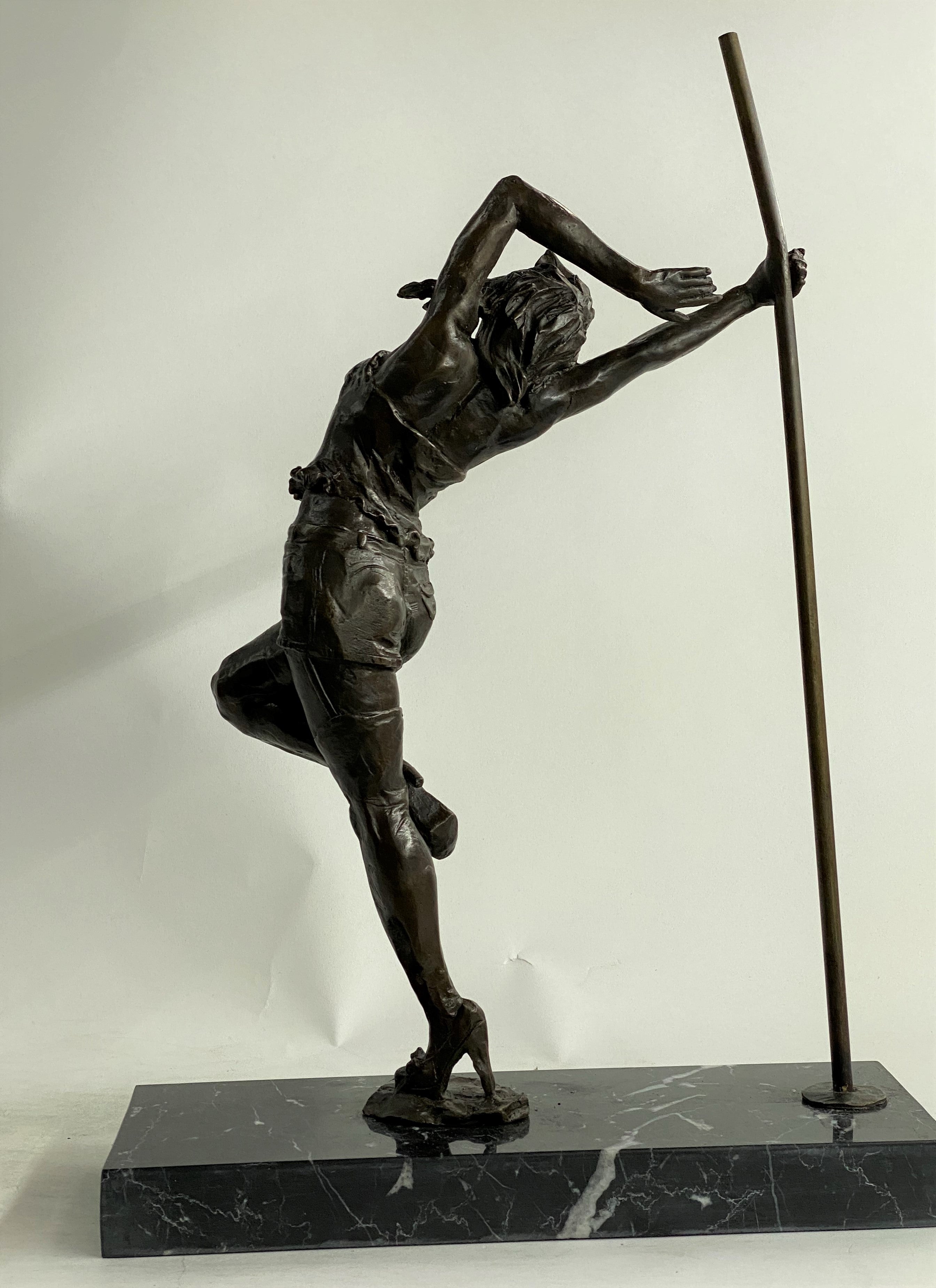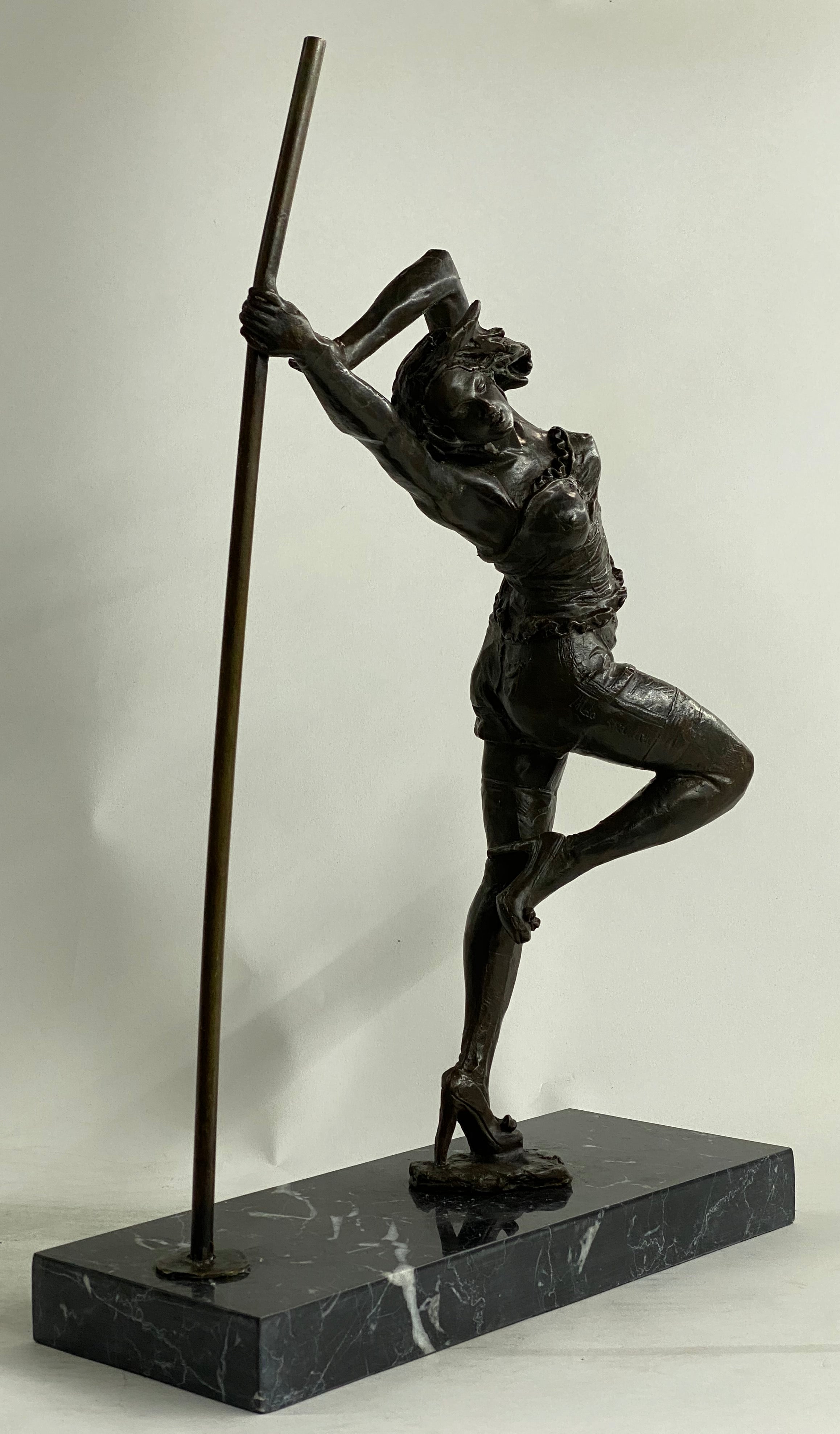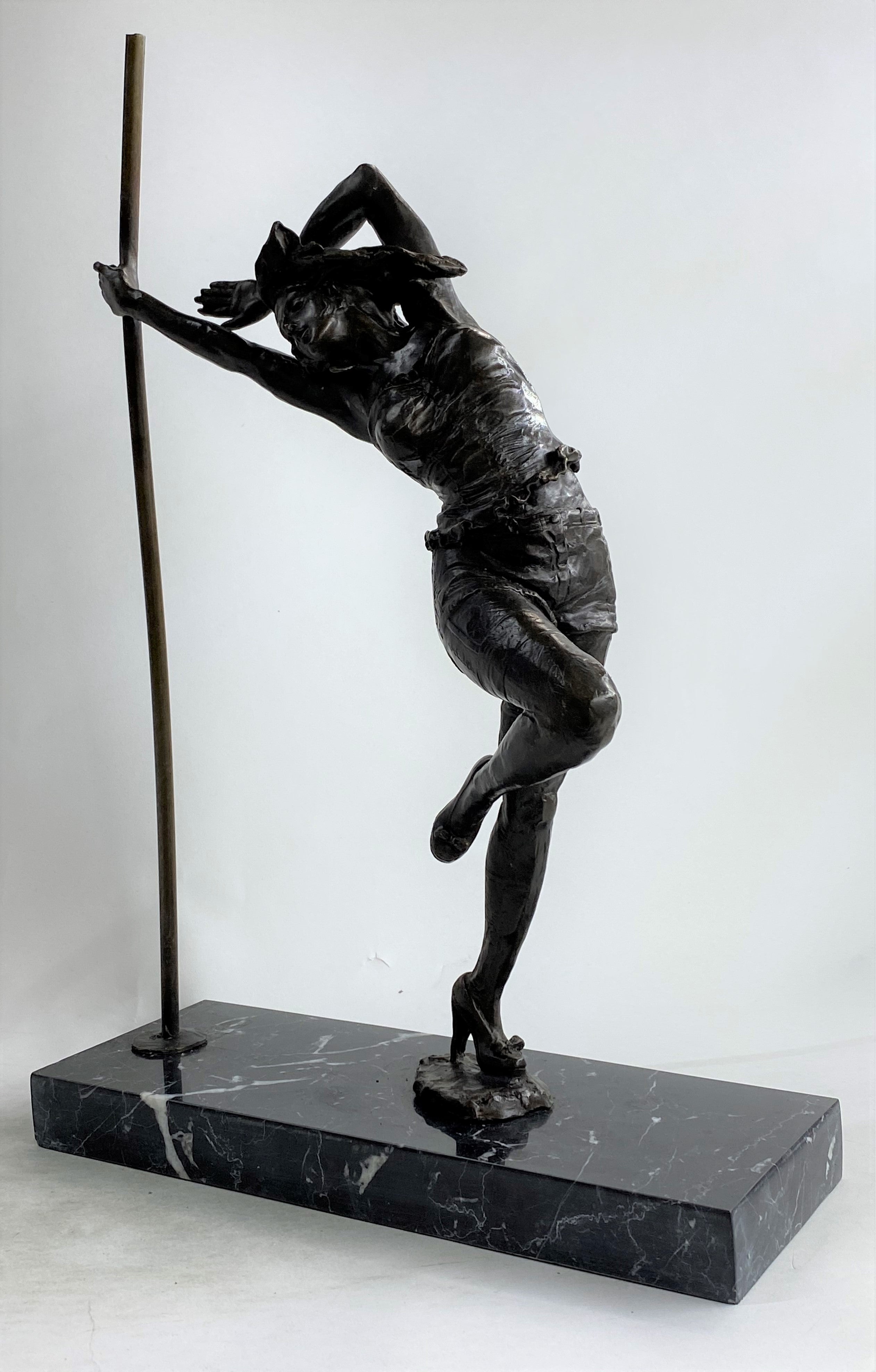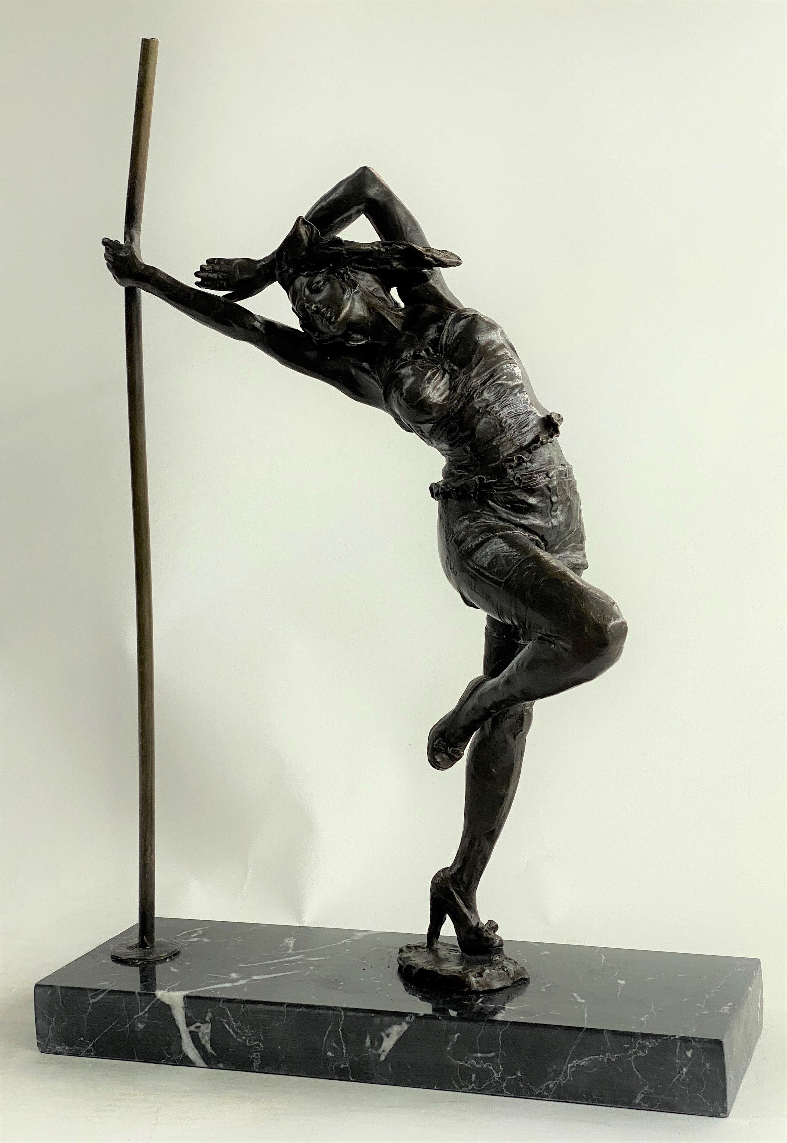 As almost any form of art and cultural activity can be studied and is worthy of analysis. But pole dancing has a stigma of being a crass and sexually provoking performance. That side of the spectrum does exist, but the sexual and gender politics of pole dancing in modern life are much more complex to conveniently label it as such. Cast using the "Lost Wax Method", this sculpture is 100% bronze and handmade in a Brown patina. She is mounted on a square marble base and is signed by Italian Artist Aldo Vitaleh.Bronze Dimensions with Marble Base:Height 18" x Width 12.5"