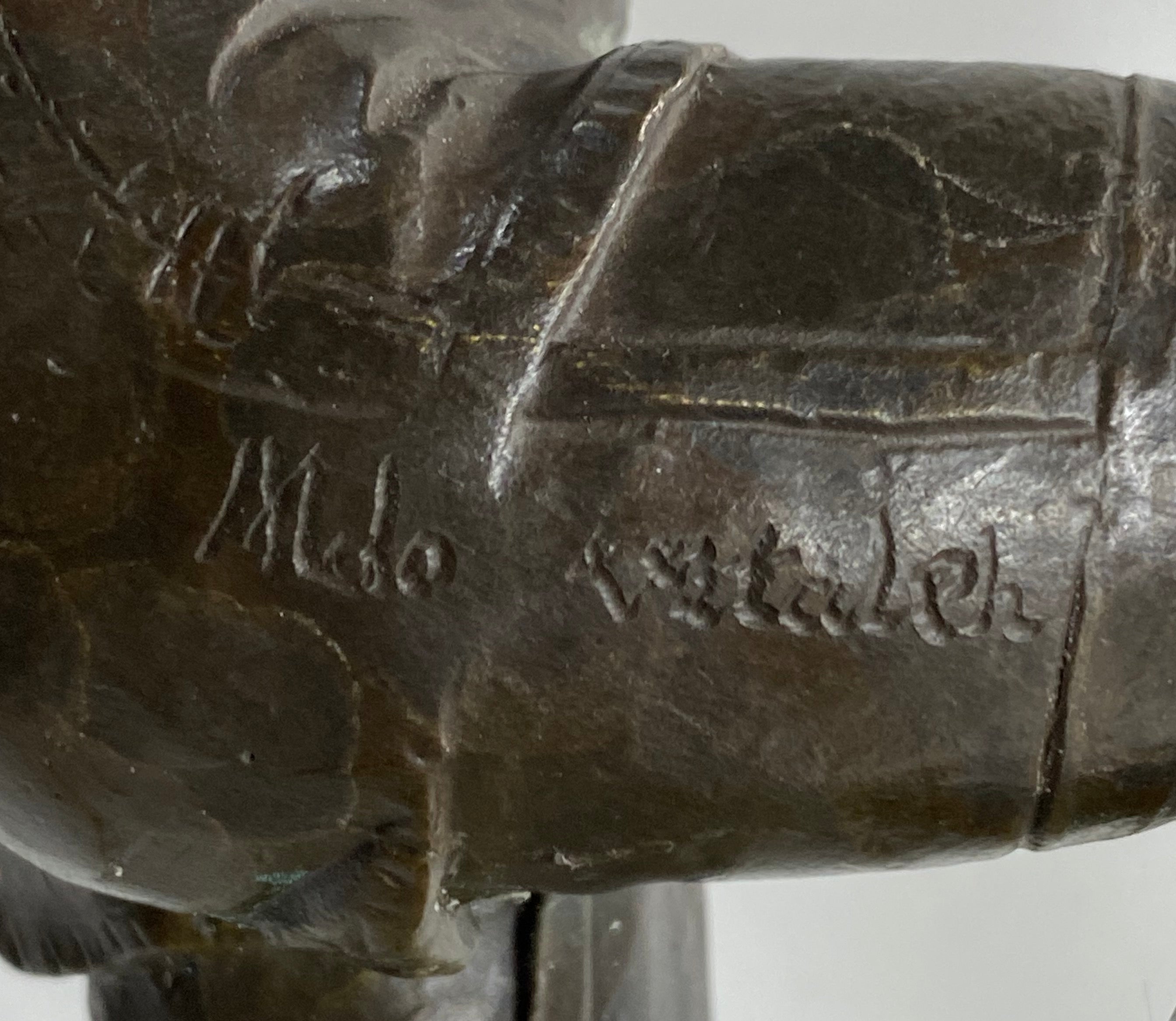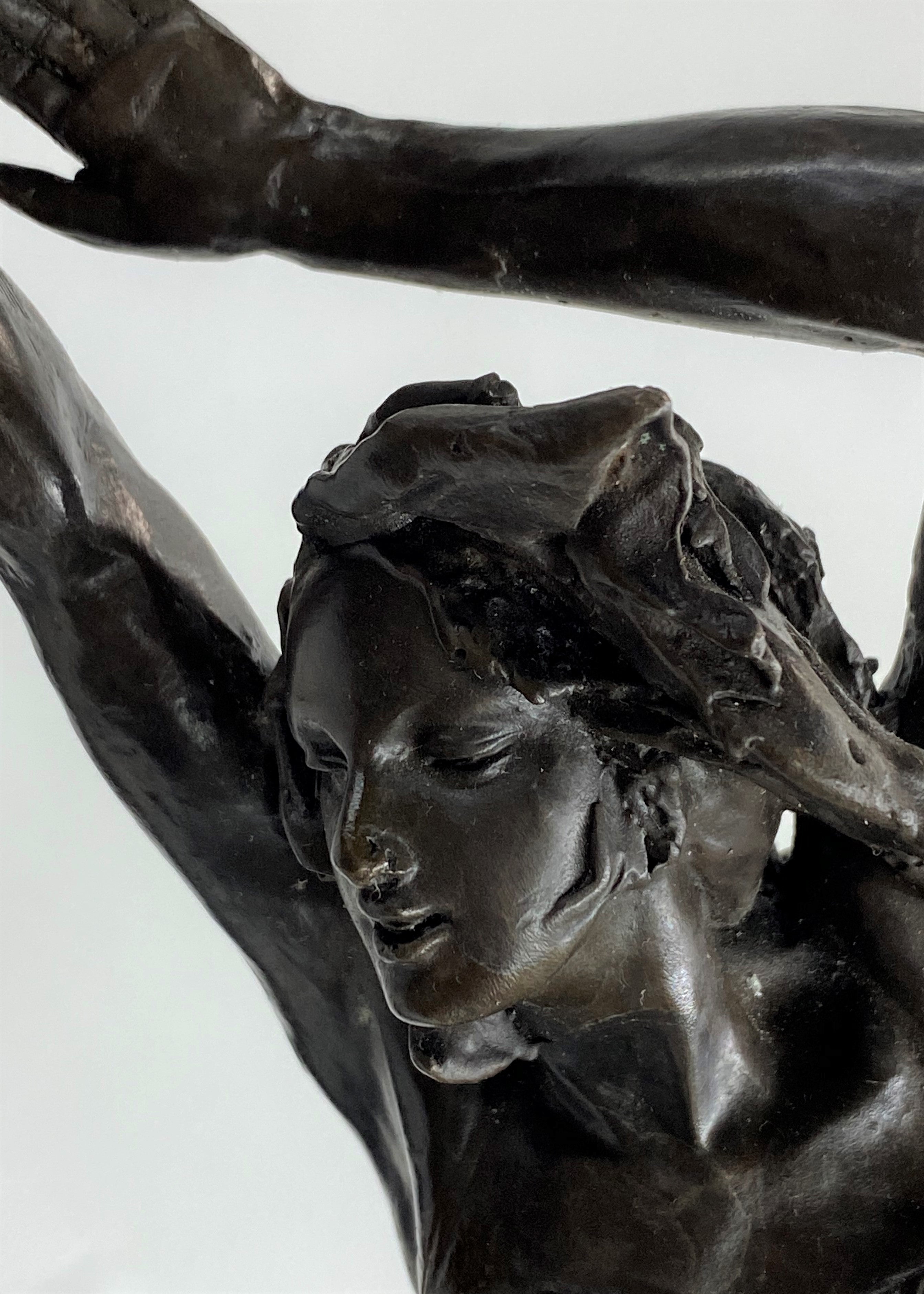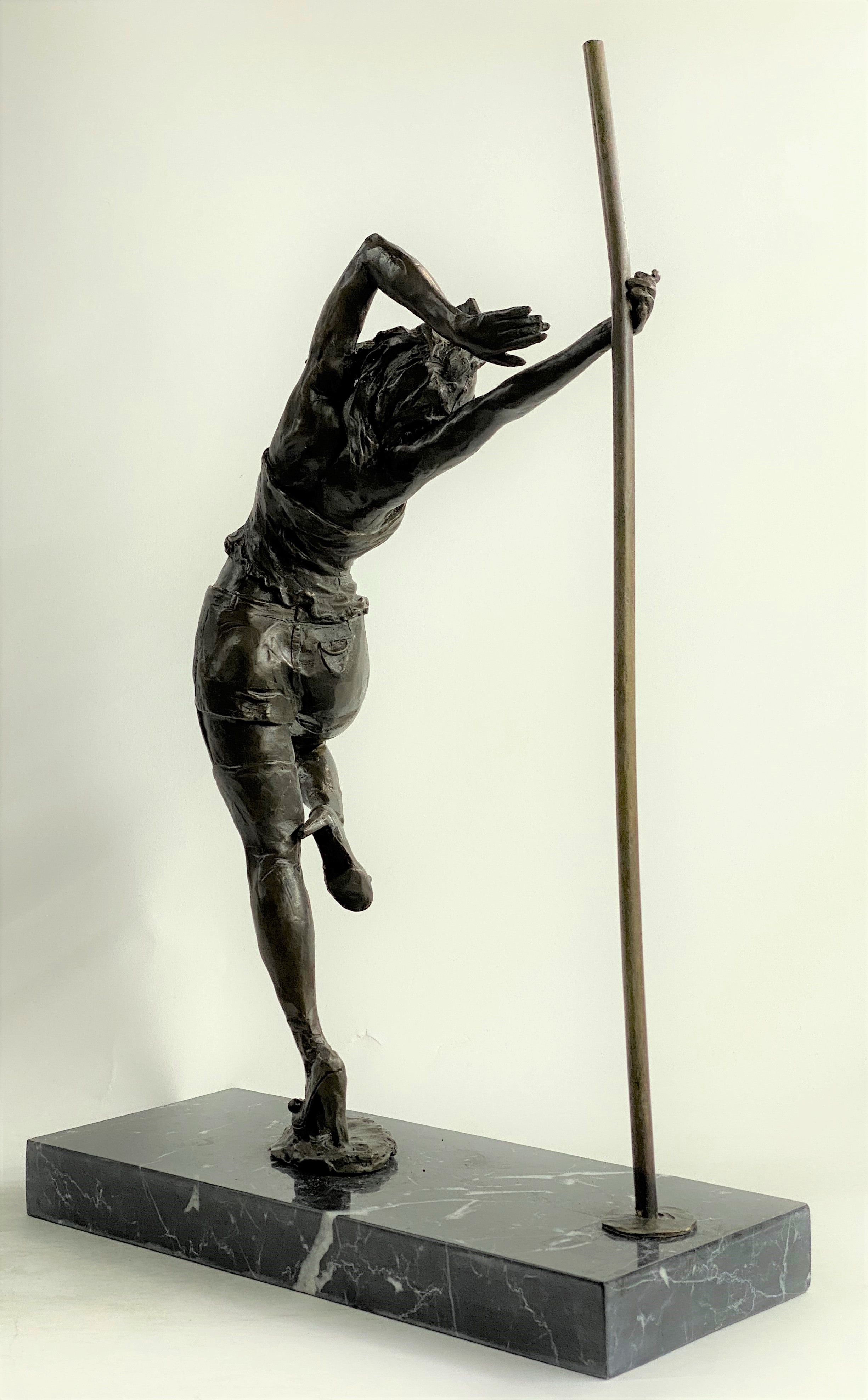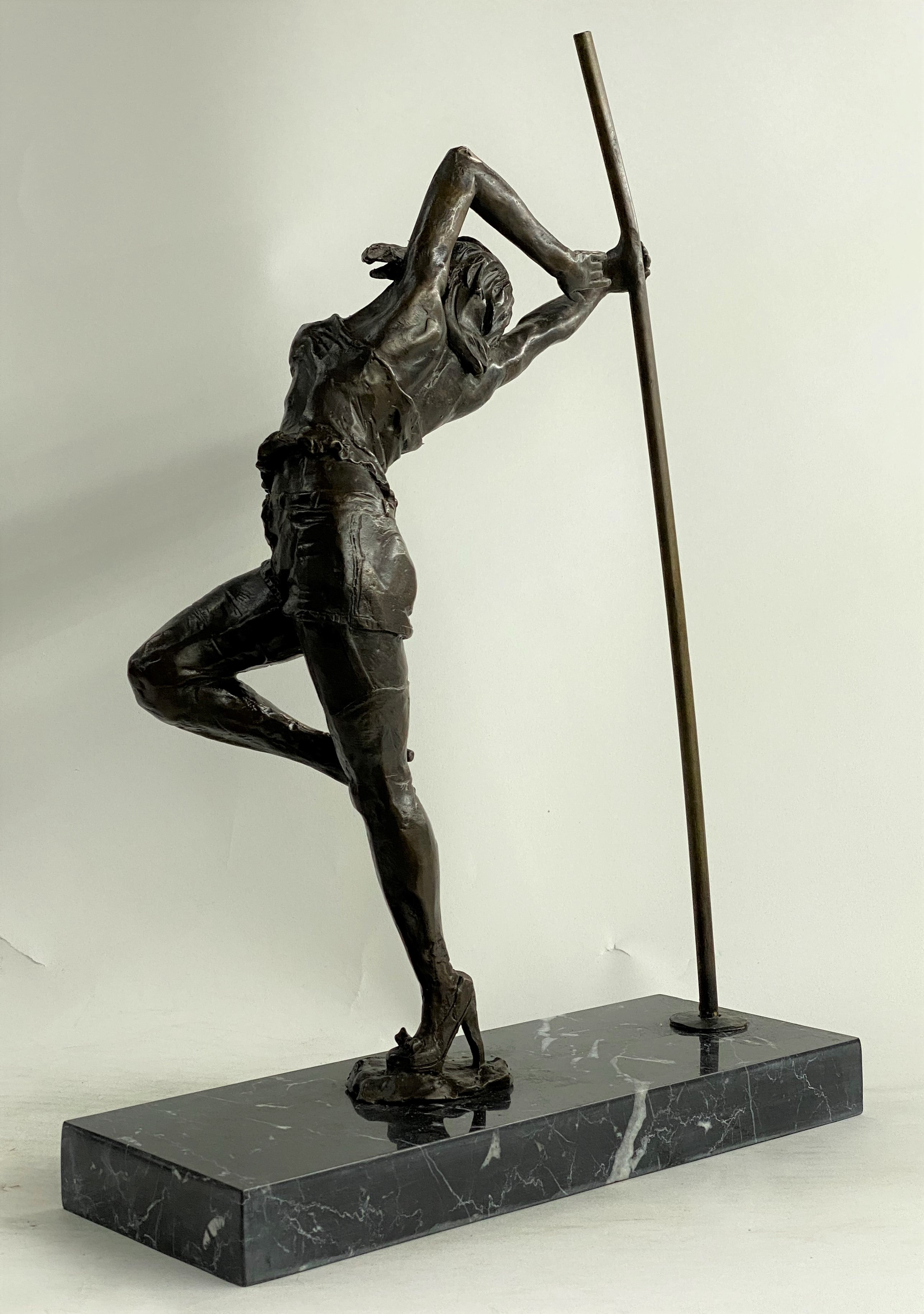 As almost any form of art and cultural activity can be studied and is worthy of analysis. But pole dancing has a stigma of being a crass and sexually provoking performance. That side of the spectrum does exist, but the sexual and gender politics of pole dancing in modern life are much more complex to conveniently label it as such. Cast using the "Lost Wax Method", this sculpture is 100% bronze and handmade in a Brown patina. She is mounted on a square marble base and is signed by Italian Artist Aldo Vitaleh.Bronze Dimensions with Marble Base:Height 18" x Width 12.5"