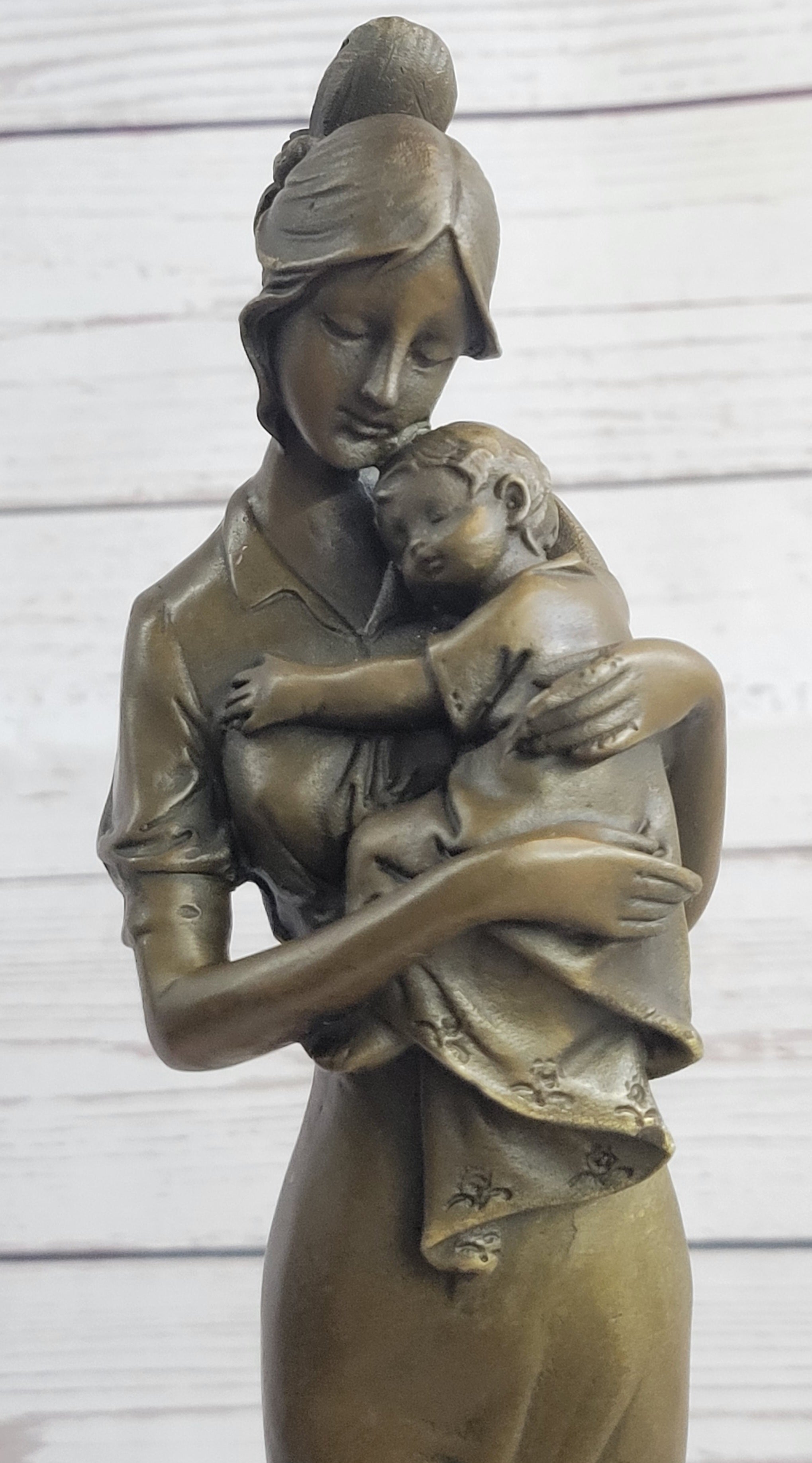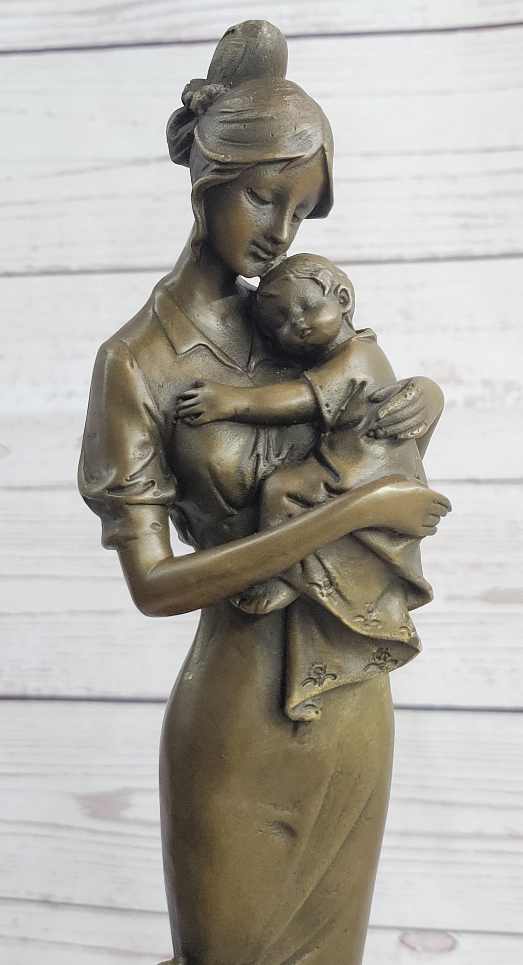 This exquisite bronze sculpture beautifully encapsulates the profound gift of life itself. The maternal essence is elegantly portrayed as a female mother stands, cradling her newborn child tenderly against her bosom. Her gaze is one of pure adoration, reflecting the deep connection between mother and child. Every nuance of this profound moment is meticulously captured, making it a truly exceptional work of art that holds a special place in the heart.