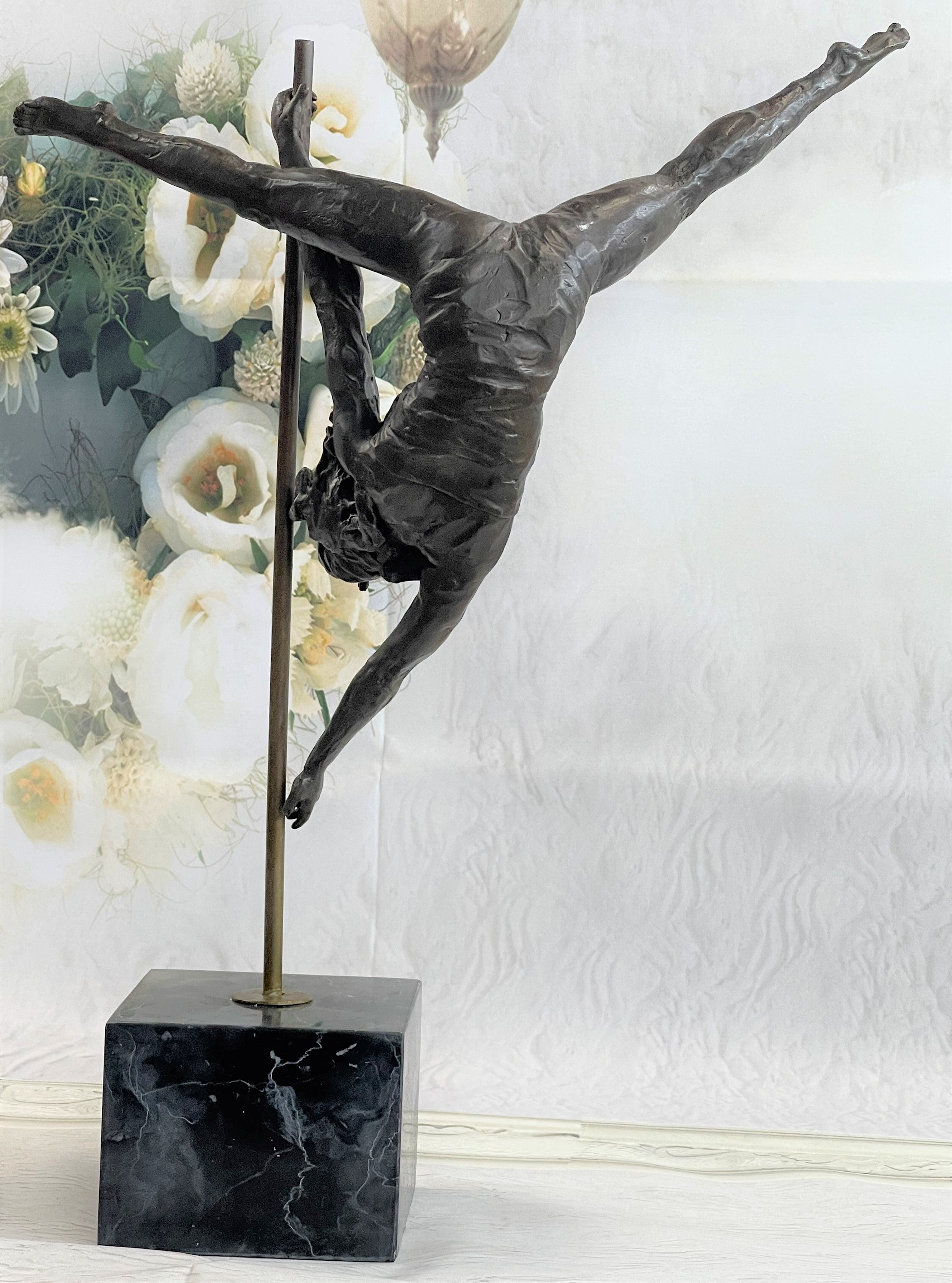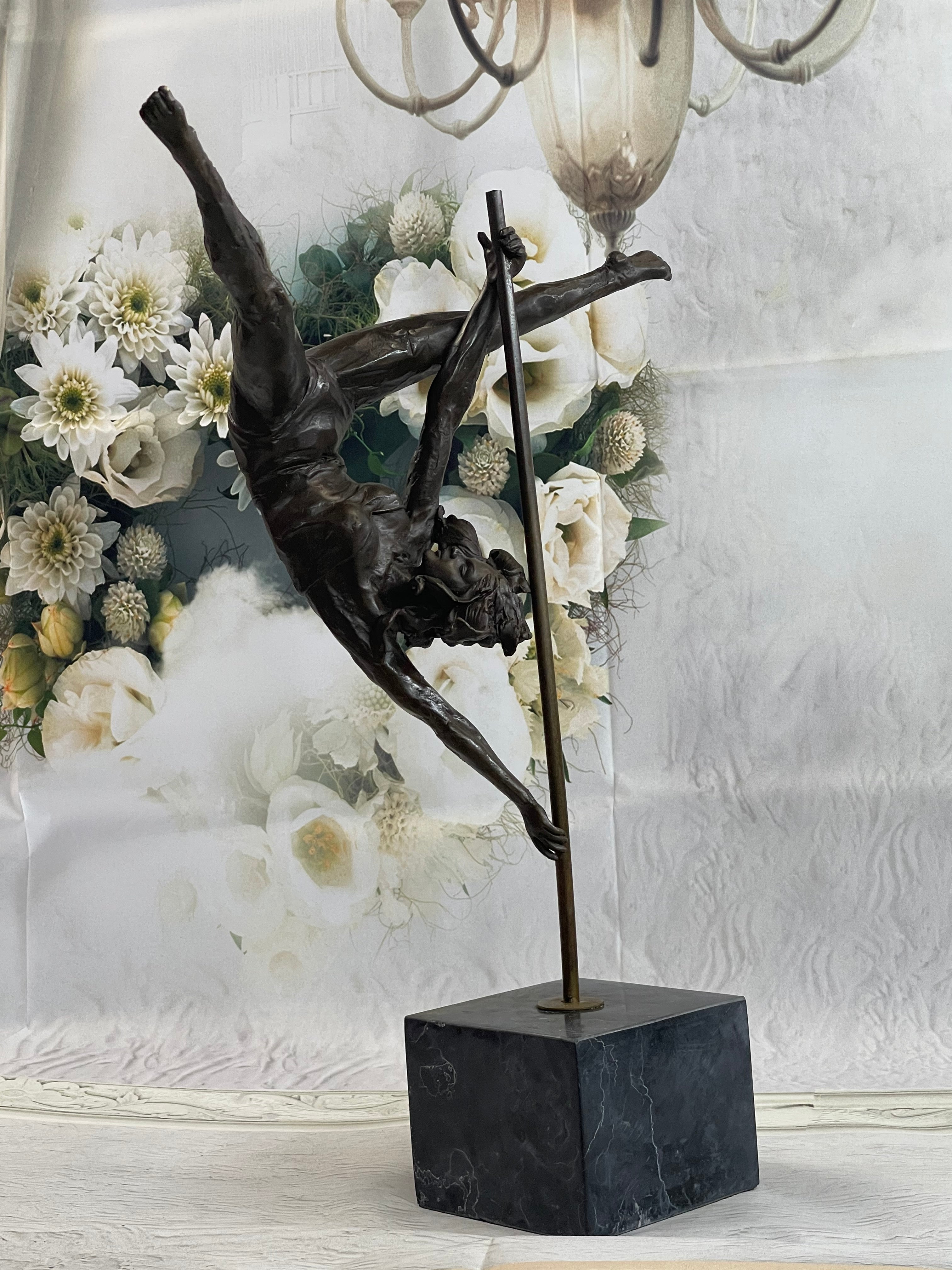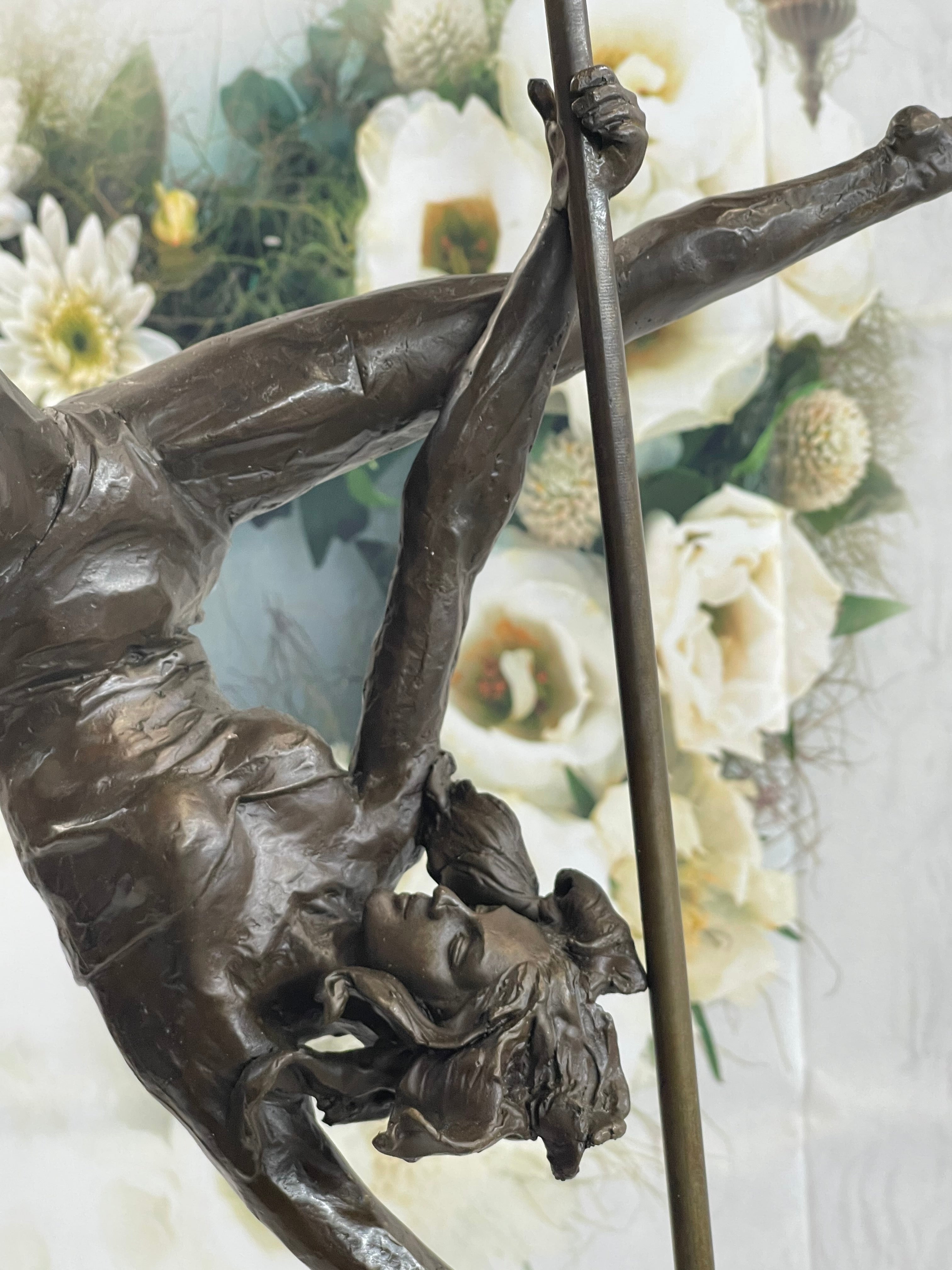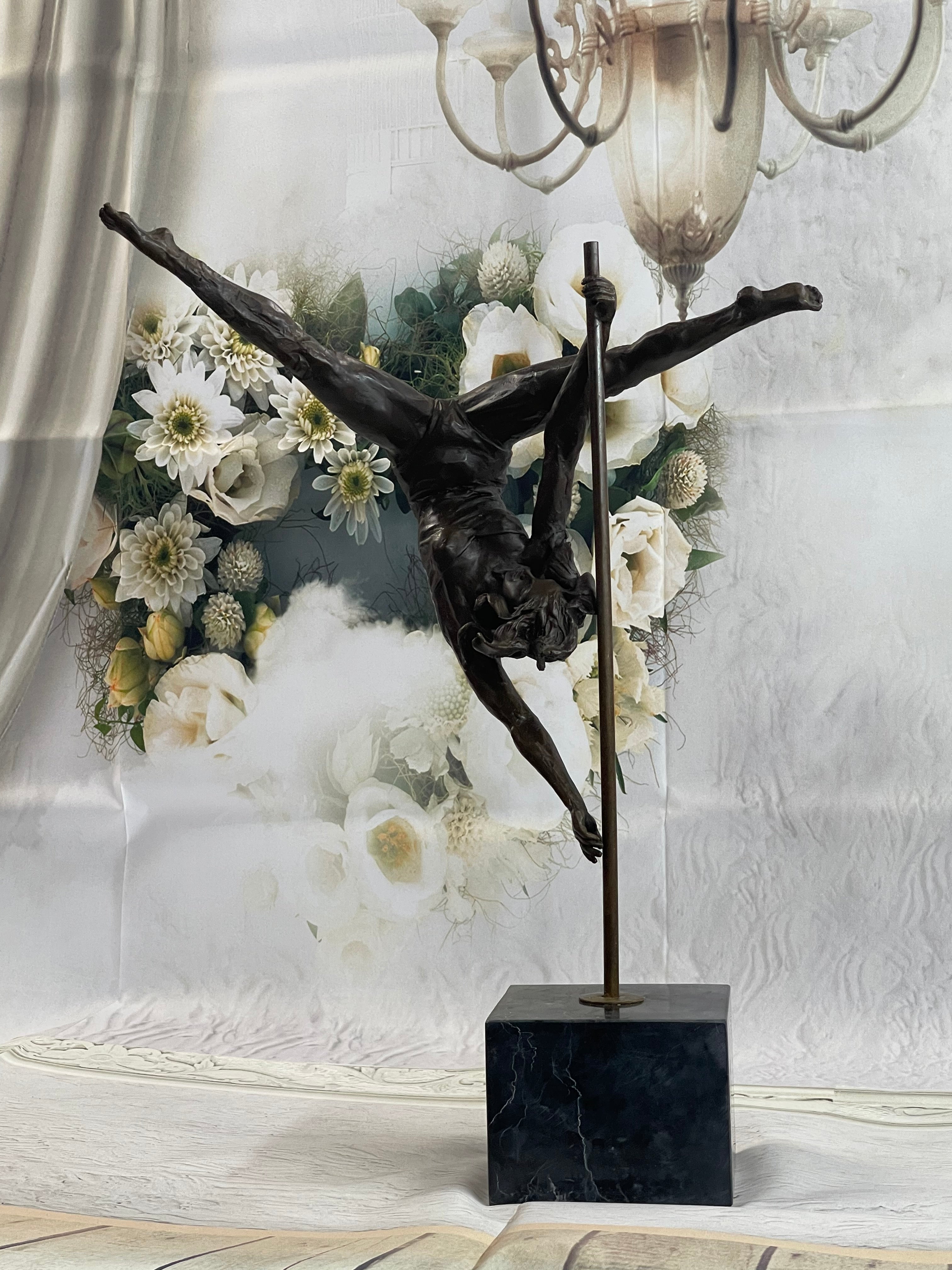 This woman is a talented Gymnast demonstrating her agility and flexibility. Balancing on a pole as she has trying to amuse you. Her muscular legs curve backwards and rests in her hands on her shoulders. She is semi nude that highlights her athletic body. This sculpture was crafted using the lost wax method. It mounted on a black marble base. It is signed by artist Aldo VitalehBronze Dimensions with Marble Base:Height 19" x Width 14.5"