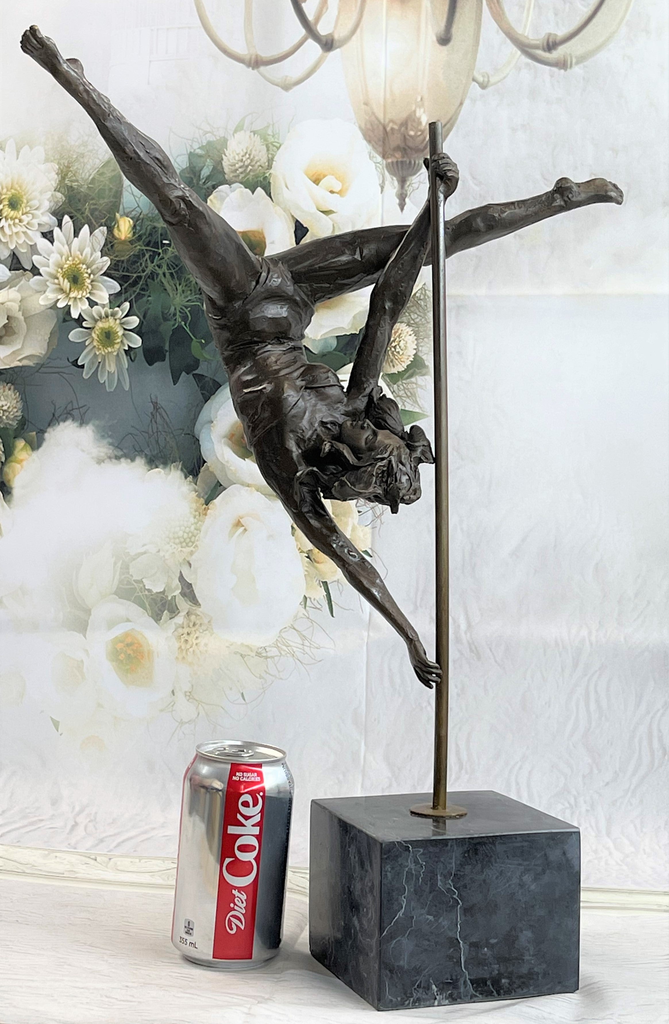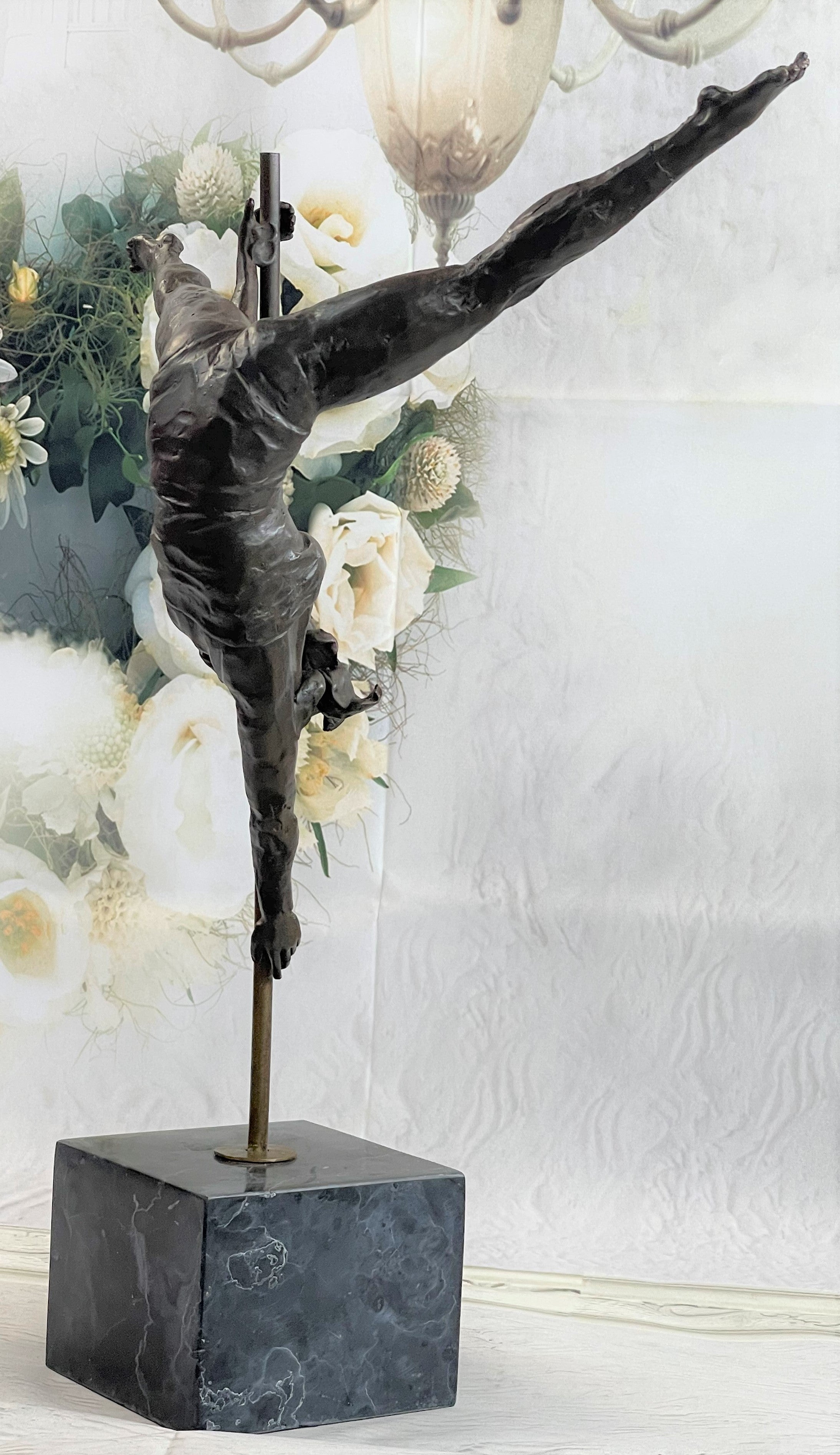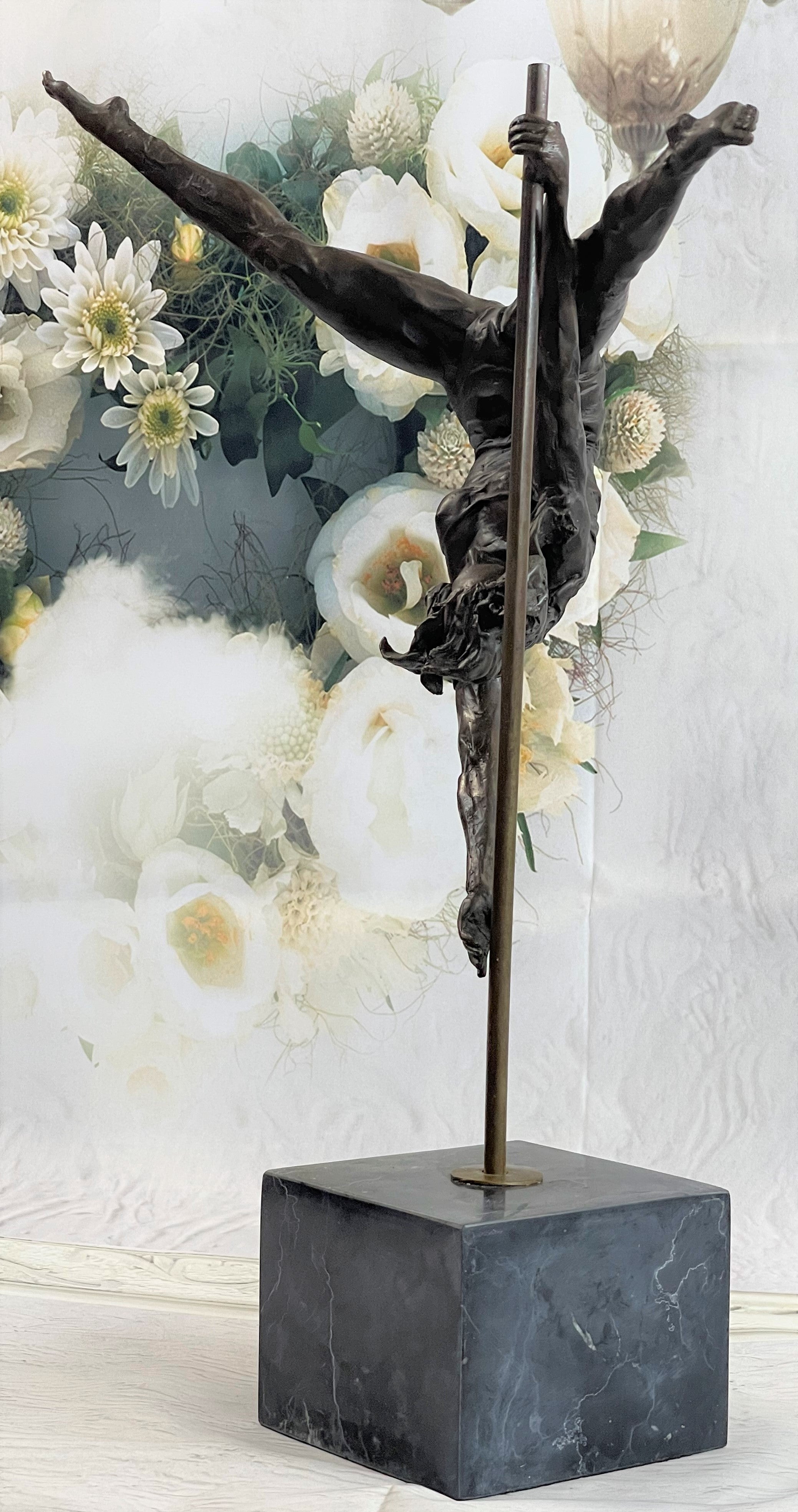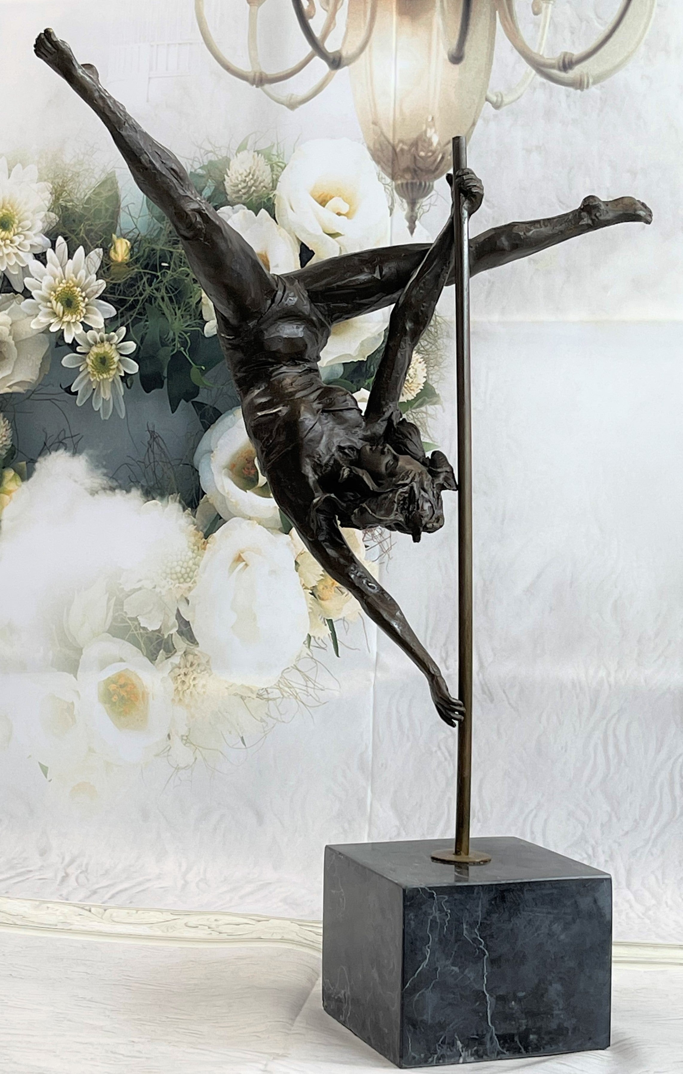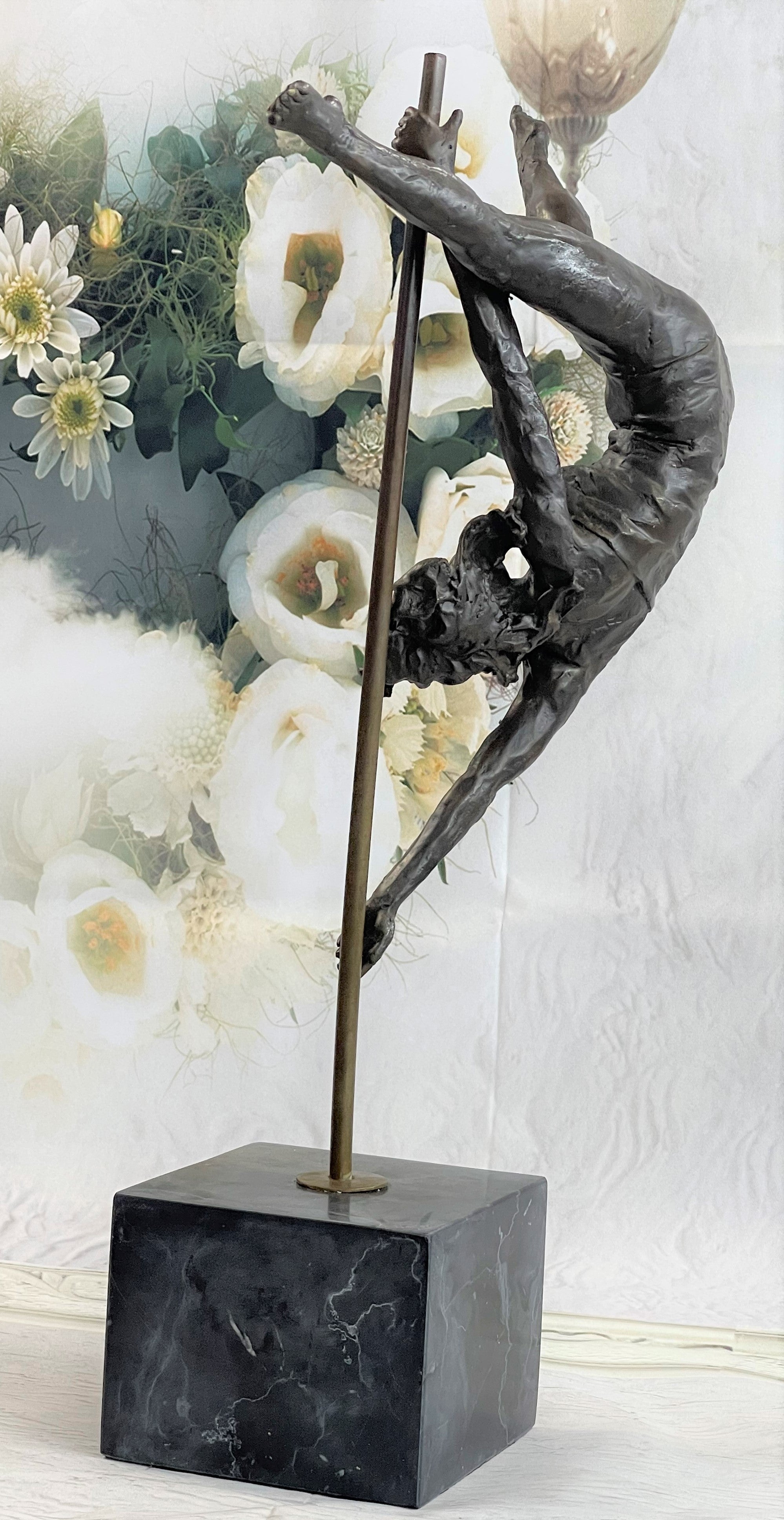 This woman is a talented Gymnast demonstrating her agility and flexibility. Balancing on a pole as she has trying to amuse you. Her muscular legs curve backwards and rests in her hands on her shoulders. She is semi nude that highlights her athletic body. This sculpture was crafted using the lost wax method. It mounted on a black marble base. It is signed by artist Aldo VitalehBronze Dimensions with Marble Base:Height 19" x Width 14.5"