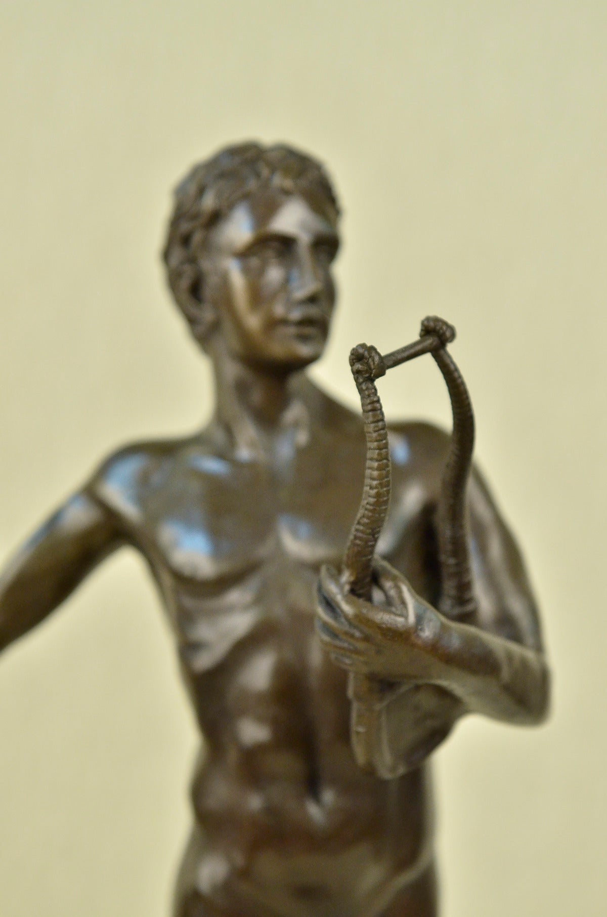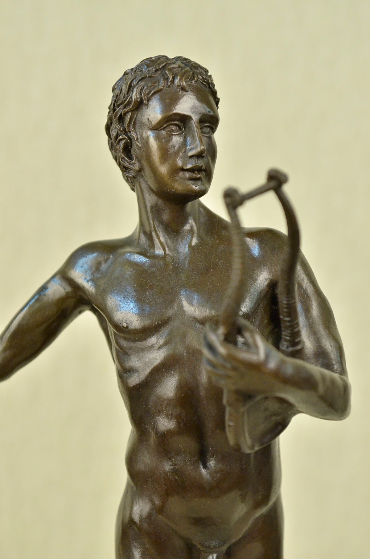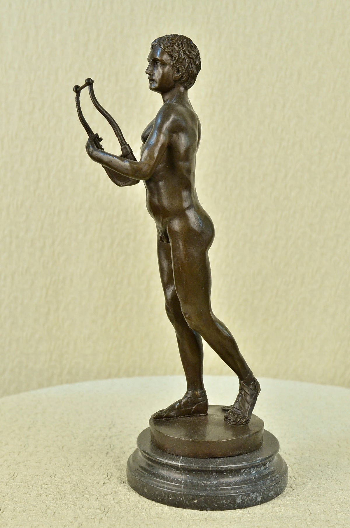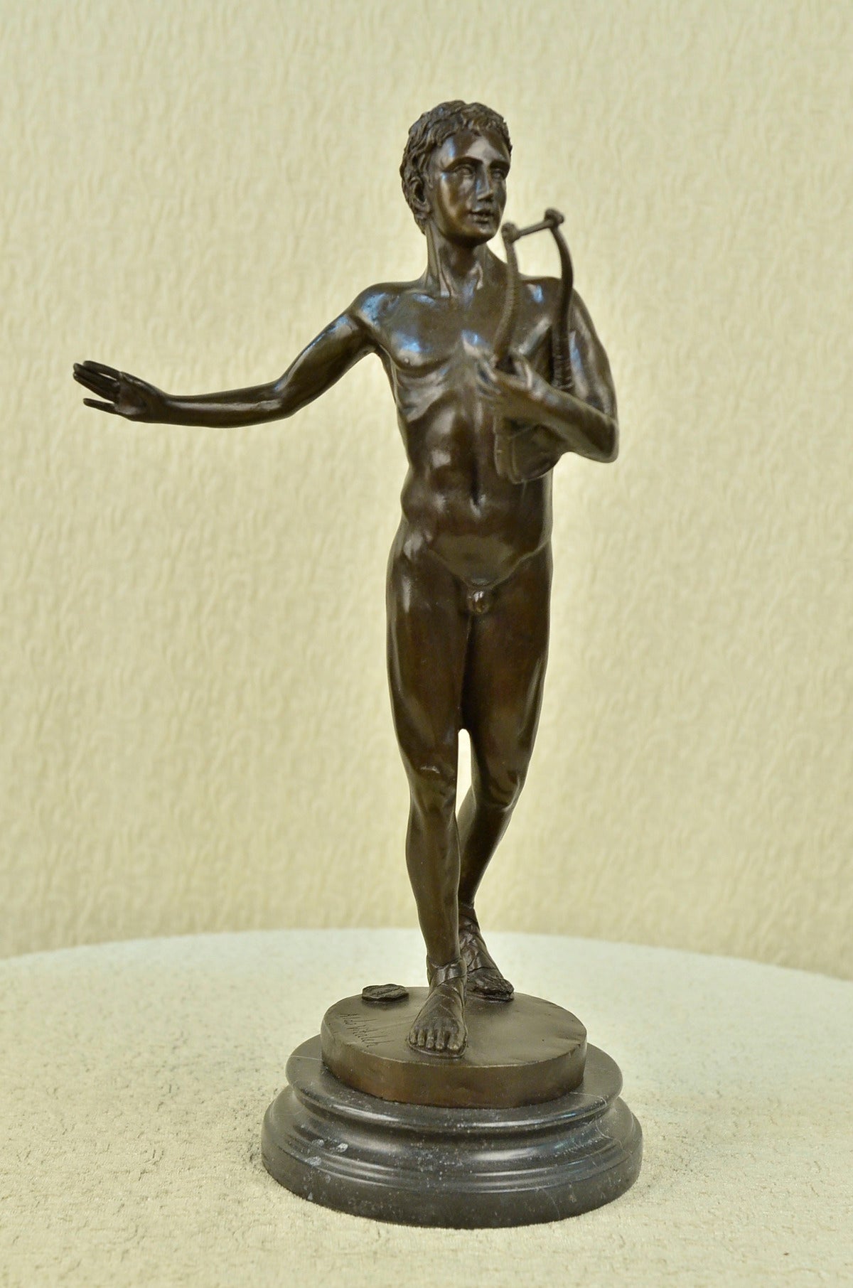 A robust young man walks freely in the outdoors. His instrument in his arm and his other swinging out preparing to grace the land with his soft music. The nude sculpture is striking and beautiful. It was crafted using the lost wax method. Signed by Aldo Vitaleh it stands on a black marble base.Original or Reproduction: Reproduction