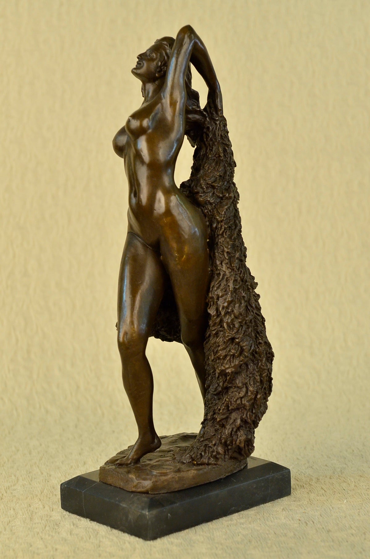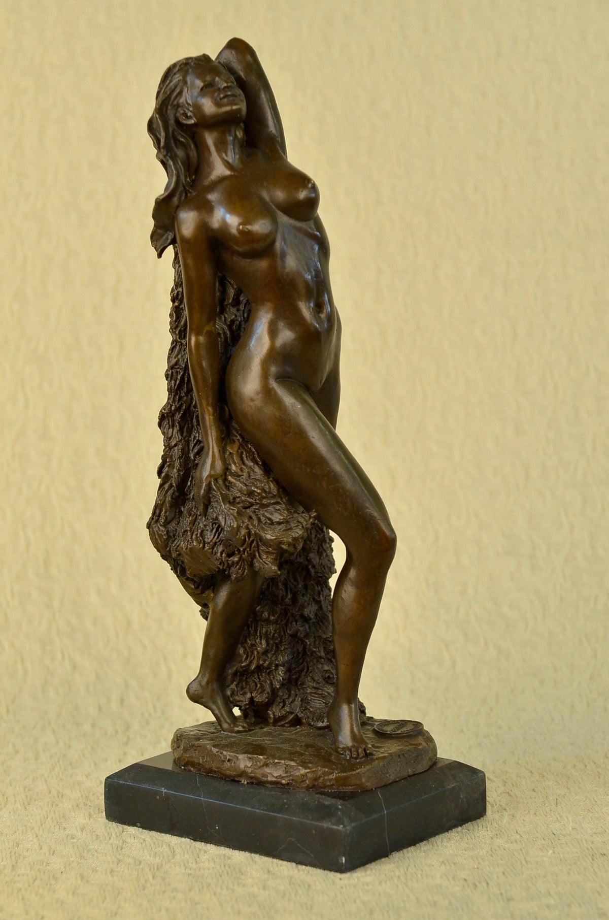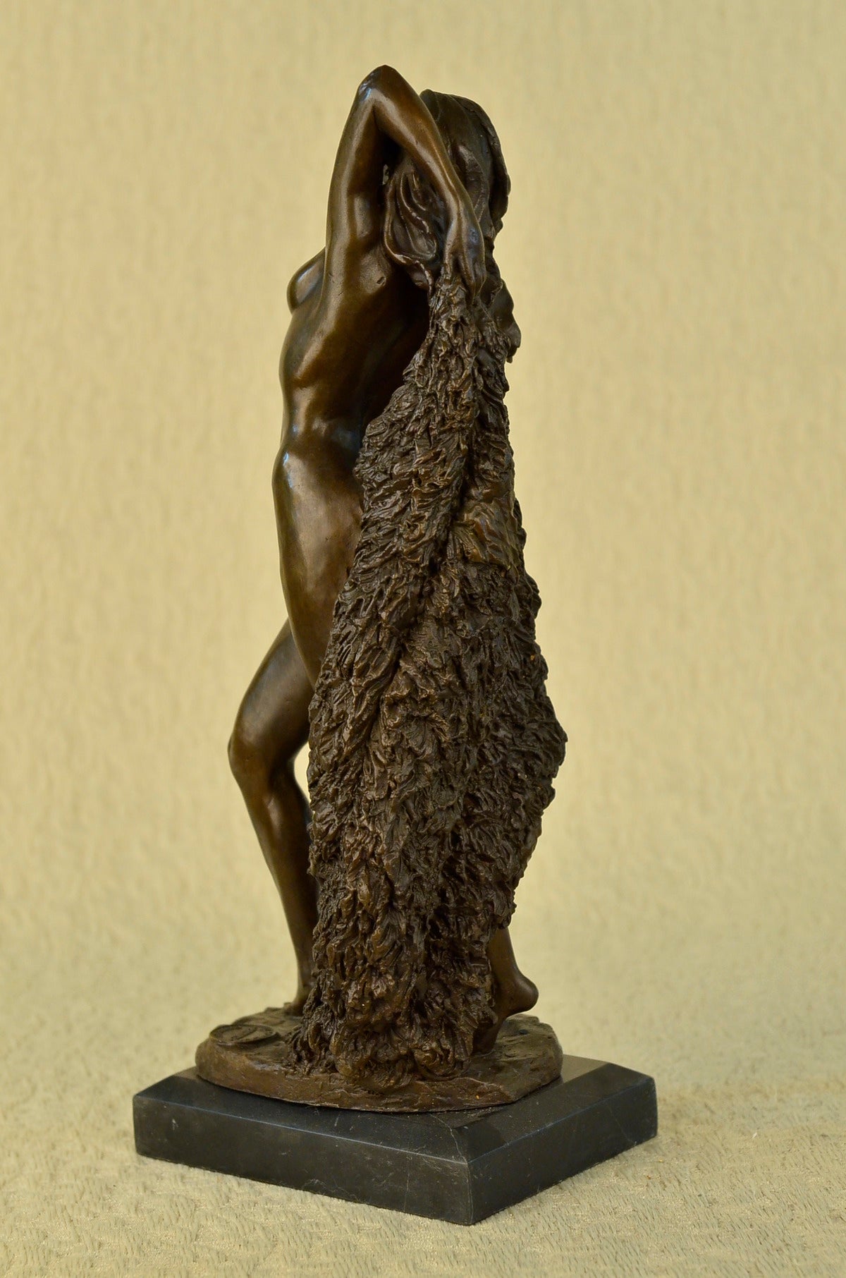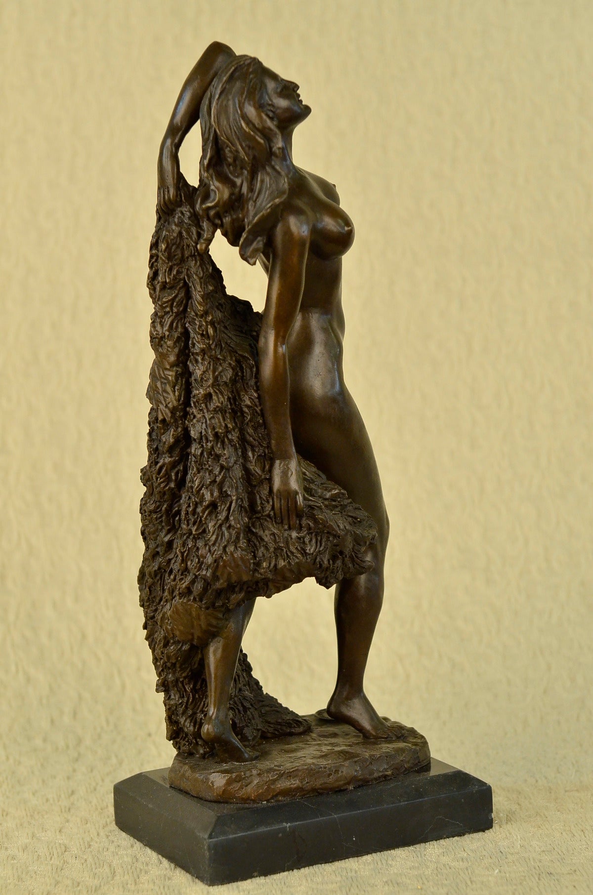 This Is A Depiction Of A Nude Girl Standing In A Manner Very Reminiscent Of A Model Pose. She Is Most Likely Standing On The Beach, Apparent By The Rock Structure She Is Standing On. She Slightly Hunches Her Body Over And Wraps Her Arms Around Her Head With A Look Of Absolute Contentment As She Enjoys A Cool Breeze Running Over Her. Her Face Is Exquisitely Detailed With Closed Eyes And Her Hair Cascades In A Wavy Pattern Down Her Slender Back. This Piece Forms A Beautiful Image Of Enticing Lines And Contours And Would Definitely Be A Great Addition To Any Space. It Has Been Cast Using The Lost Wax Method And Set Atop A Black Marble Base And Is Signed By Artist Aldo Vitaleh .