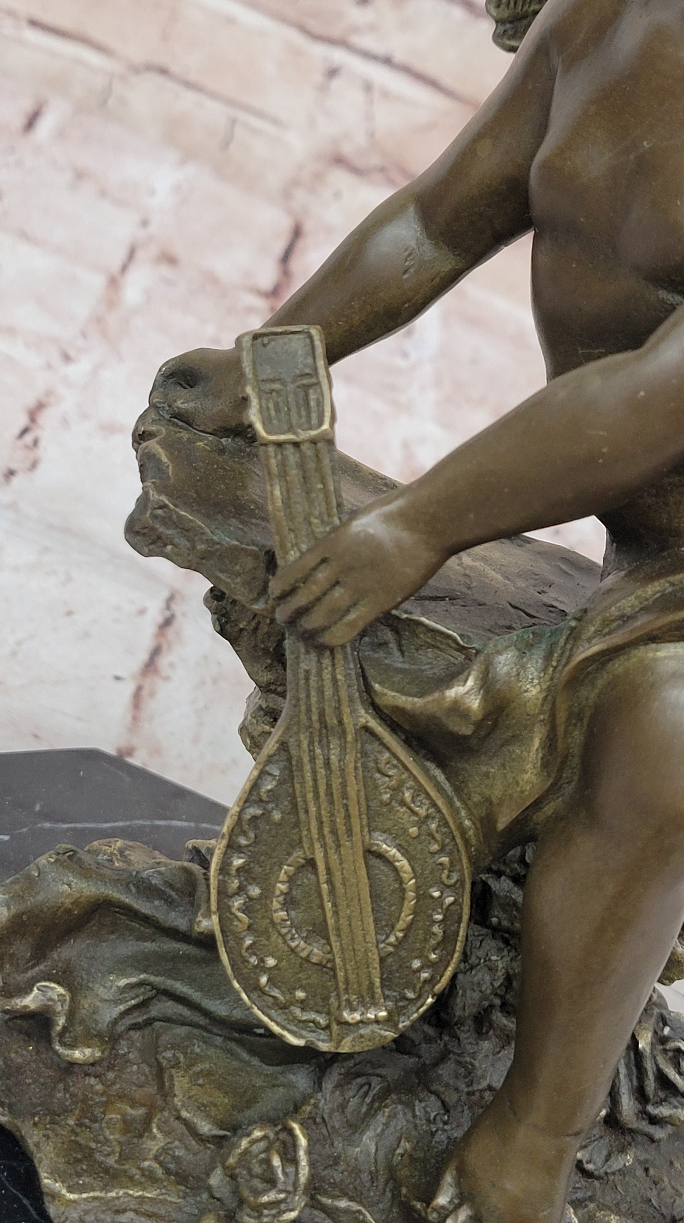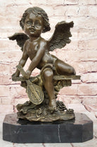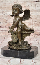 Bronze Cherub Putti Angel Sculpture with Mandolin on Marble Base