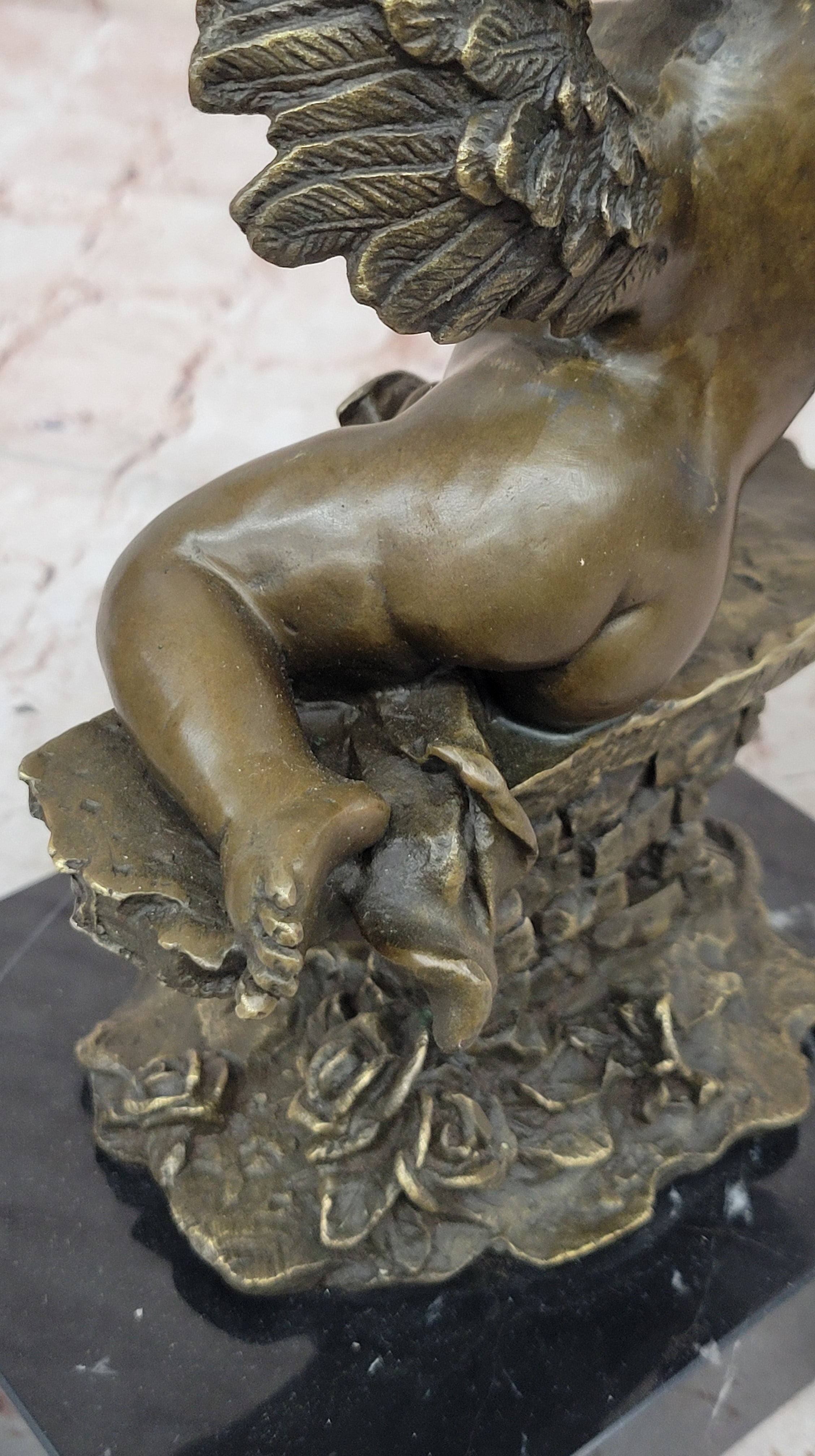Crafted with meticulous care and unwavering dedication, this exquisite sculpture embodies the timeless artistry of the lost-wax casting method, a revered technique that ensures unparalleled detail and authenticity in every sculpted feature. The rich brown patina finish, meticulously applied to the bronze surface, serves as a testament to the enduring beauty and durability of the sculpture, preserving its delicate features for generations to come. Poised upon a distinguished variegated black marble base, the cherubic angel exudes an aura of timeless elegance, a testament to the enduring allure and spiritual significance of heavenly guardians in art and mythology.