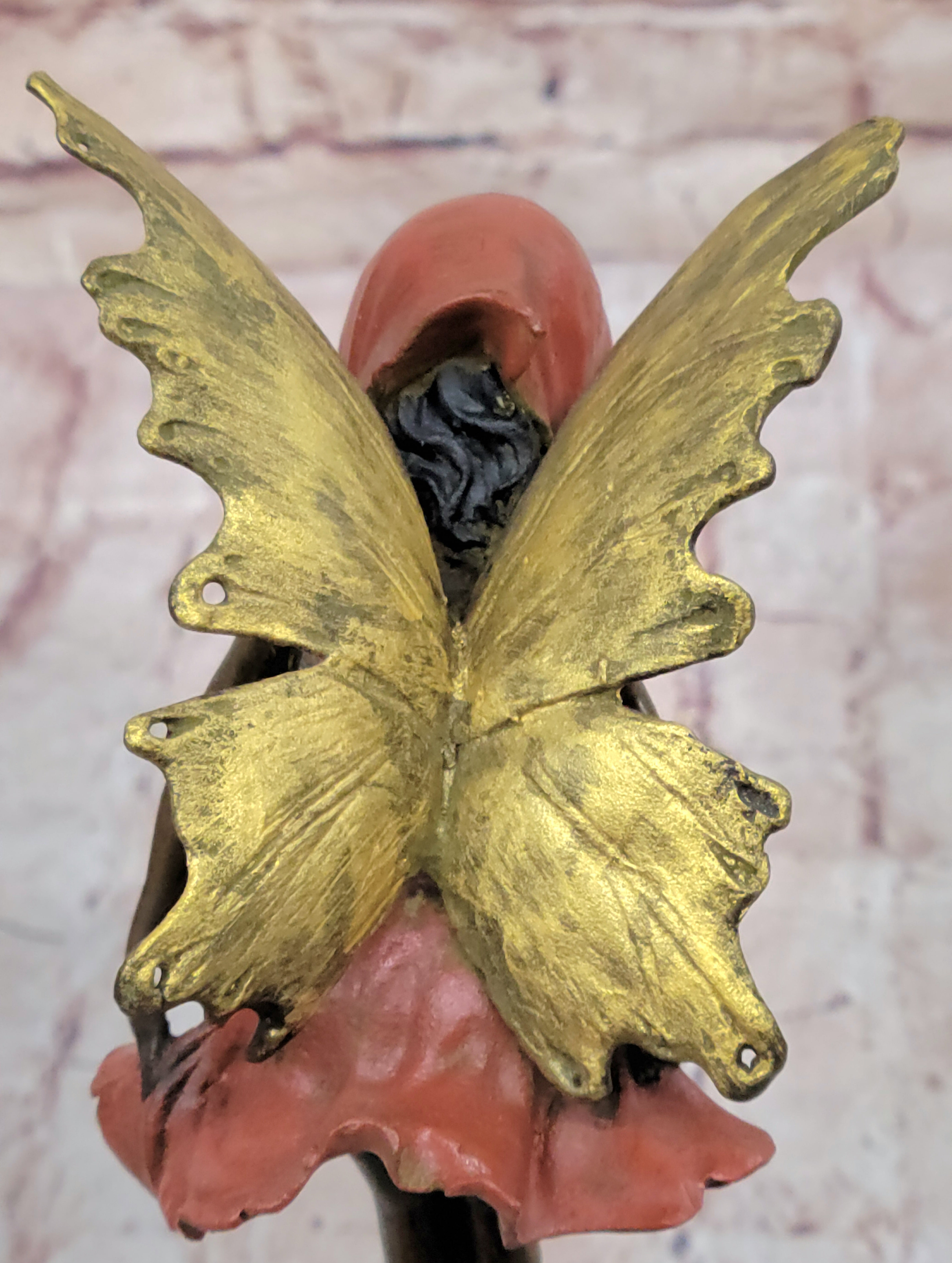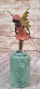 Bronze Metal Figure of Young Fairy Angel Winged Girl on Green Marble Base