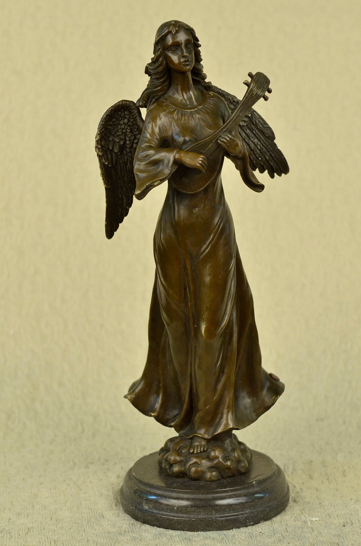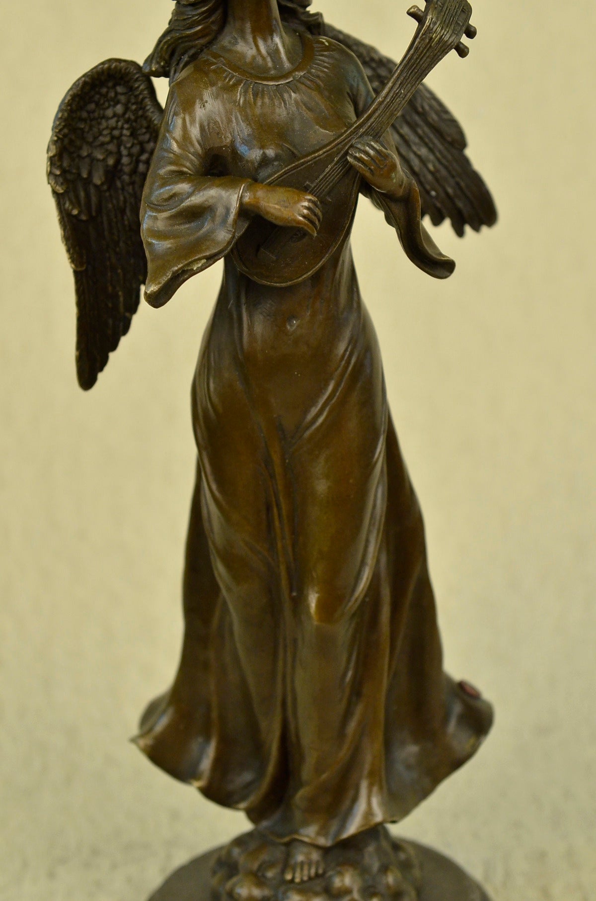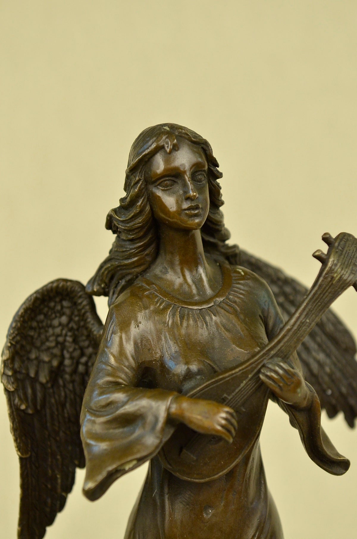 Bronze Sculpture Divine Angel Playing Lute Music Marble Base Figurine by Moreau