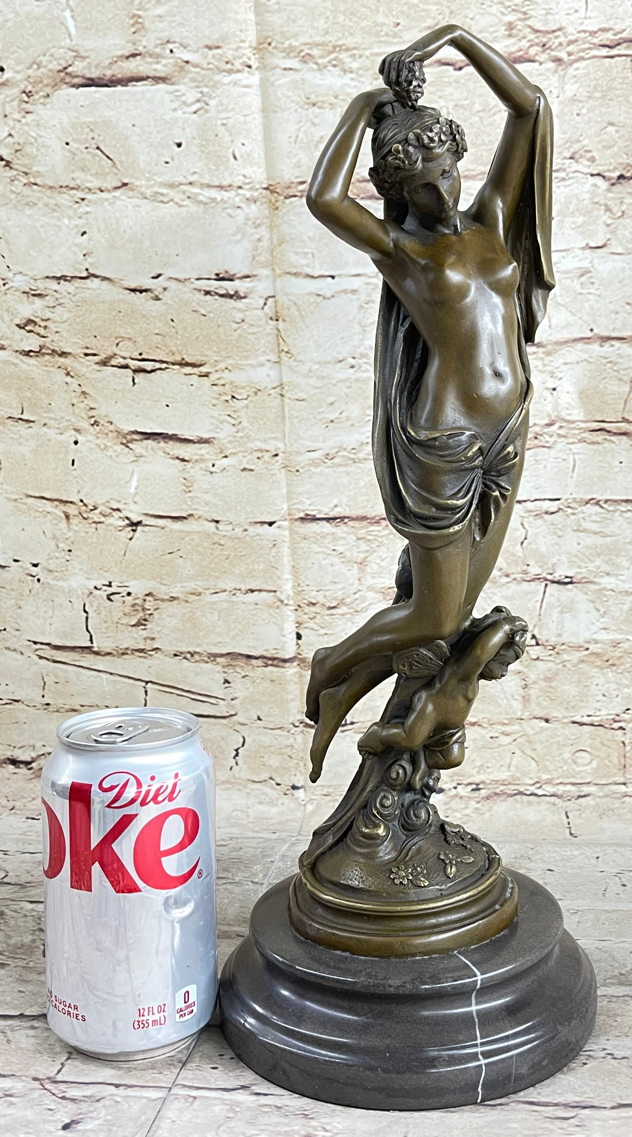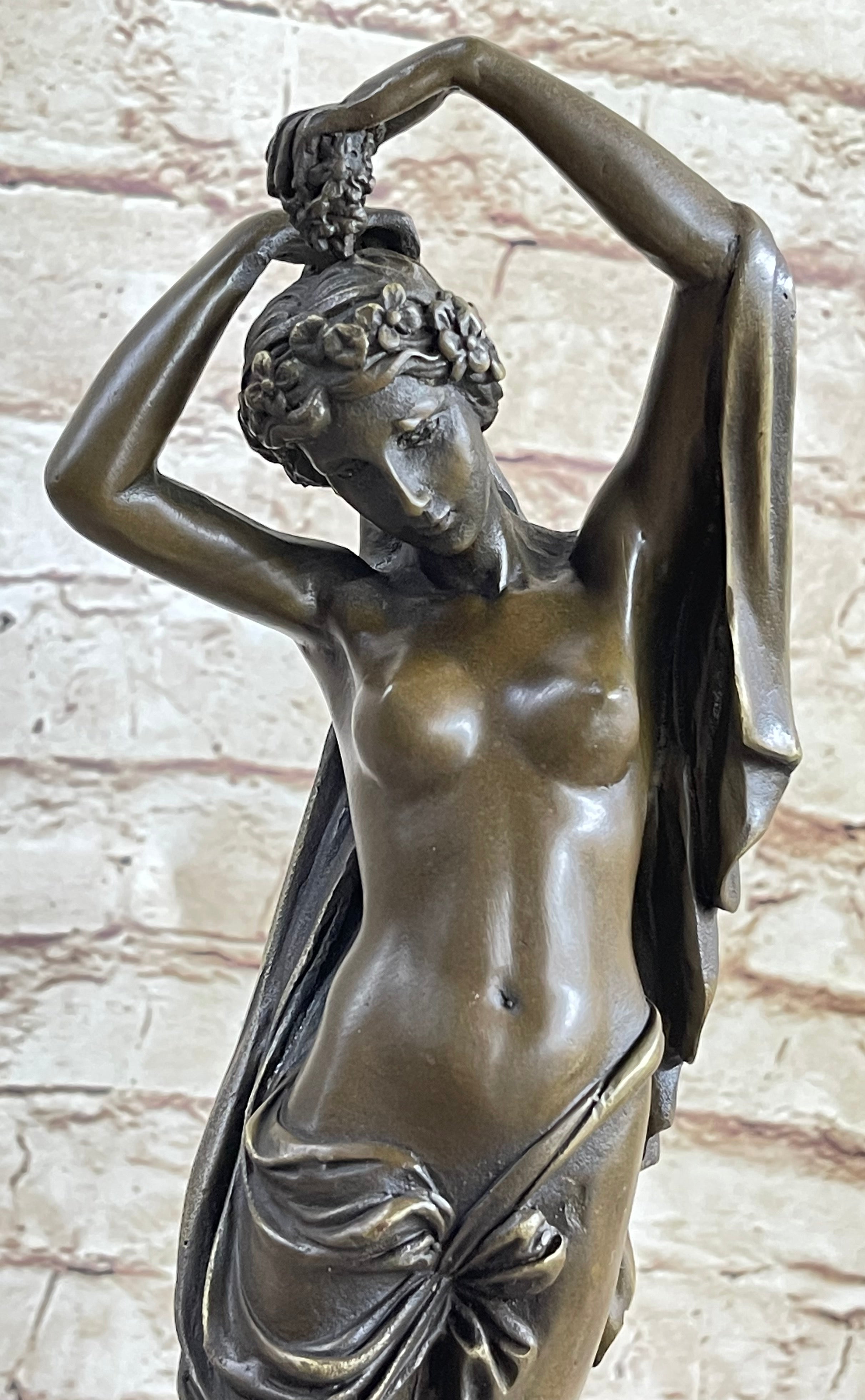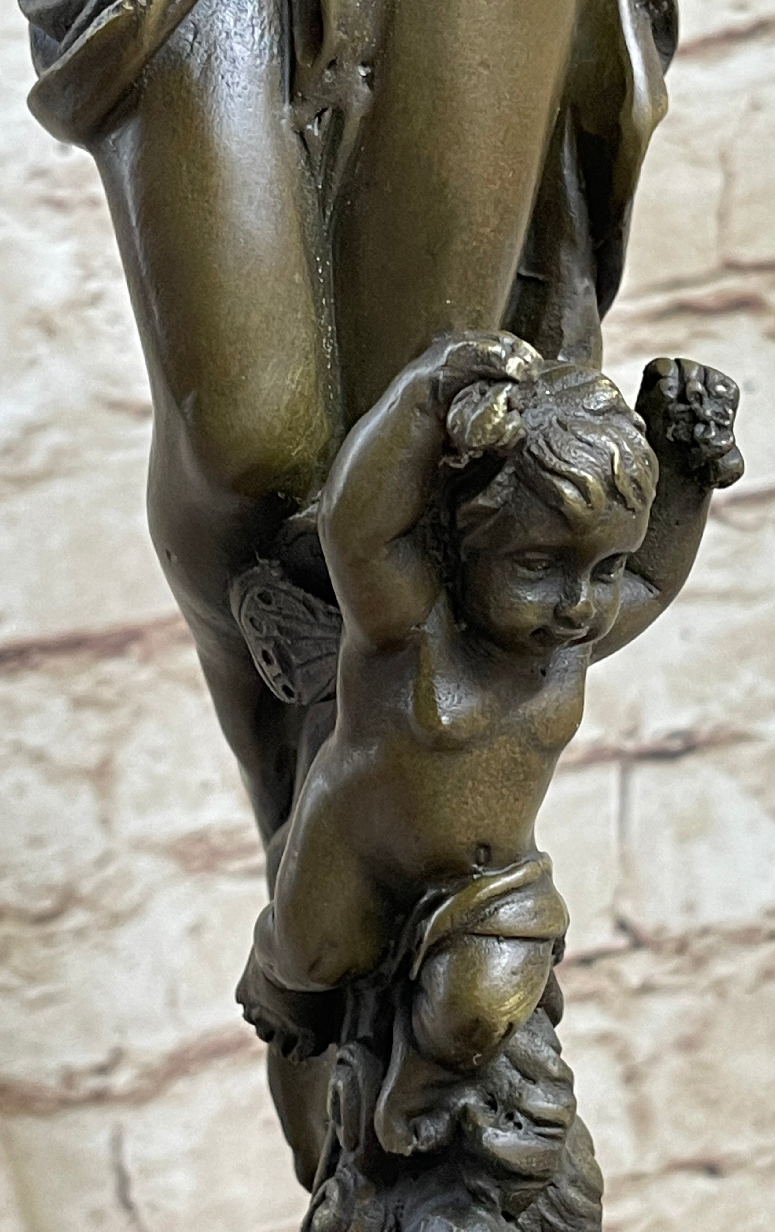 Embrace the beauty and grace of Hellenistic art with this stunning handmade bronze sculpture. Featuring a beautiful maiden gracefully riding on the back of a winged cherub, this sculpture captures the essence of mythology and natural elegance.