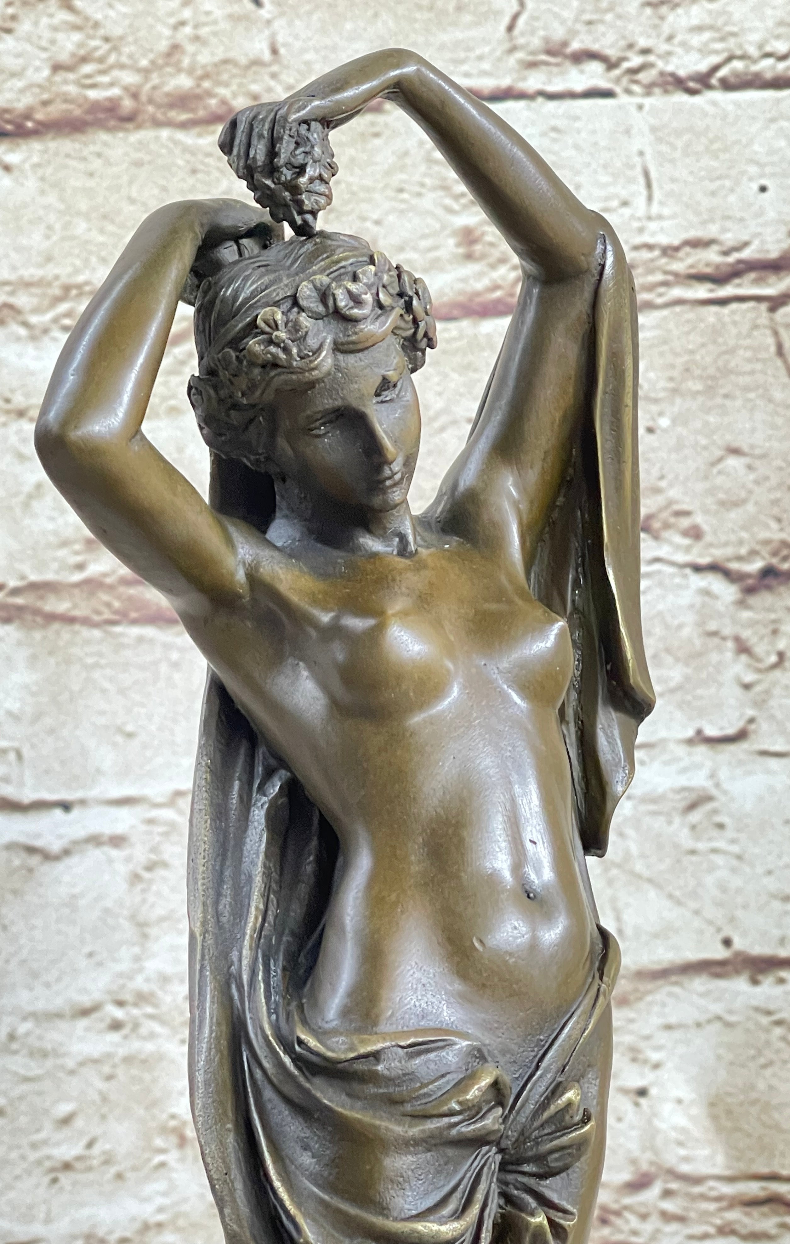 The intricate details in the sculpture showcase the skill of the artist in creating the flowing long robe that sinuates around the maiden's nude form. Both figures hold a bundle of flowers above their heads, symbolizing the joy and beauty of life.