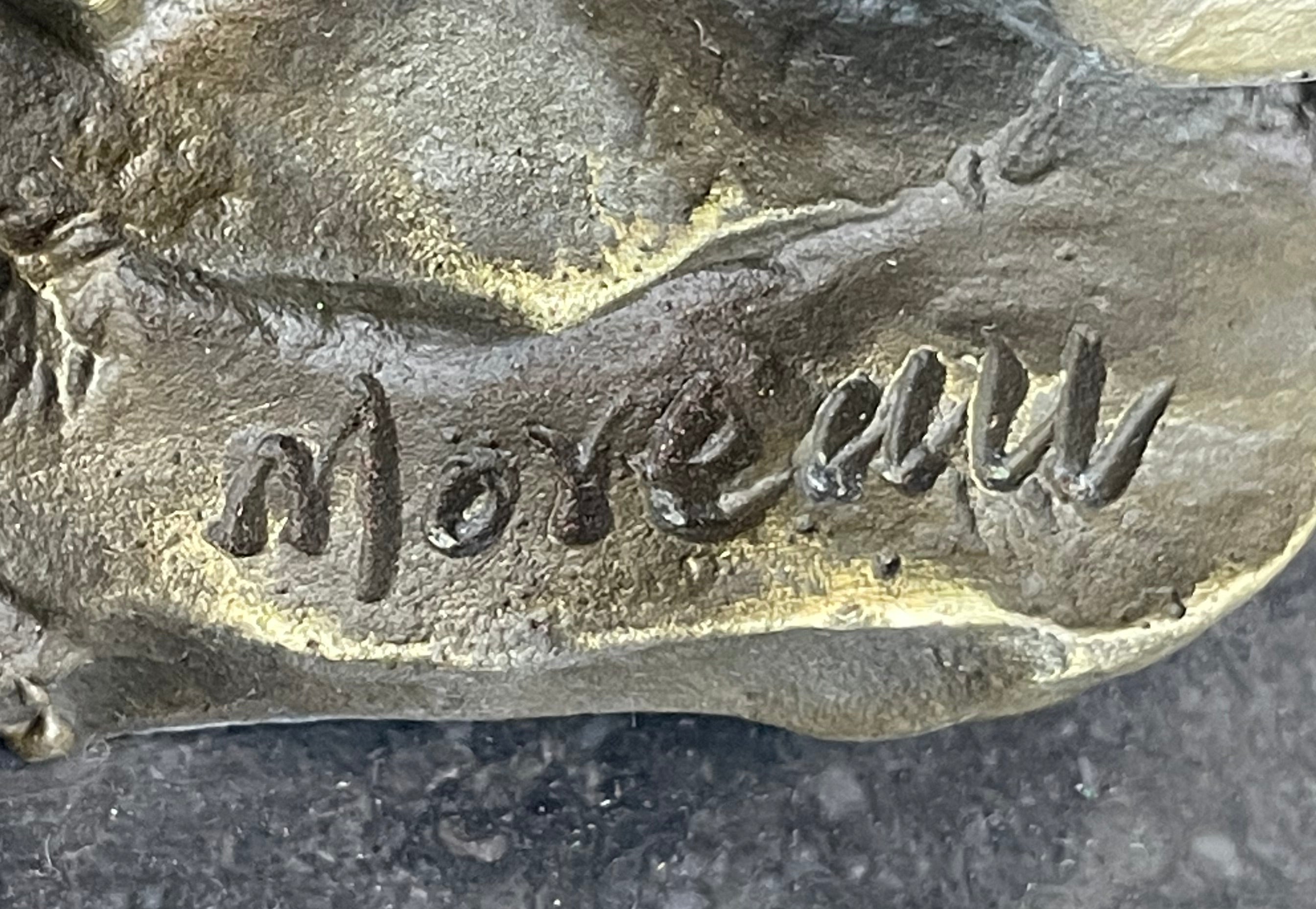 The quality of this celestial masterpiece is underscored by the signature of the artist Moreau, establishing a connection between the viewer and the skilled hands that brought this angelic vision to life. Whether displayed in a sacred space, a serene garden, or a contemplative corner of a room, this sculpture becomes a focal point, inviting viewers to bask in the serenity and beauty encapsulated by the divine angel. The harmonious combination of form, expression, and craftsmanship makes this sculpture a timeless tribute to the celestial realm.Bronze Dimensions with Marble Base: Height 12.5" X Width 6.5"