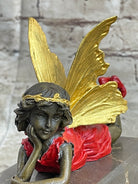 Colorful Resting Fairy Girl Child Bronze Metal Figurine Sculpture on Marble Base
