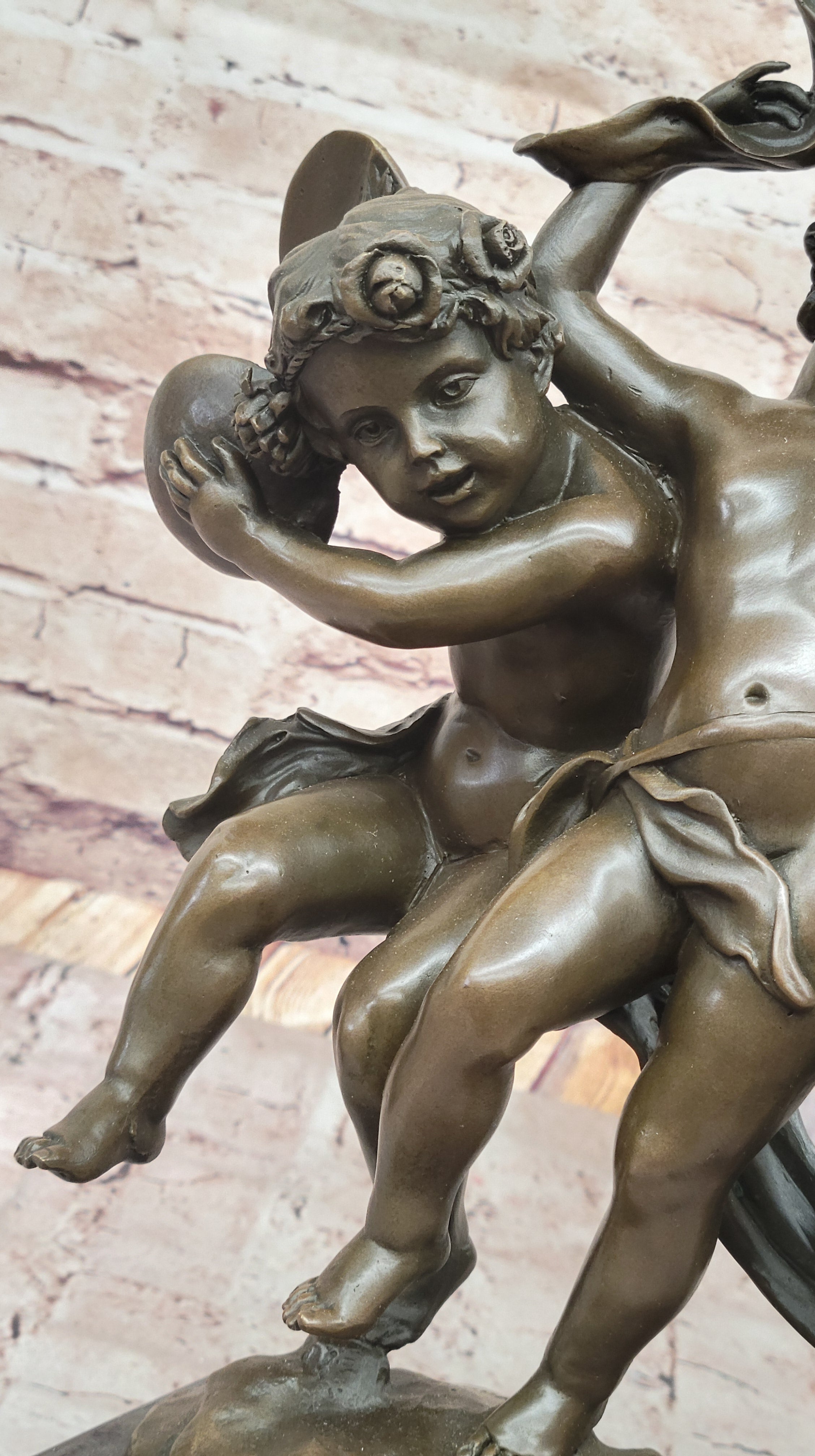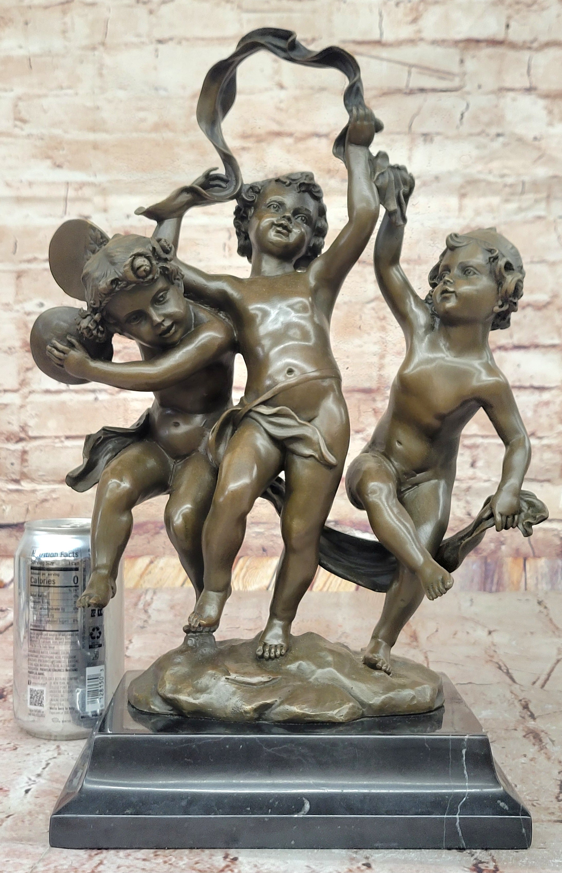 Handcrafted using the lost wax method, this sculpture showcases the artist's mastery of the technique, ensuring every detail is captured with precision. The rich brown patina adds warmth and depth to the figures, while the hot cast bronze provides a durable, lasting finish. The texture and finish give the sculpture a sense of depth, highlighting the putti’s playful interaction as they dance together.