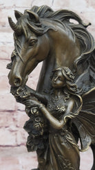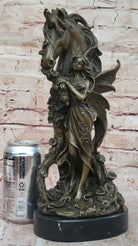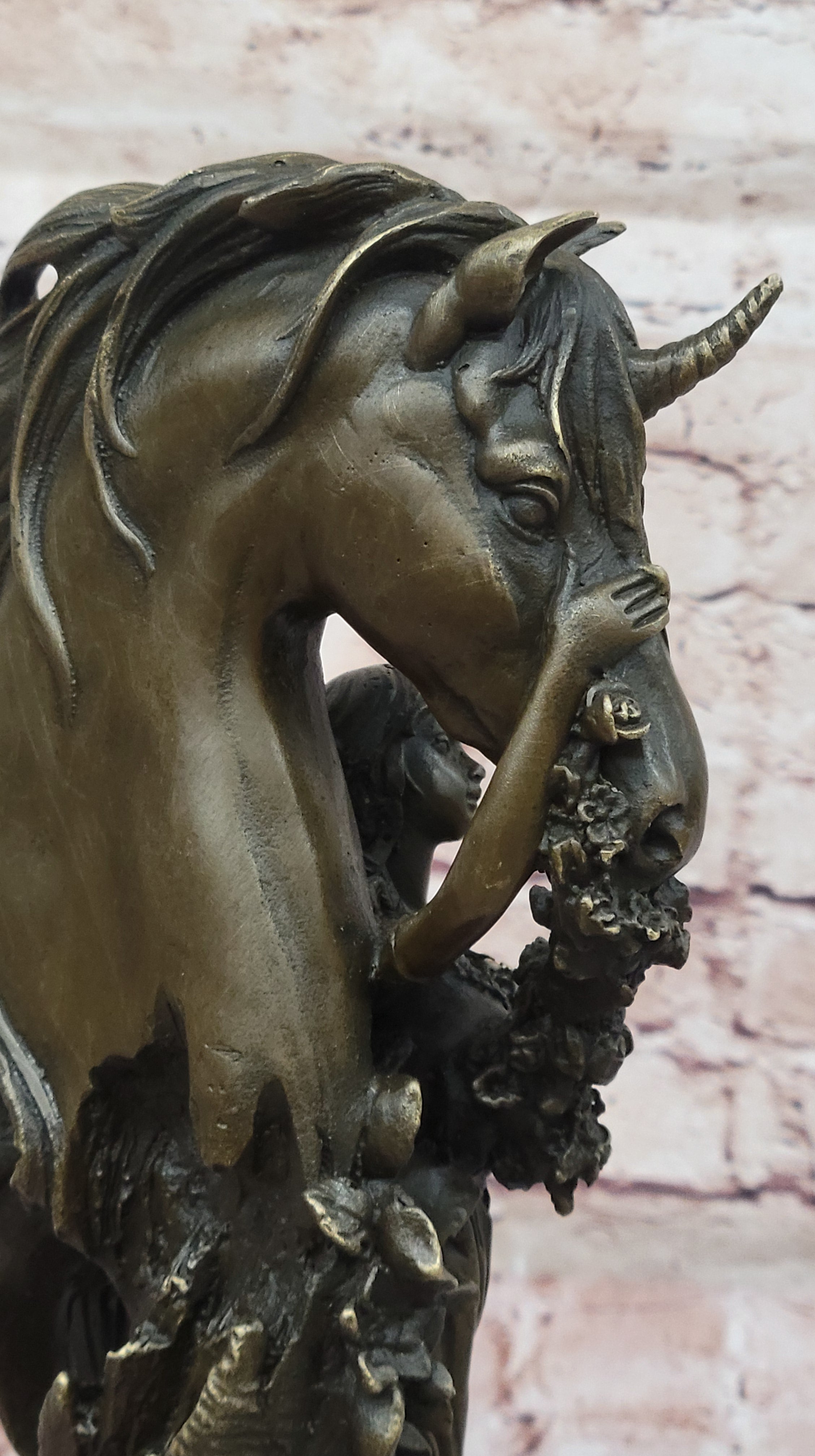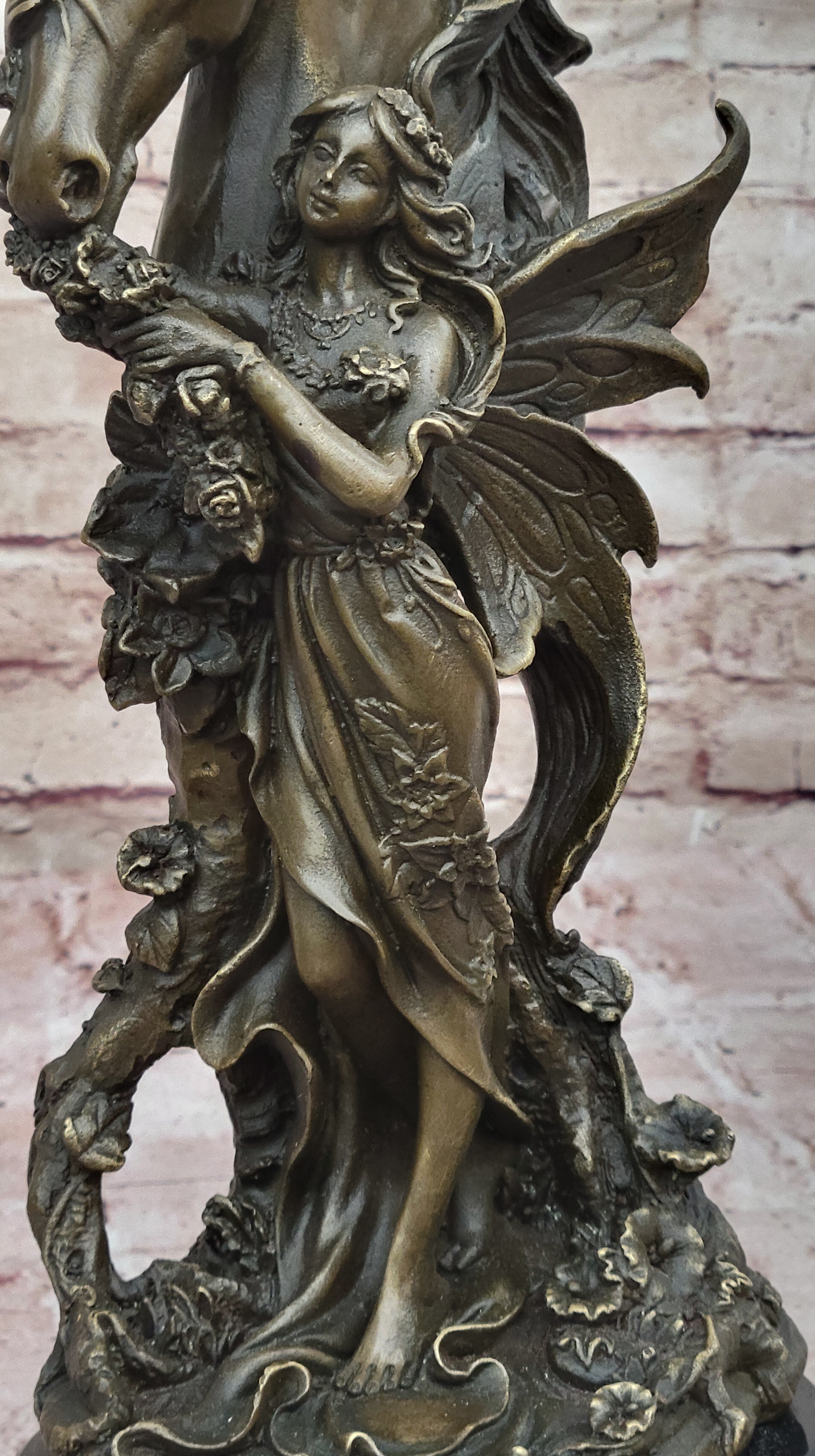 Invite the magic and wonder of this enchanting bronze sculpture into your home or collection. It serves as a testament to the power of imagination and the enduring allure of mythical creatures. Delight in the beauty of this exquisite piece, which effortlessly transports you to a realm where fairy maidens and unicorn-horned horses roam in harmony.Bronze Dimensions with Marble Base: Height 13.5" X Width 7"