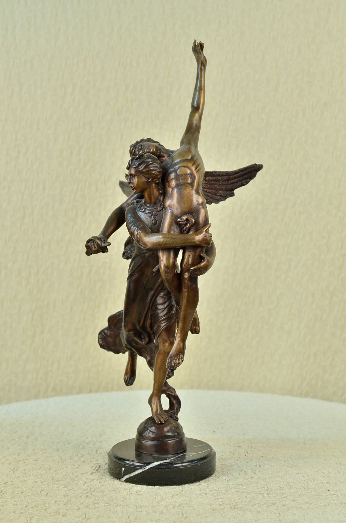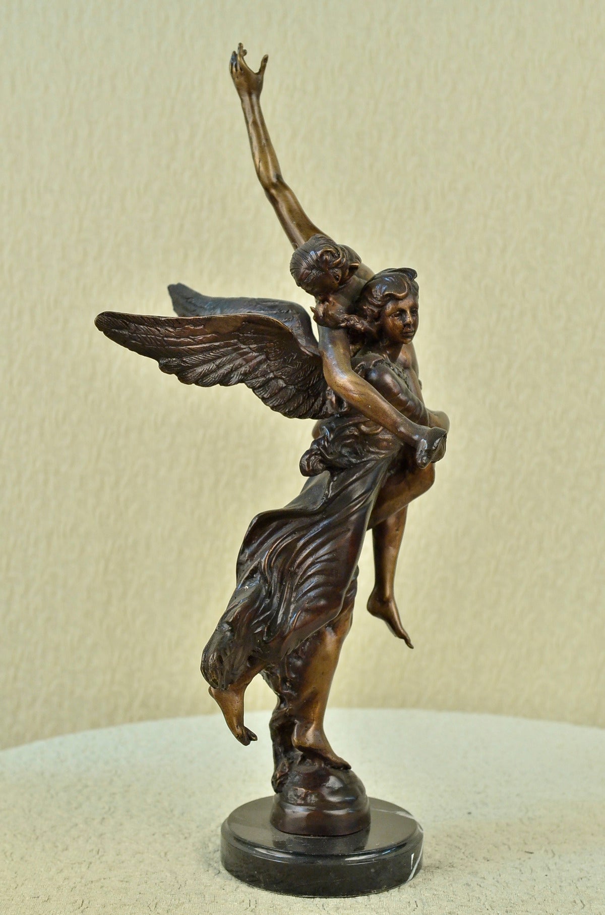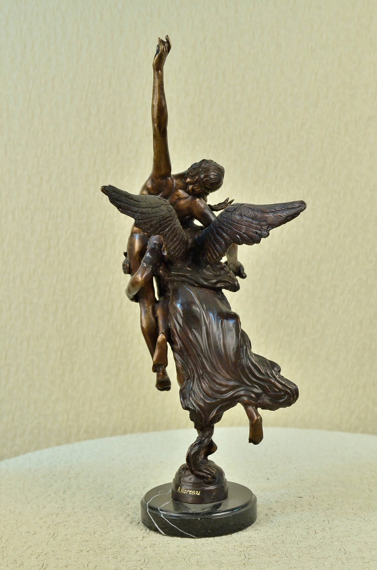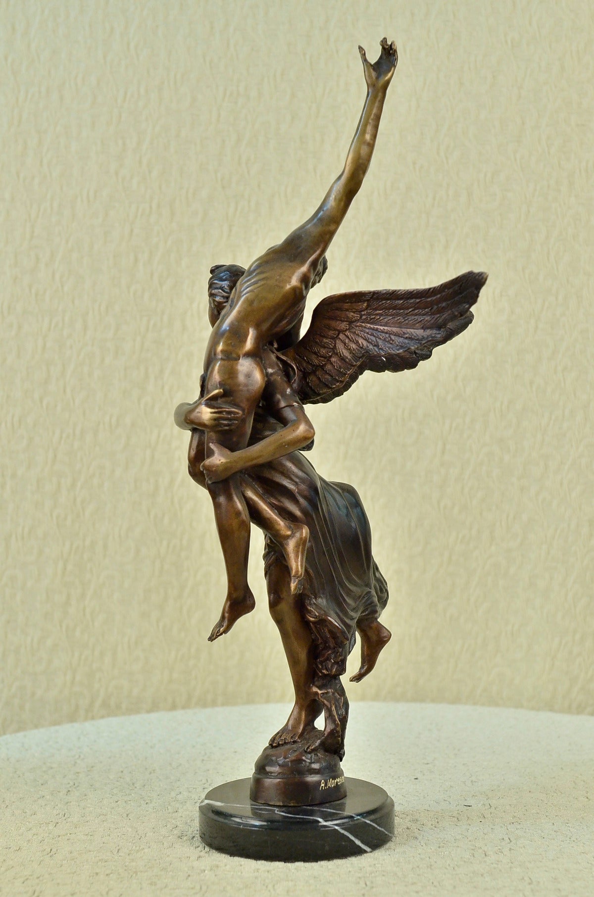 An angel is a messenger of god and a protector of life. This angel lifts a man over her shoulders and takes him to safety. Her grand wings span behind her as she runs to safety. He is lifeless on her shoulders and his head flops to the side. 100% bronze and handmade, this brown patina sculpture was cast using the "Lost Wax Method" and mounted on a marble base. It features the signature A. Moreau. Auguste Moreau (1834 to 1917) was born in the early 19th century and studied under Mathurin Moreau. Auguste Moreau worked as a sculptor and specialized in figures, statuettes and groups, mainly in marble. He made his debut at the 1861 Salon in Paris and continued to play an active part in the Salon des Artistes Francais as a member of the Societe des Artistes Francais until 1910.Original or Reproduction: Reproduction