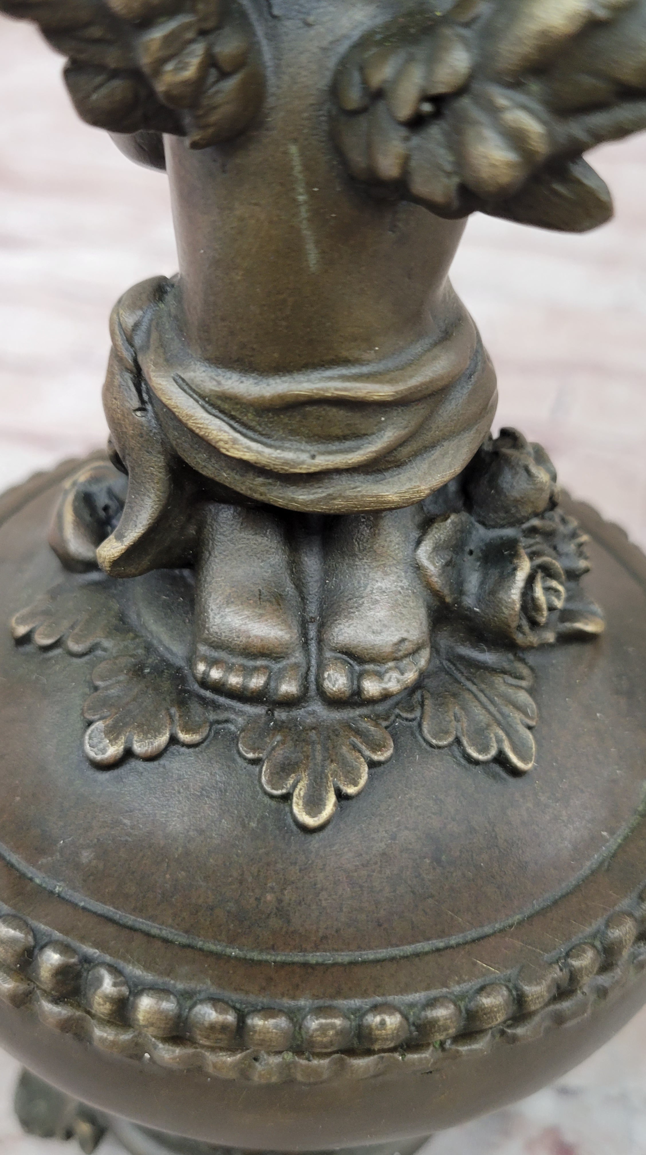 Crafted with meticulous attention to detail, this piece showcases the characteristic curving, flowing form that adds a touch of elegance and sophistication. The striking antique bronze finish enhances its rich details, providing a timeless look that will captivate viewers and add lasting visual interest to your decor. The combination of the serene putti and the intricately designed base makes this jewelry box a wonderful gift for anyone who loves baby angels or finely crafted jewelry boxes.