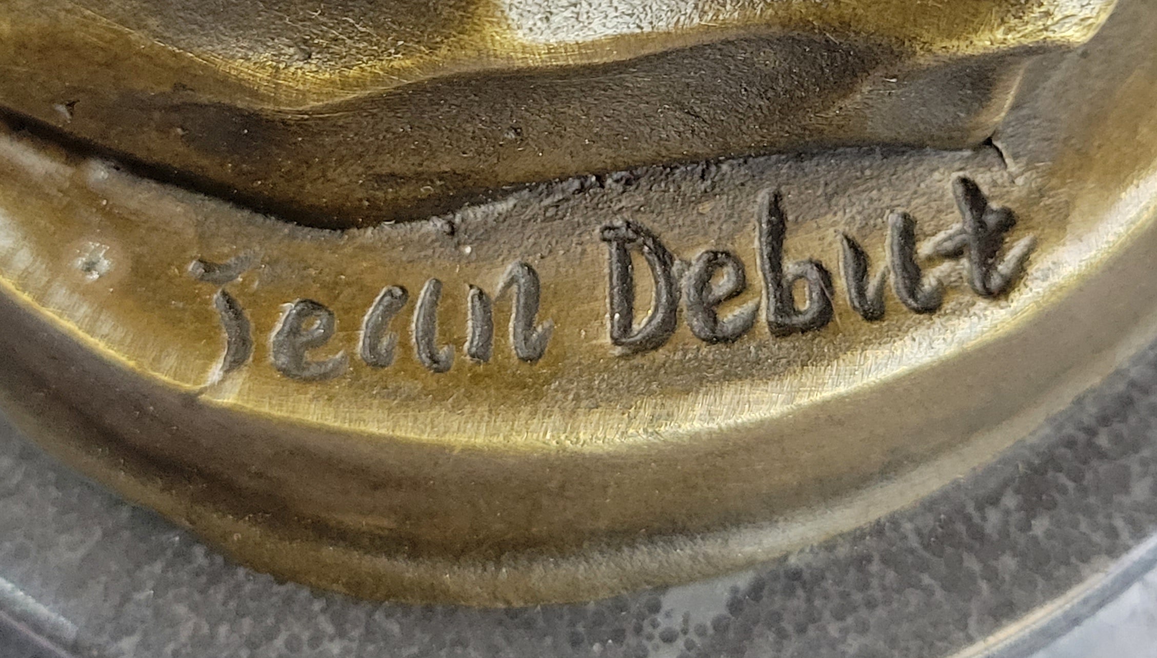 The sculpture is mounted on a tall, intricately adorned bronze stand that adds grandeur and vertical emphasis to the piece. Every element, from the subtle drapery folds to the refined musculature and fine detailing of the base, reflects masterful artistry. Made entirely from bronze using the time-honored lost wax method, the work is a testament to both traditional technique and timeless beauty. It is signed by the renowned artist Jean Debut, adding provenance and value to this exceptional creation.