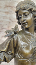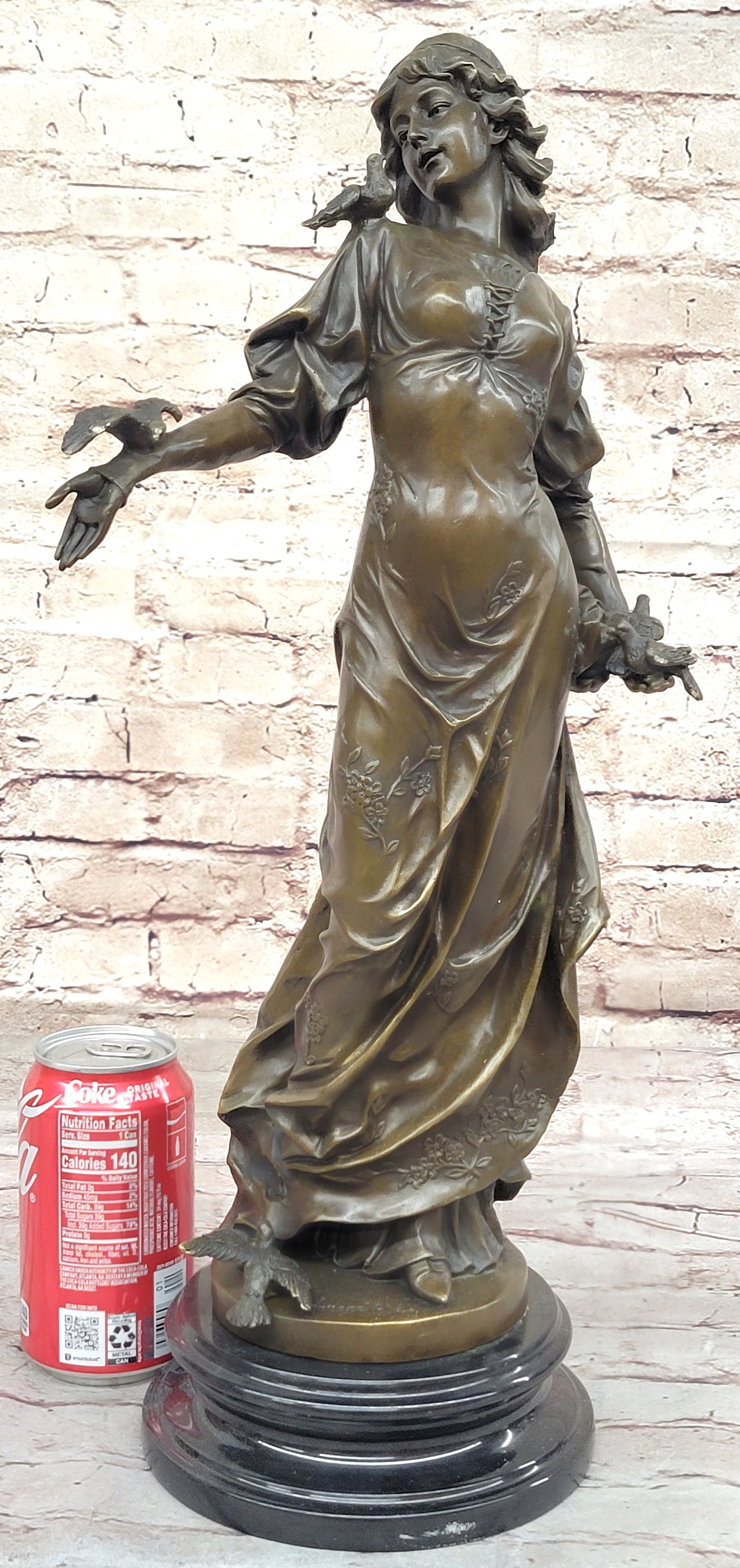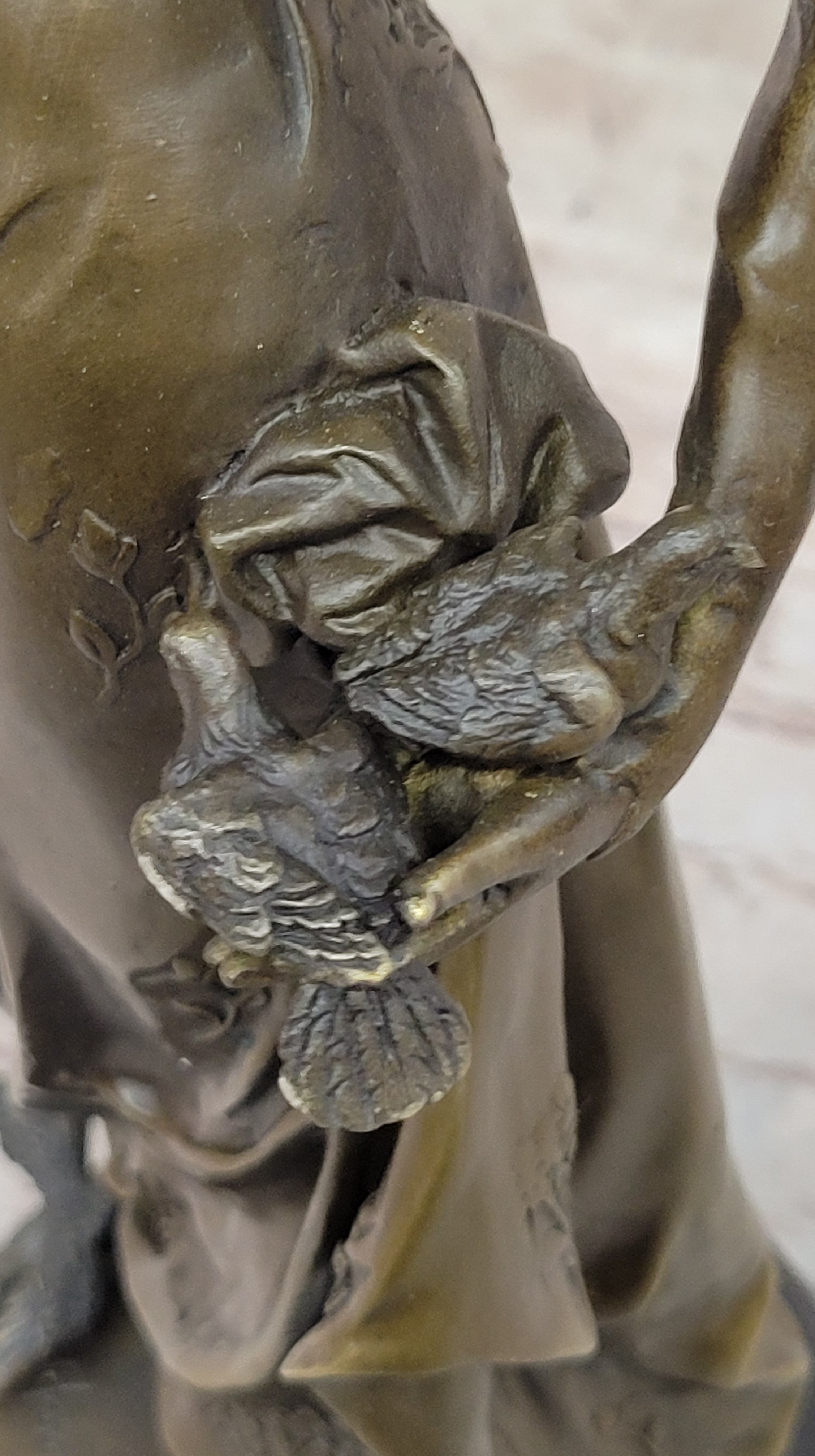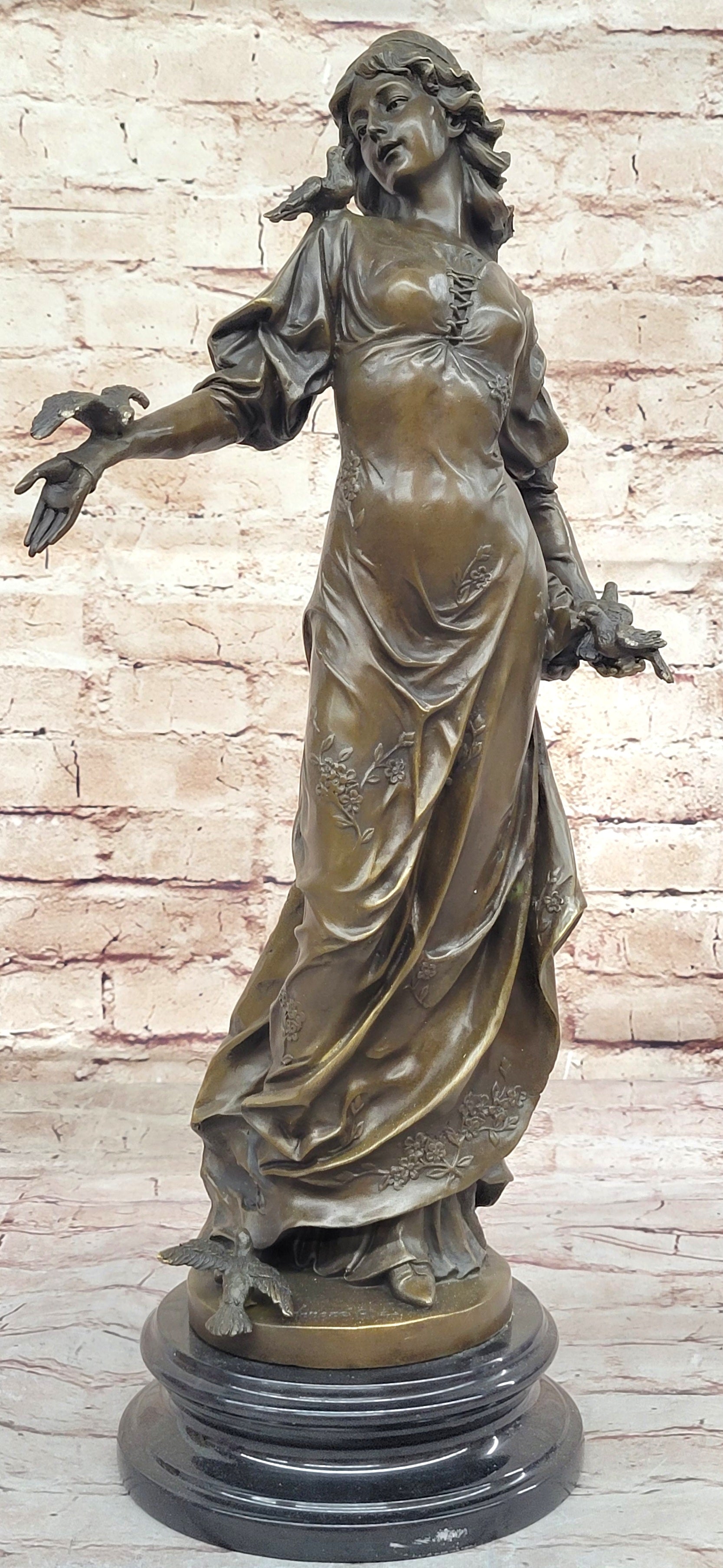 This stunning bronze sculpture captures the timeless beauty of a nude woman tenderly holding a bird, showcasing exquisite craftsmanship and attention to detail. Sculpted from all angles with remarkable precision, the piece exudes a sense of life and vitality, drawing viewers into its captivating composition.