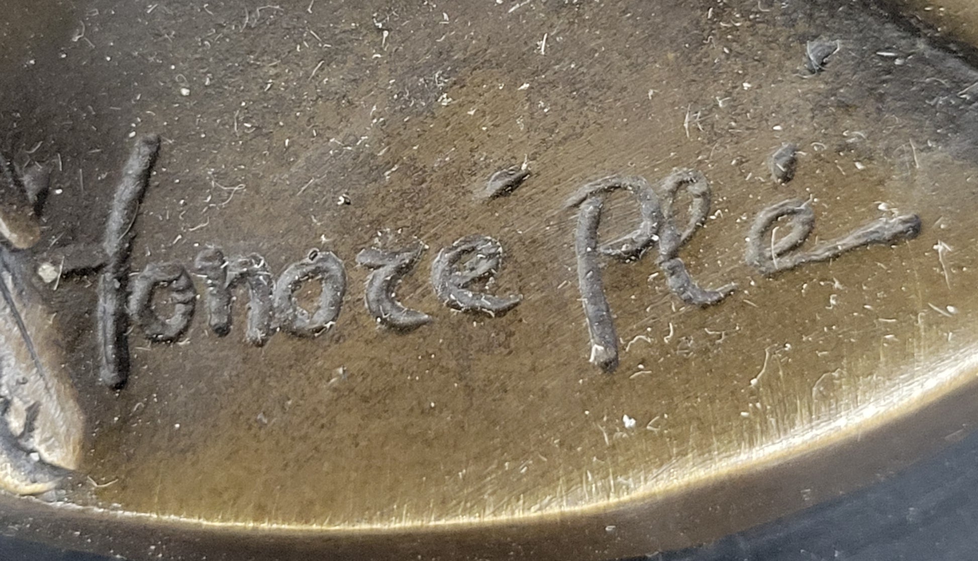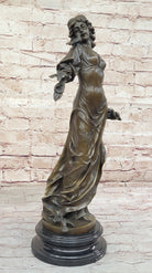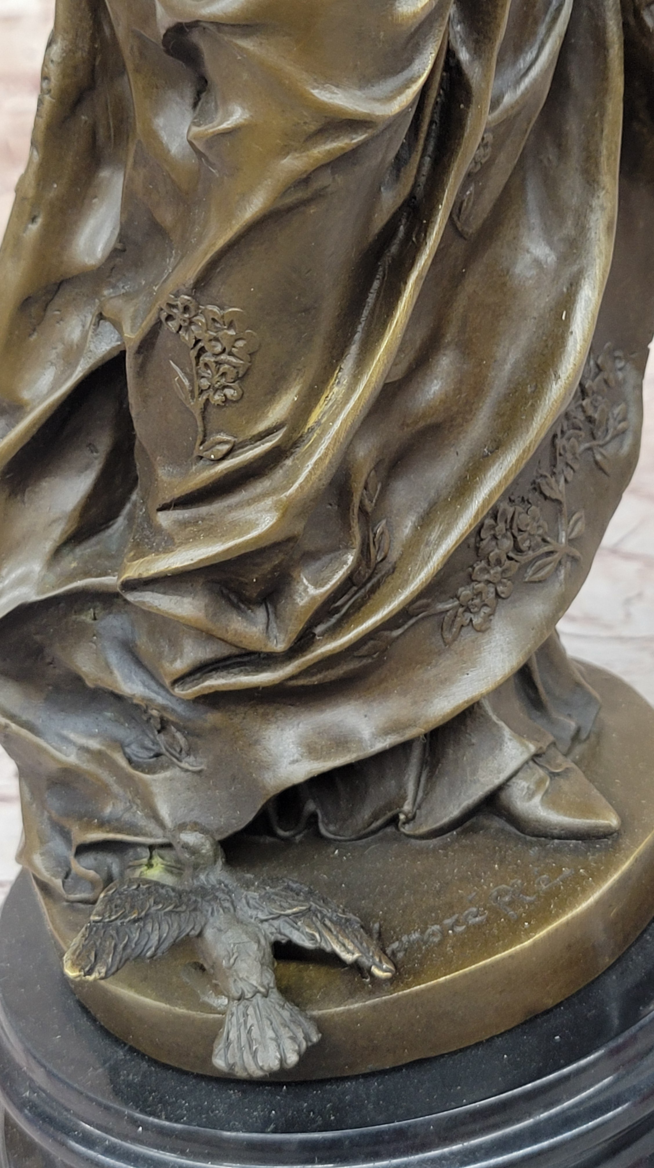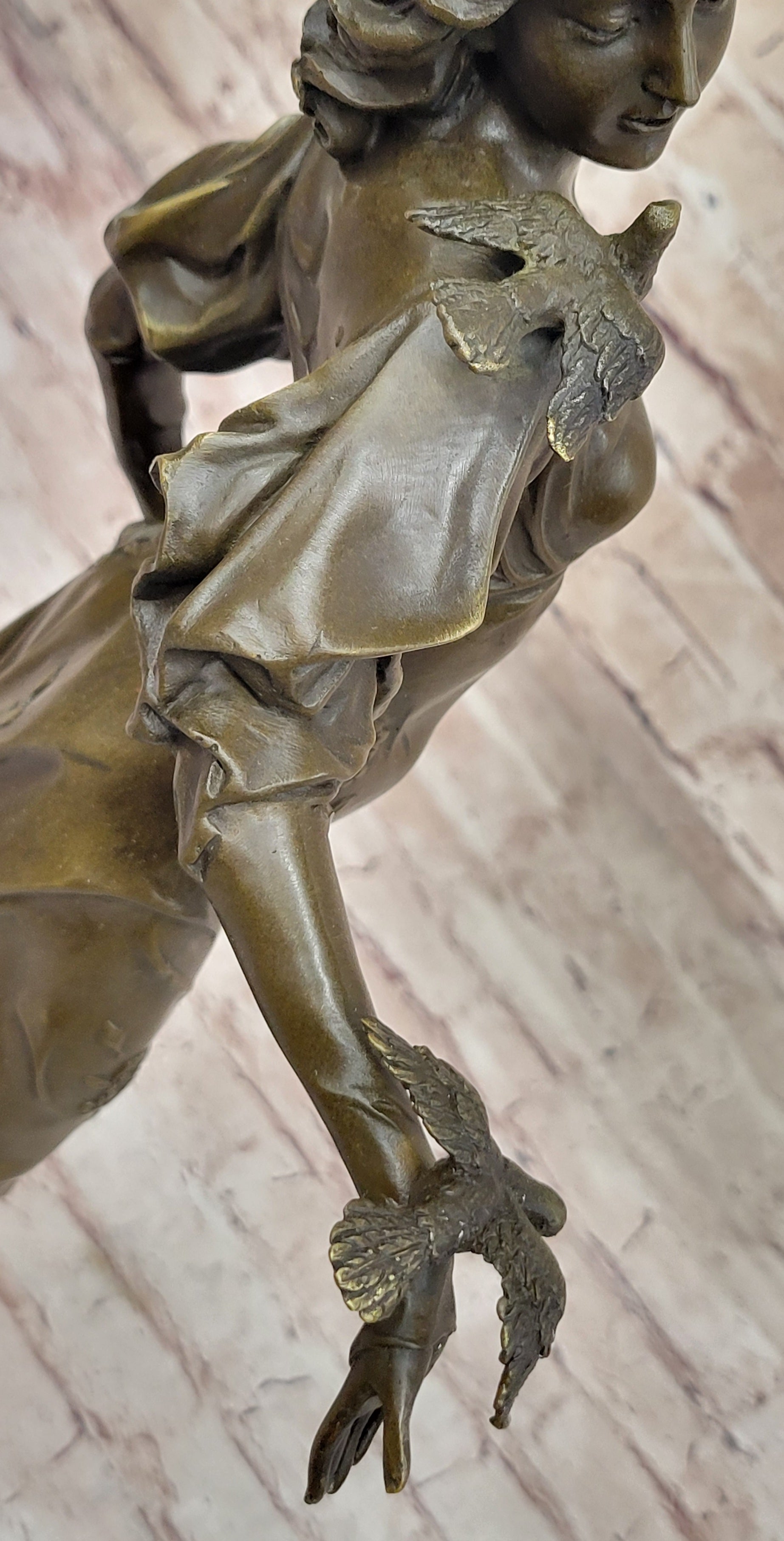 Attributed to the renowned artist Honore Ple, the sculpture exemplifies his mastery of form and expression, showcasing the delicate features of the female figure and the graceful contours of the bird. The bronze is mounted on its original marble pedestal base, adding to its elegance and authenticity.