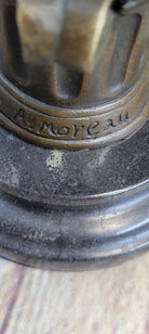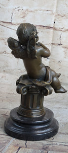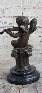 Discover the ethereal beauty encapsulated in this bronze cherub statue, portraying an endearing celestial figure engrossed in violin melodies. Part of a cherished series of cherub musicians, this statue seamlessly blends into both interior sanctuaries and outdoor gardens, lending an aura of enchantment. The cherub's serene visage exudes an air of blissful contentment as it coaxes harmonious tunes from the violin's strings. Set upon a marble pedestal, this figurine exquisitely marries timeless elegance with artistic craftsmanship. An ideal gift for celestial admirers, this 100% handmade bronze sculpture stands as a testament to the artisan's dedication, crafted using the revered lost-wax casting technique. Enhanced with a rich brown patina finish, the sculpture bears the signature A. Moreau, a mark of its exceptional heritage.Bronze Dimensions with Marble Base: Height 8" X Width 5"