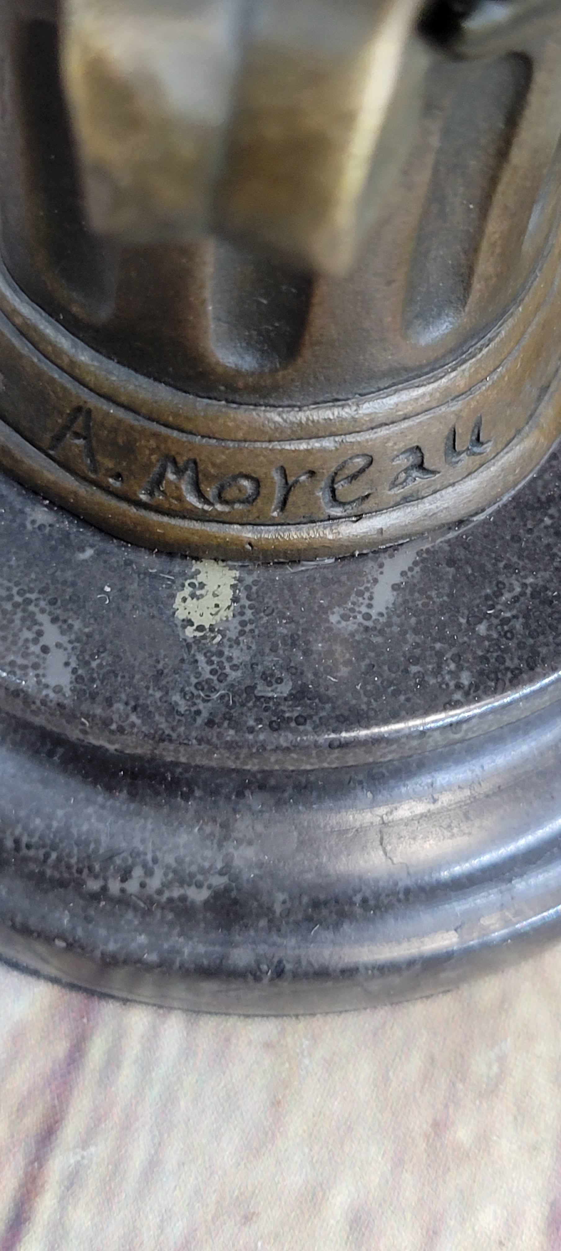 Envelop yourself in the enchanting world of this bronze cherub statue, depicting a captivating scene of a cherub engrossed in playing the violin. Part of a harmonious series of cherub musicians, this piece seamlessly transitions from indoor decor to an outdoor garden haven. The cherub's serene countenance reflects the joy of creating music, as the melodious notes of the violin dance through the air. Perched atop a marble stand, the sculpture unites timeless elegance with artistic prowess. A perfect gift for those enchanted by celestial wonders, this bronze masterpiece stands as a testament to the artist's commitment, captured through the ancient technique of lost-wax casting. Finished with a warm brown patina, the sculpture bears the signature A. Moreau, epitomizing its legacy of artistic brilliance.