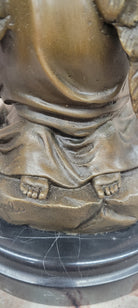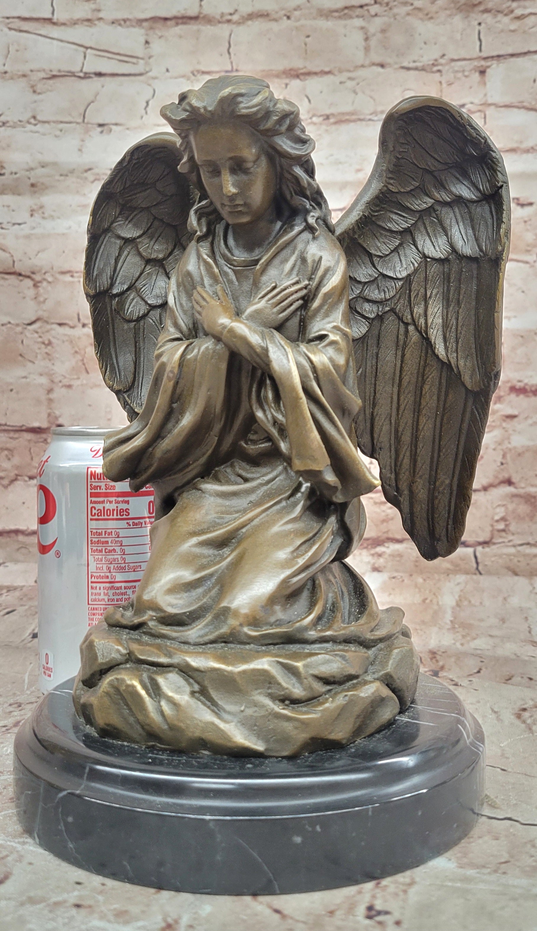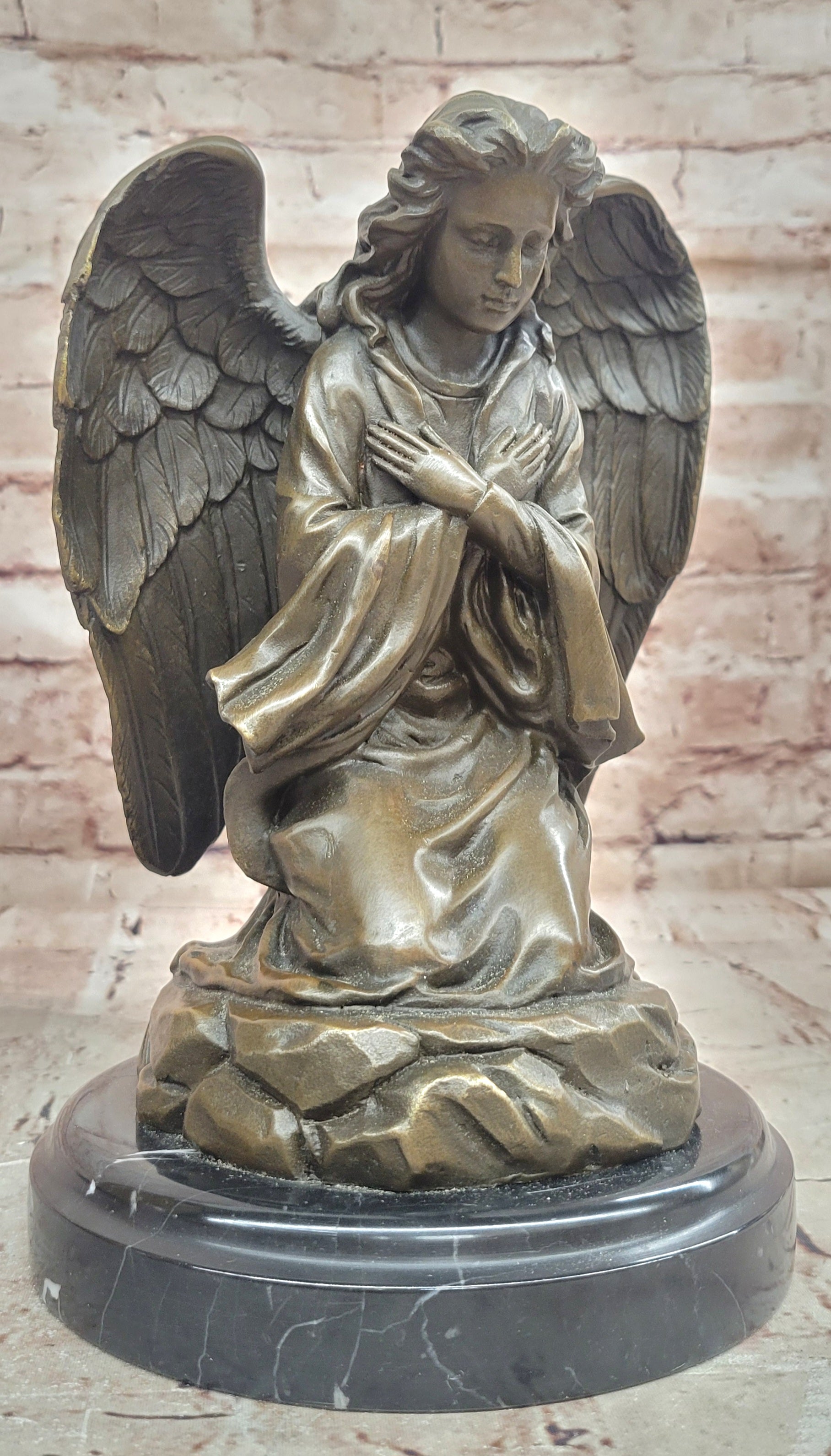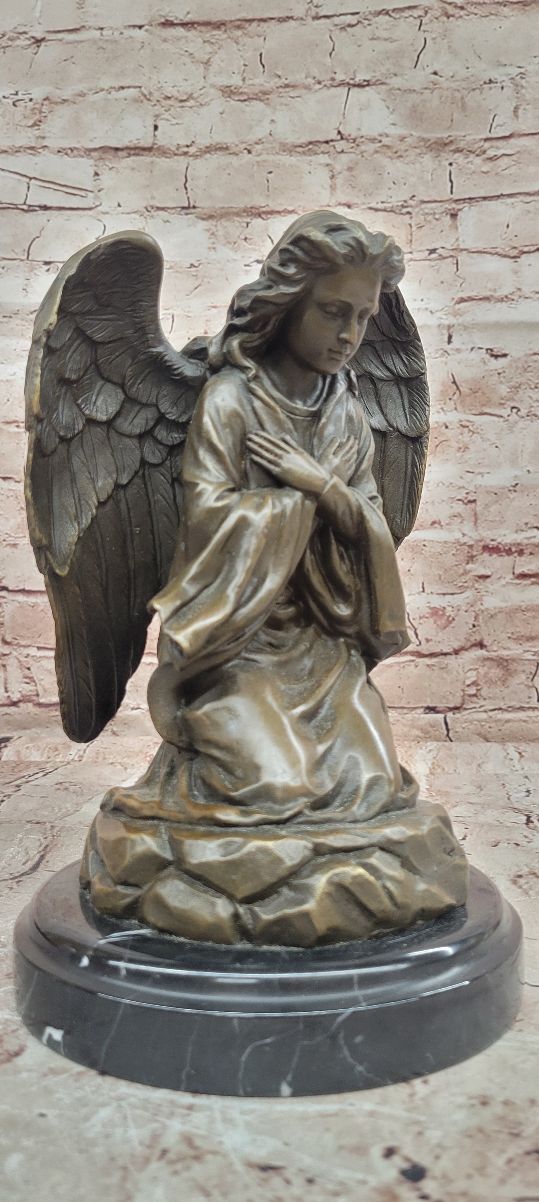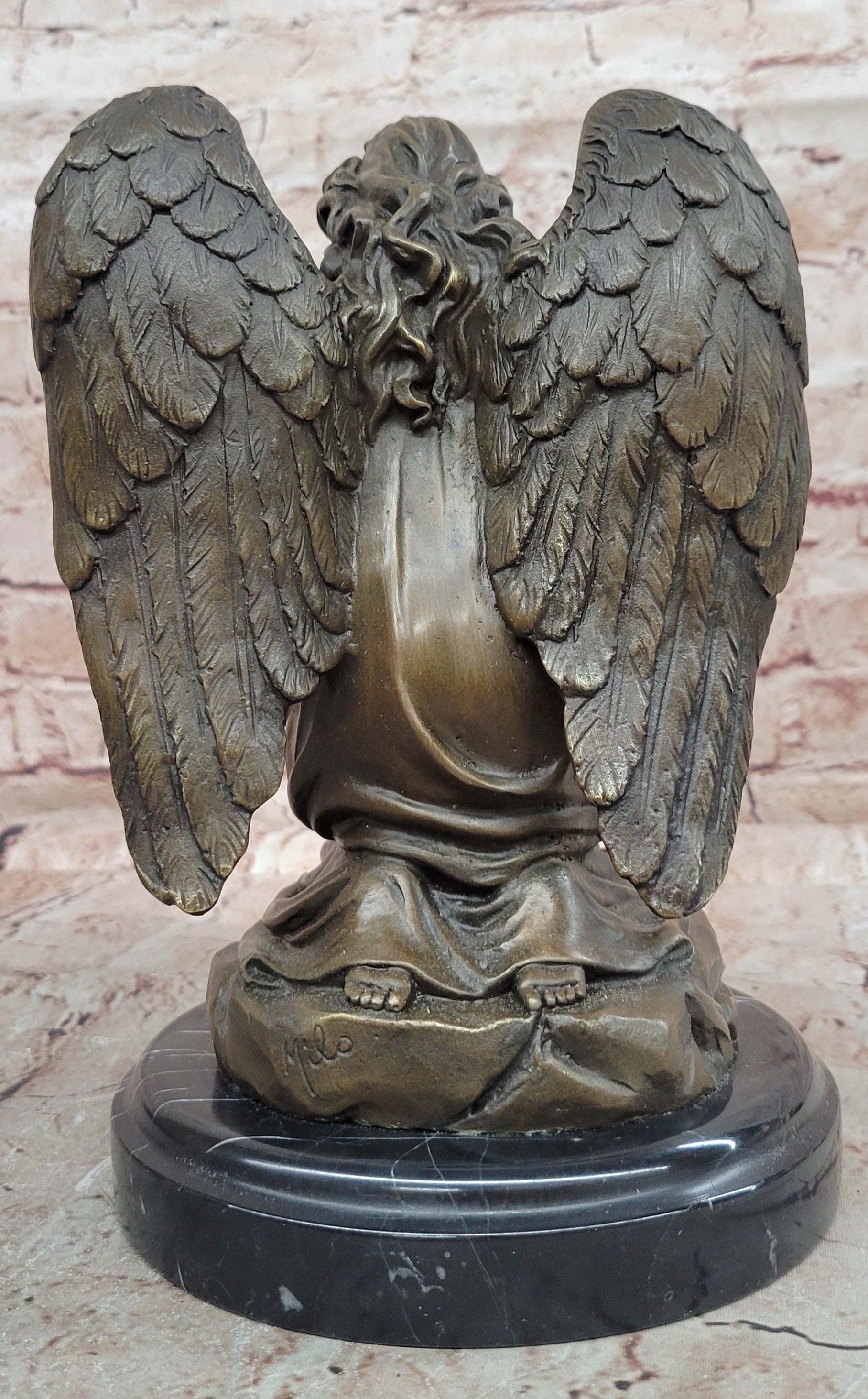 Kneeling Angel with Folded Wings Bronze Sculpture on Marble Base