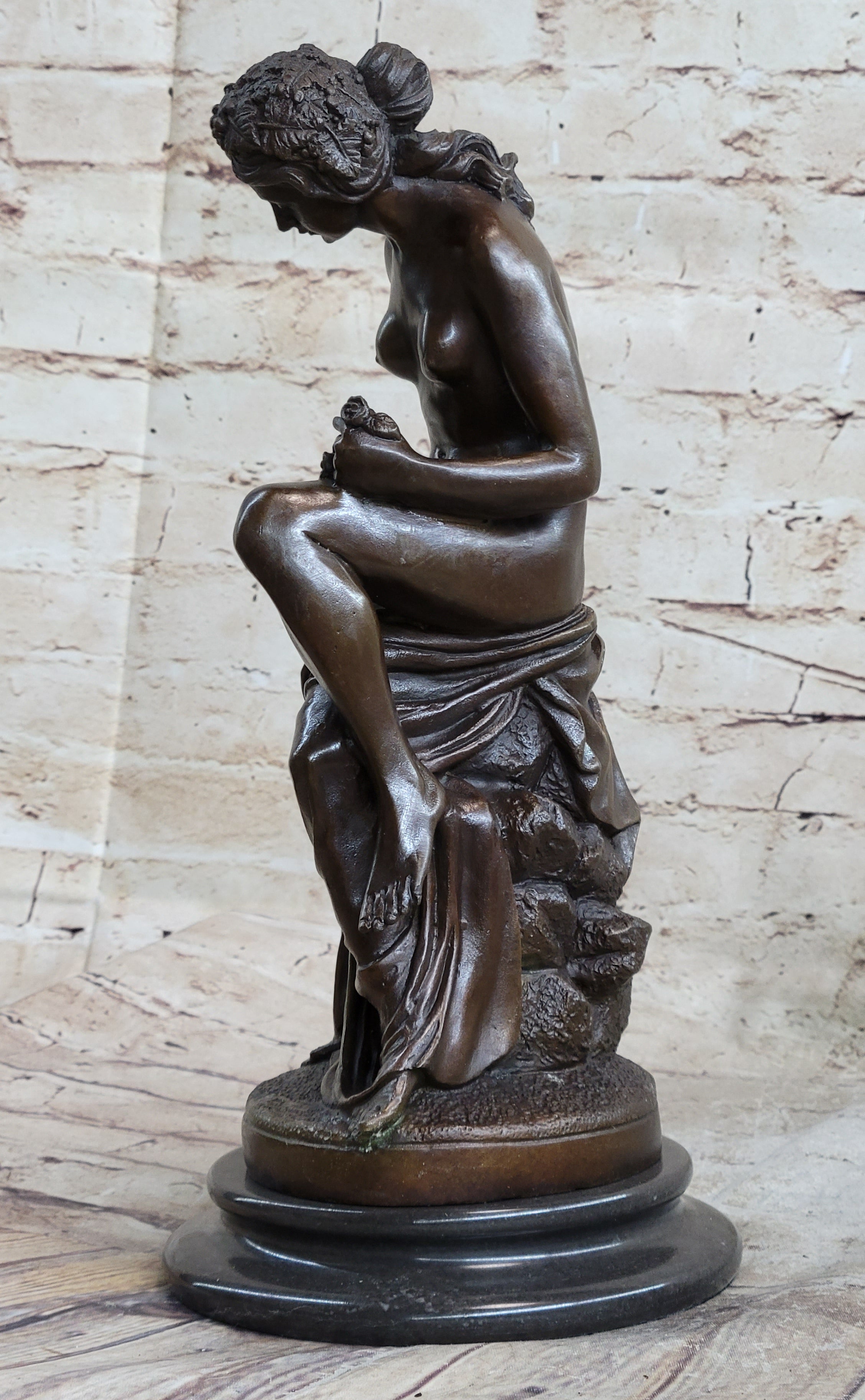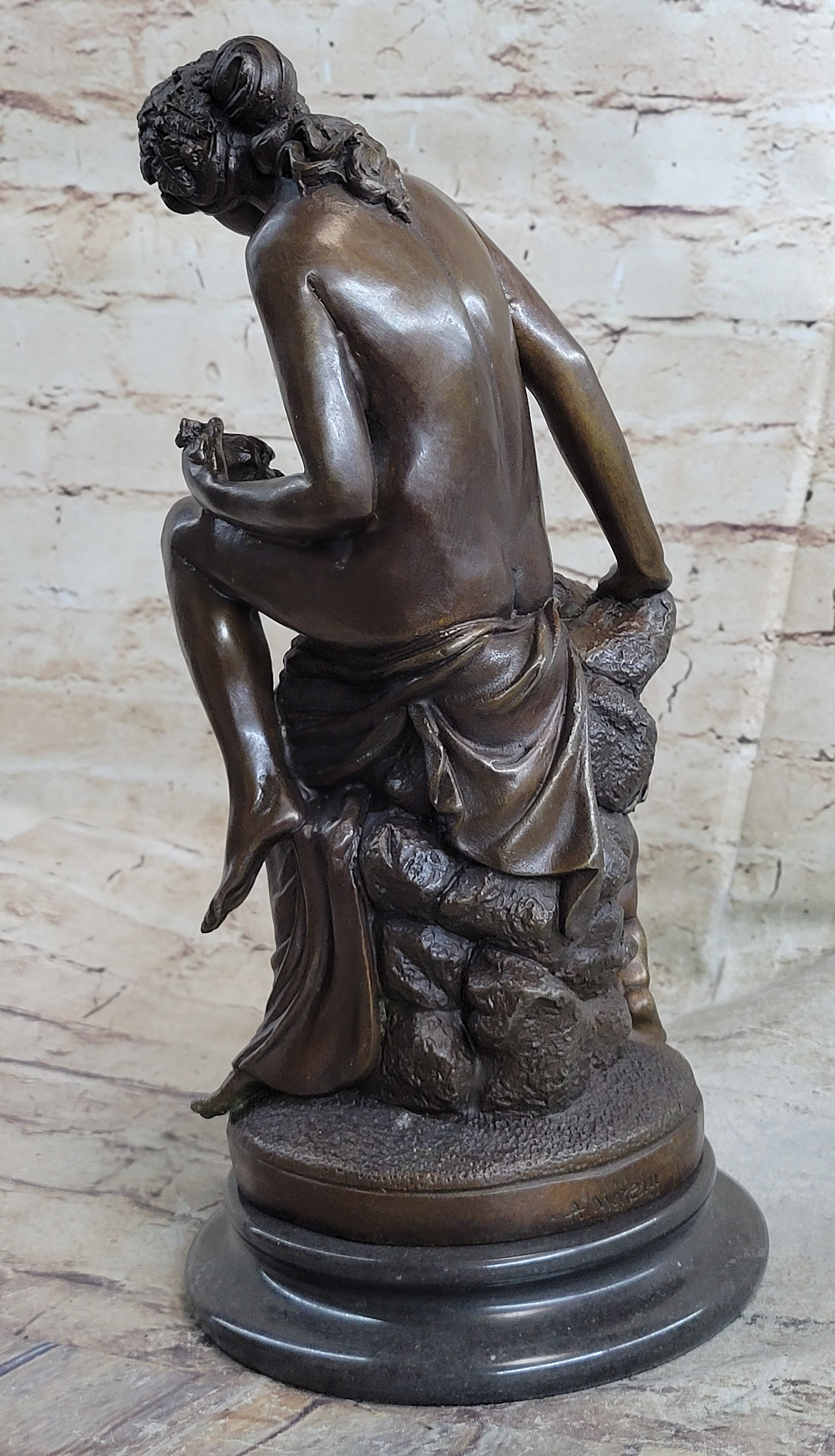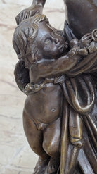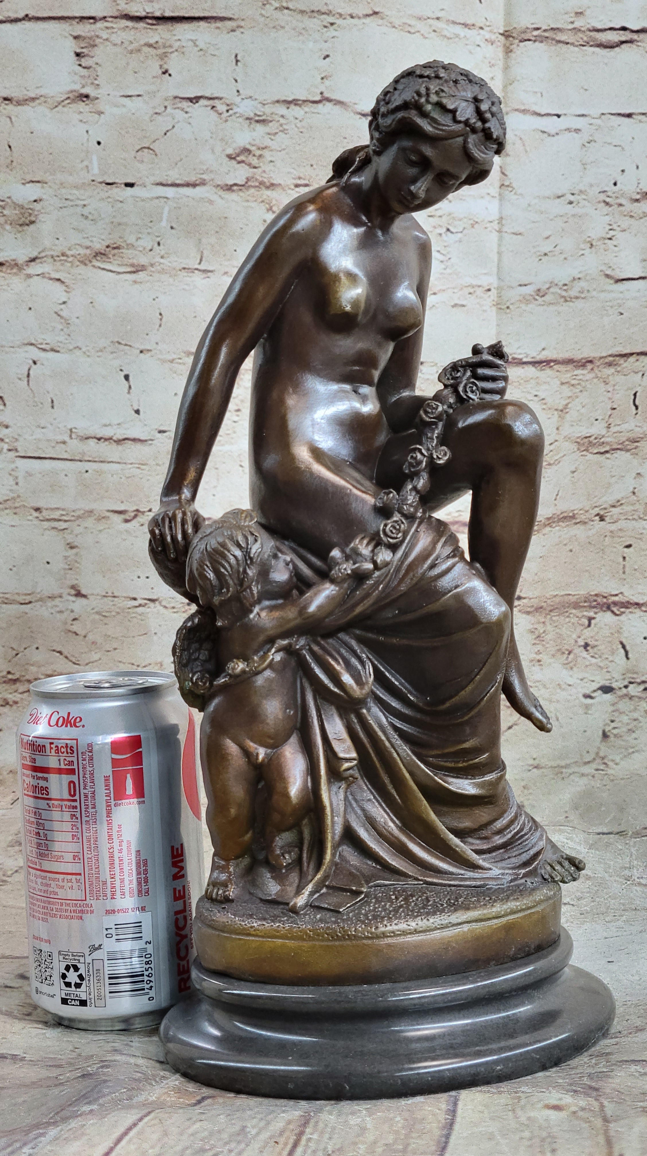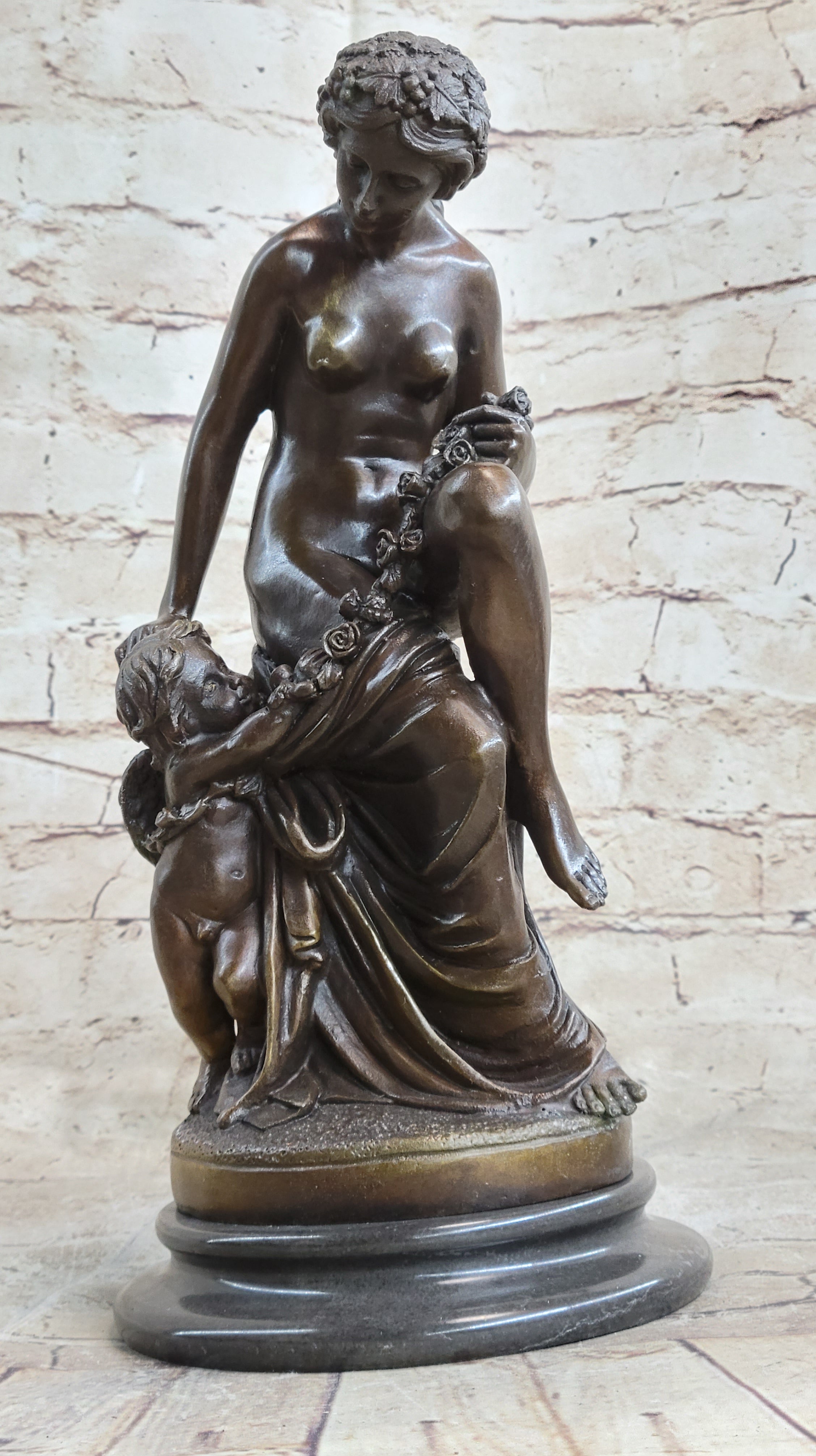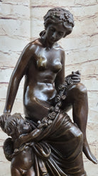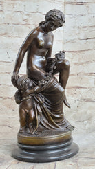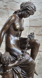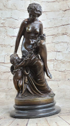 Nude Nymph Girl w/ Cherub Boy Hot Cast Bronze Statue Sculpture on Marble Base