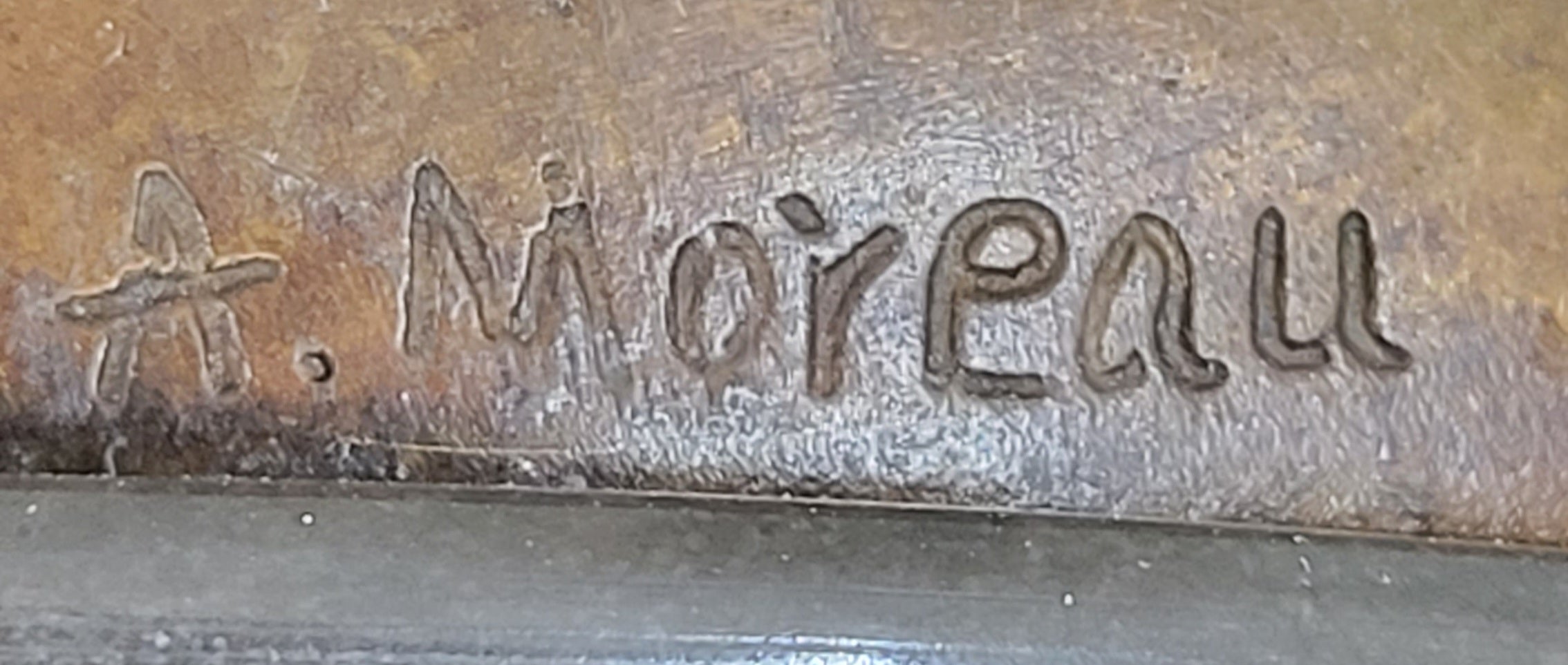 The beautiful young woman rests near a meadow with her baby angel at her side. He stands at her side holding onto her thigh. He adores her. She stares back at him lovingly. On her lap is a long stem with fully blossomed roses. Fruits and leaves decorate her hair. This lovely sculpture was crafted using the lost wax method. It rests on a black marble base and is signed A. Moreau.Bronze Dimensions with Marble Base: Height 13" x Width 6"