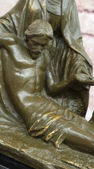 This powerful bronze sculpture captures a deeply emotional and spiritual moment—Our Lady of Sorrows mourning over the body of Jesus Christ. Rendered with solemn grace, the Virgin Mary cradles Jesus with profound tenderness, while a small angel gently holds His hand in a touching act of reverence and compassion. The figures are sculpted with careful attention to expression and form, evoking themes of sacrifice, devotion, and divine sorrow.